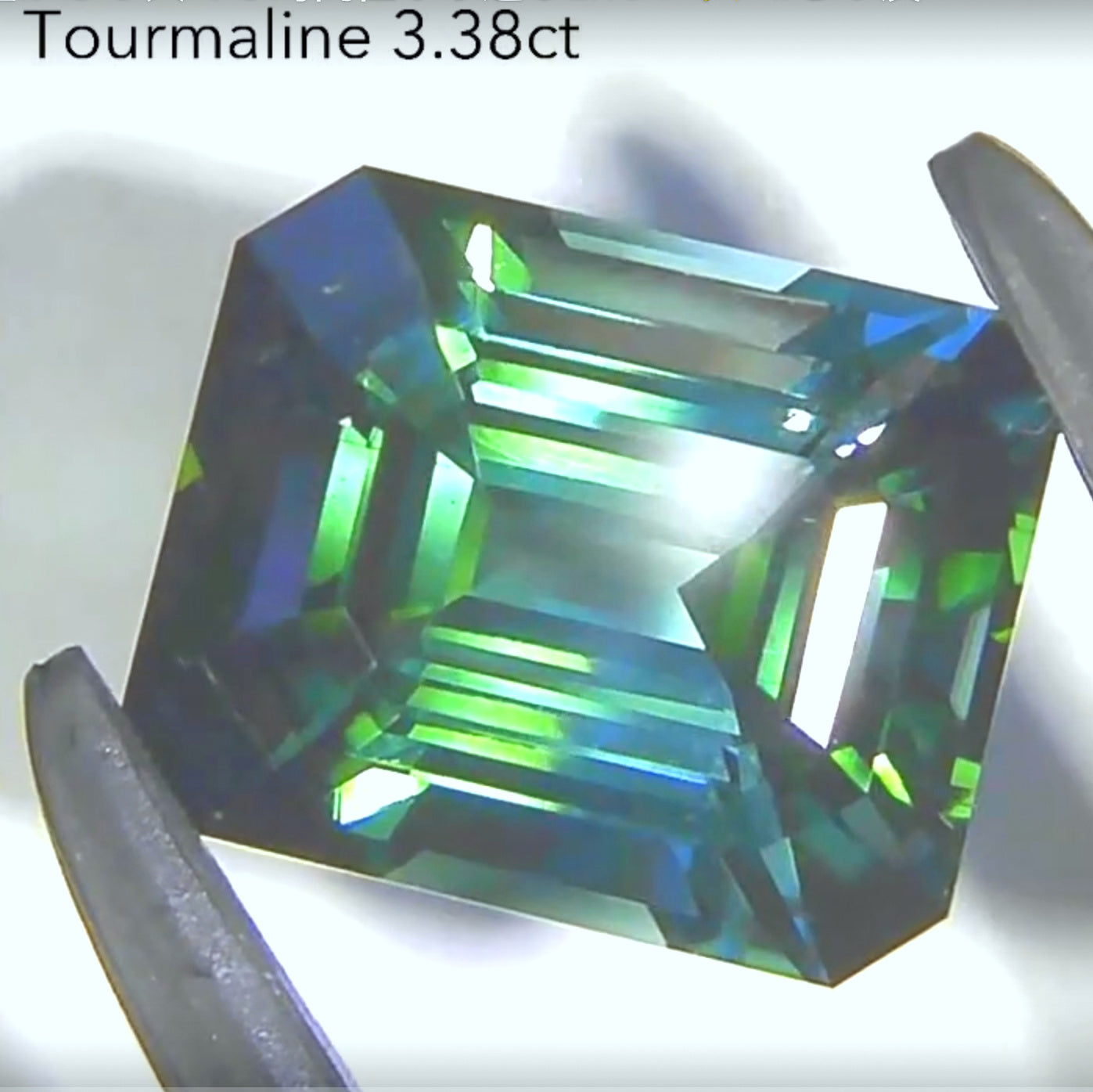 美色「ブルーグリーン」がオクタゴンカットの中を駆け巡り、見る角度によって何とも魅力的な輝きを楽しめます。