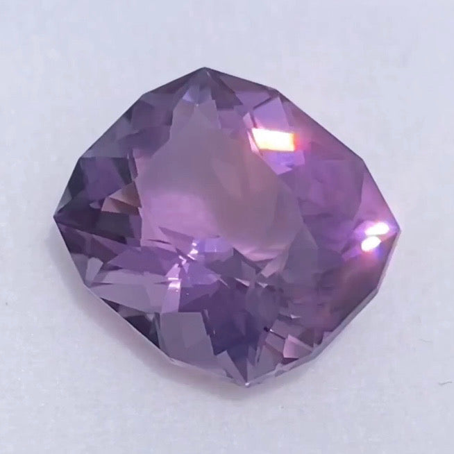 イイ感じの色むら感があり、パープルとピンクが絶妙に混ざり合う美しいカラーのアメジストで、GemTreeJapanメインカッターピアッちゃんが、シャープで細やかなカットのファンシークッションに仕上げてくれました。