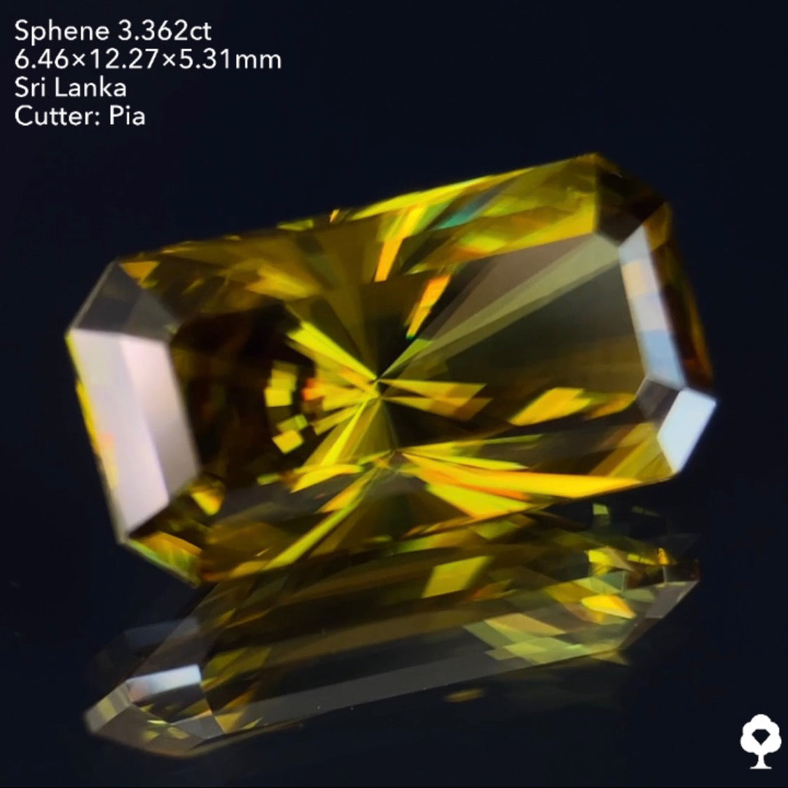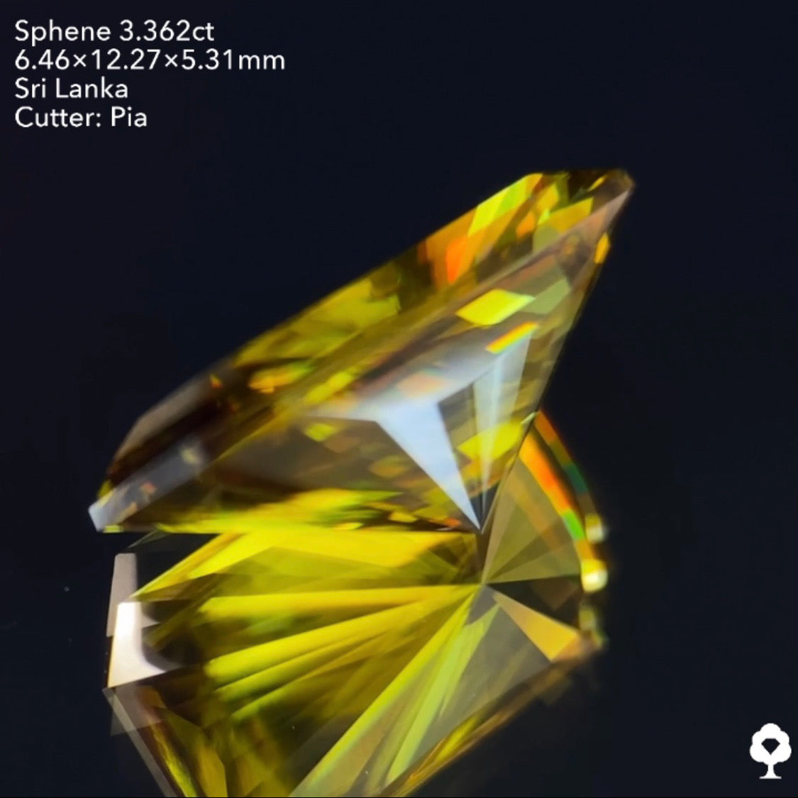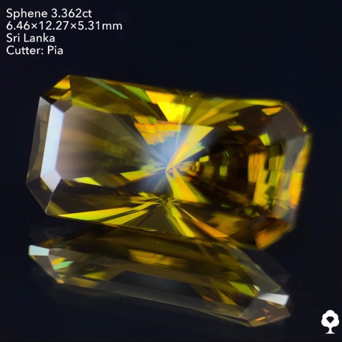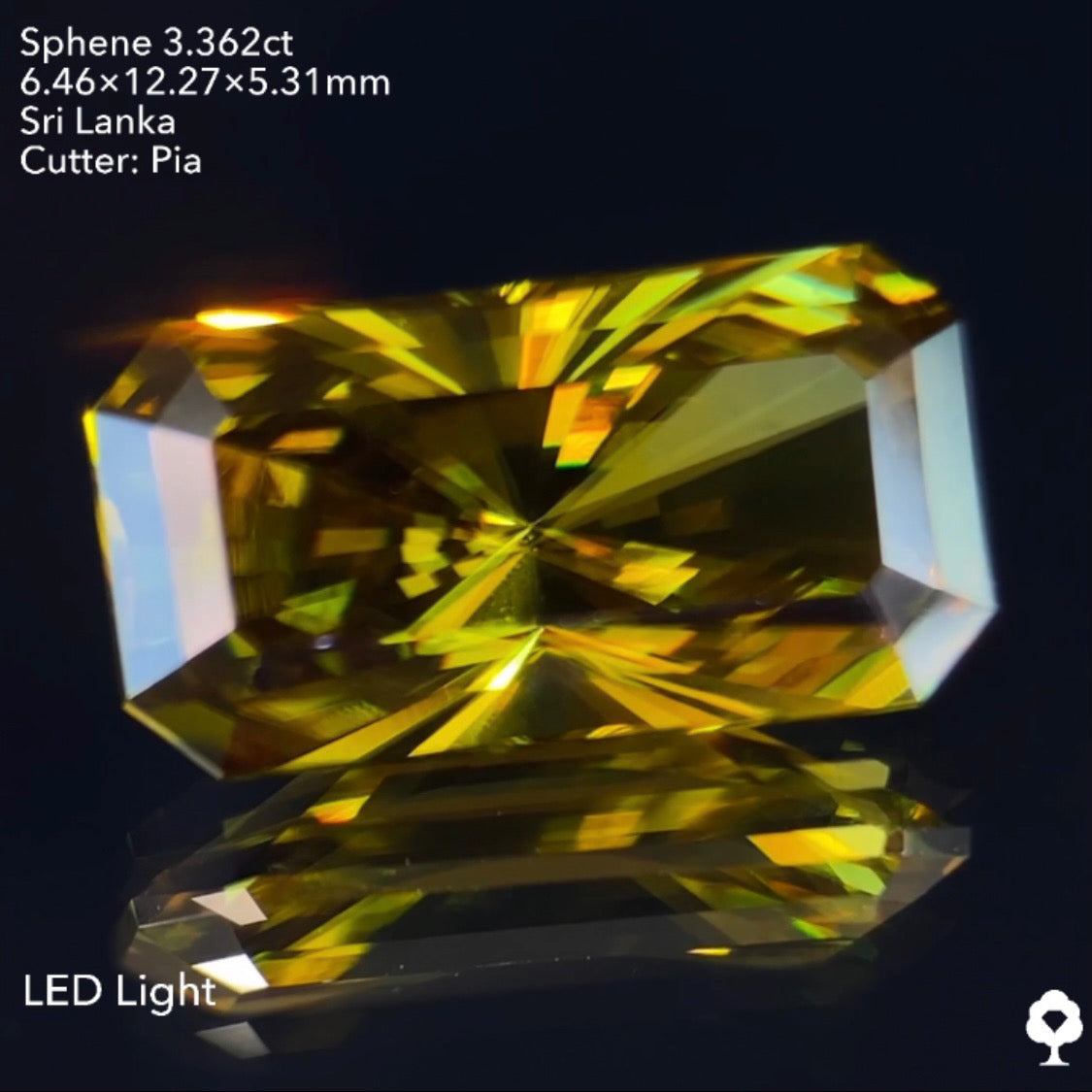 オリーブグリーンから鋭い煌めきを放つピアッちゃん渾身の窓あり放射線パビリオン★スフェーン3.362ct ピアッちゃん作品