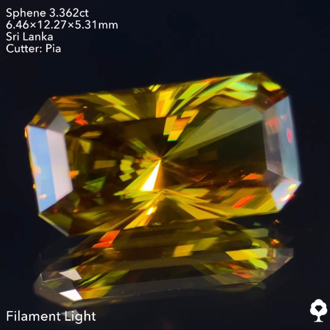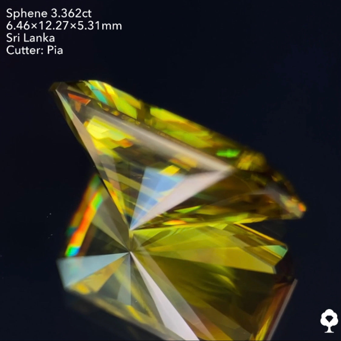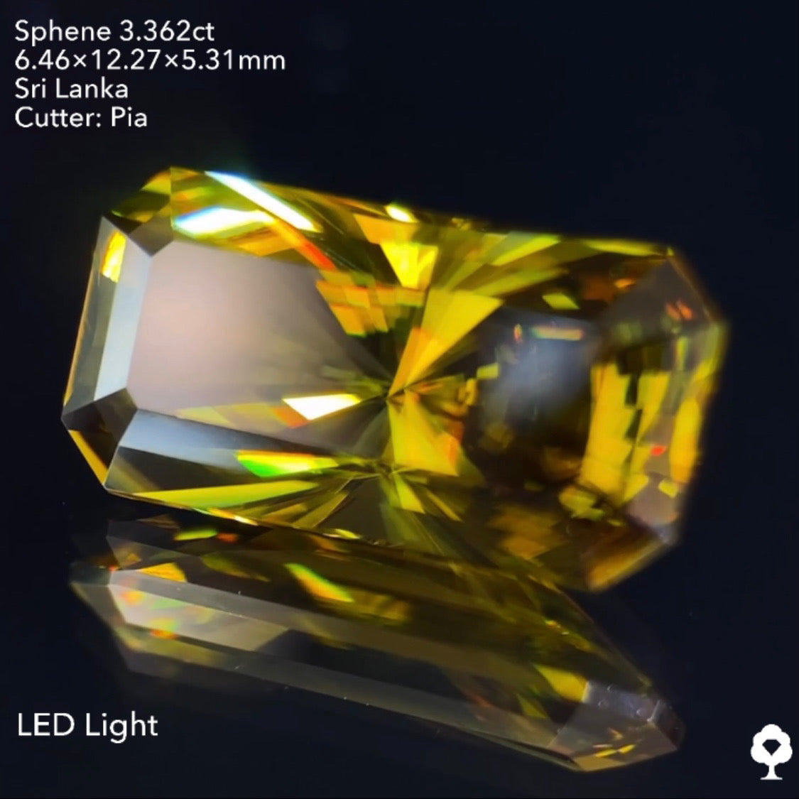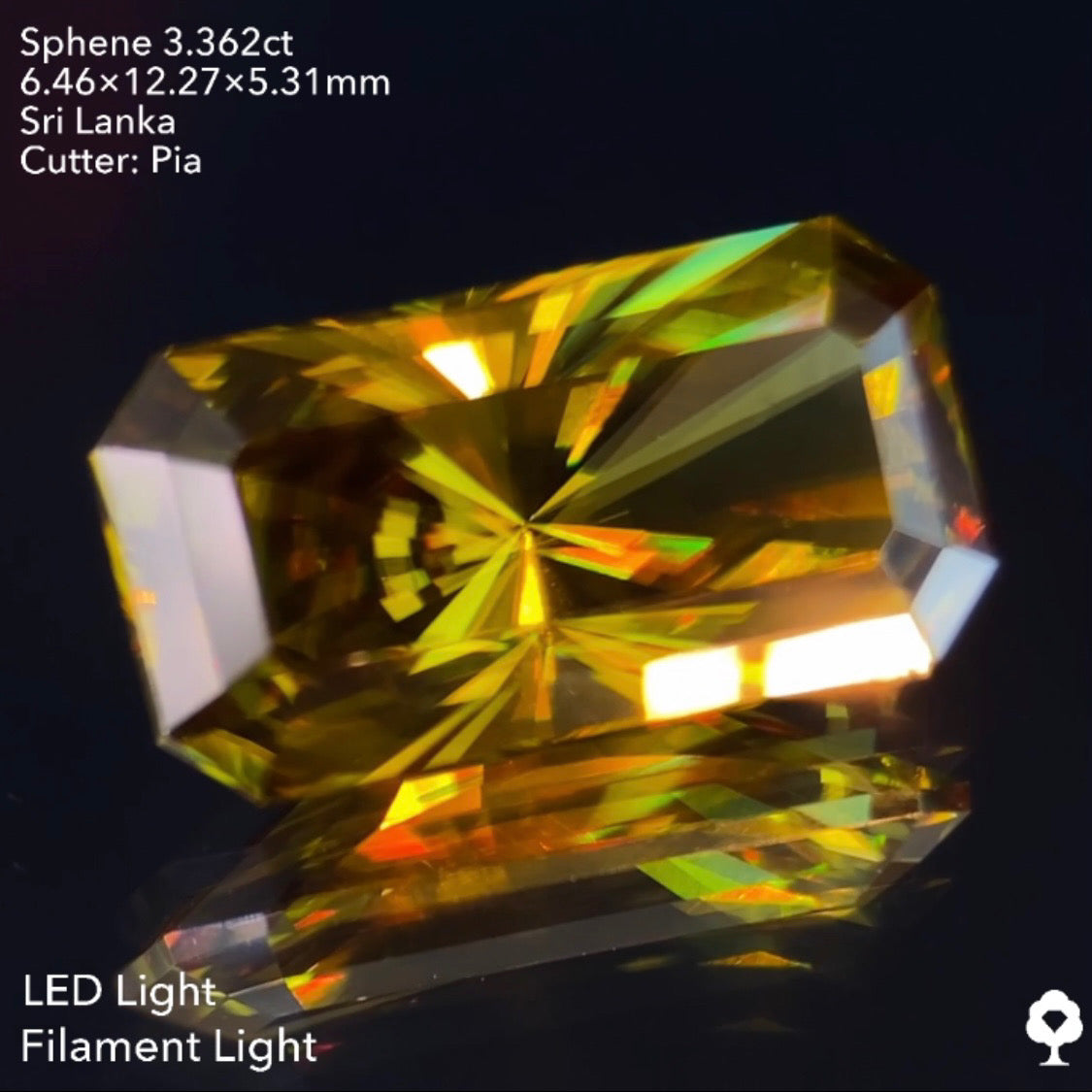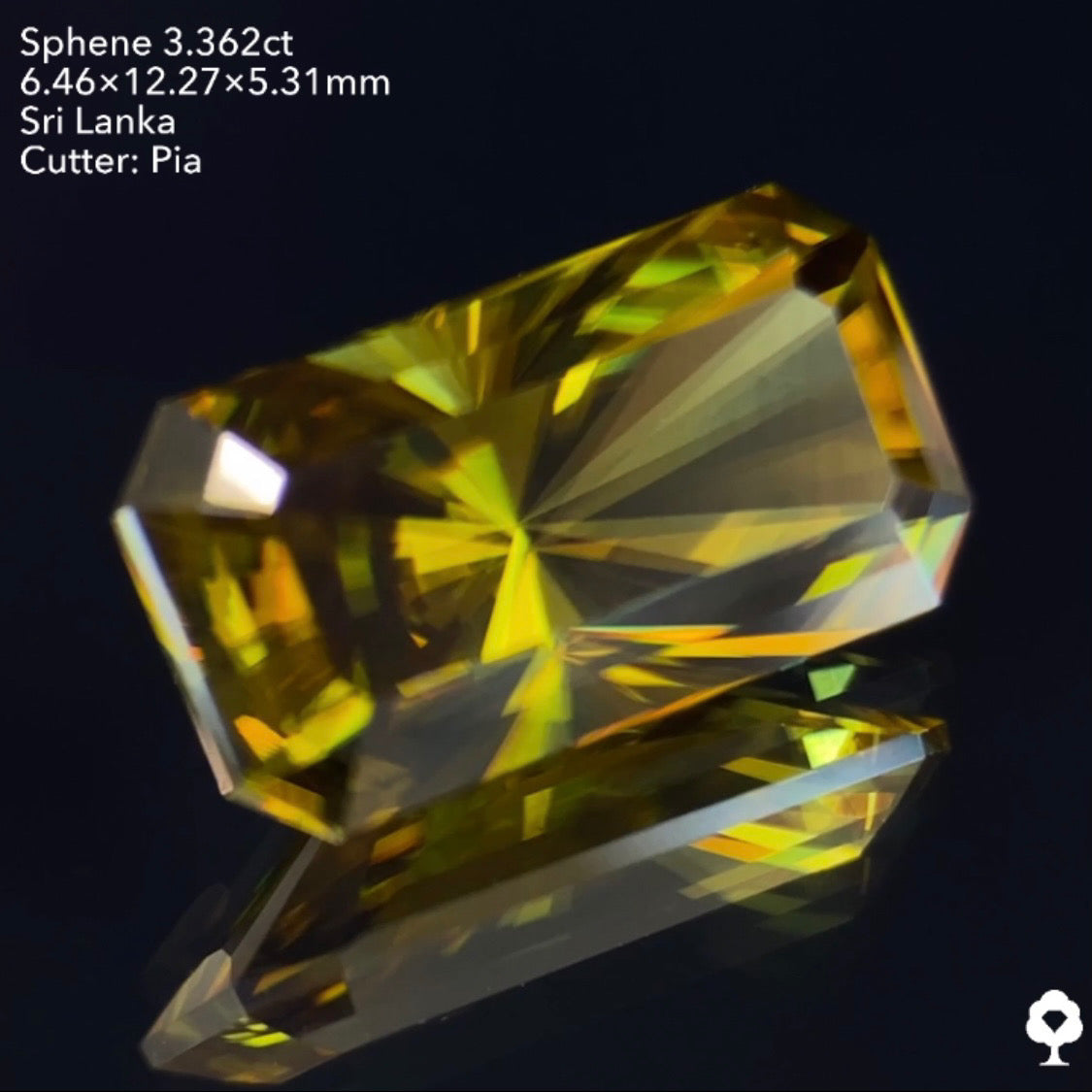 オリーブグリーンから鋭い煌めきを放つピアッちゃん渾身の窓あり放射線パビリオン★スフェーン3.362ct ピアッちゃん作品