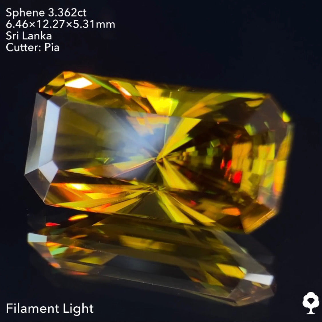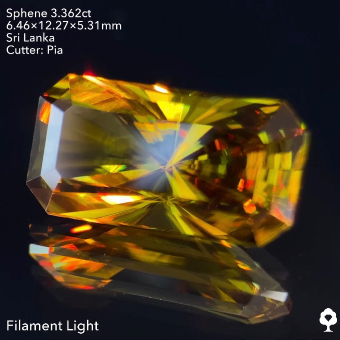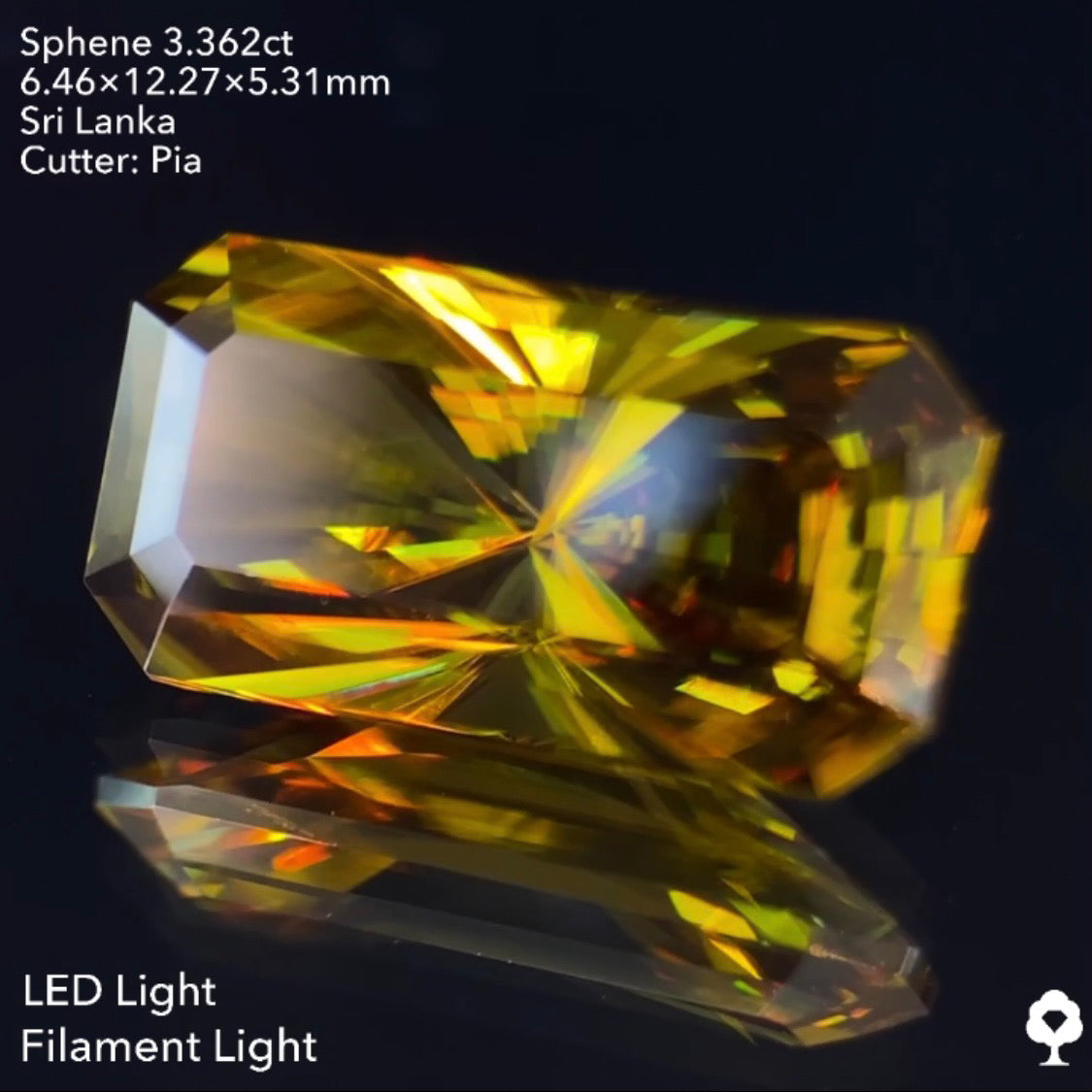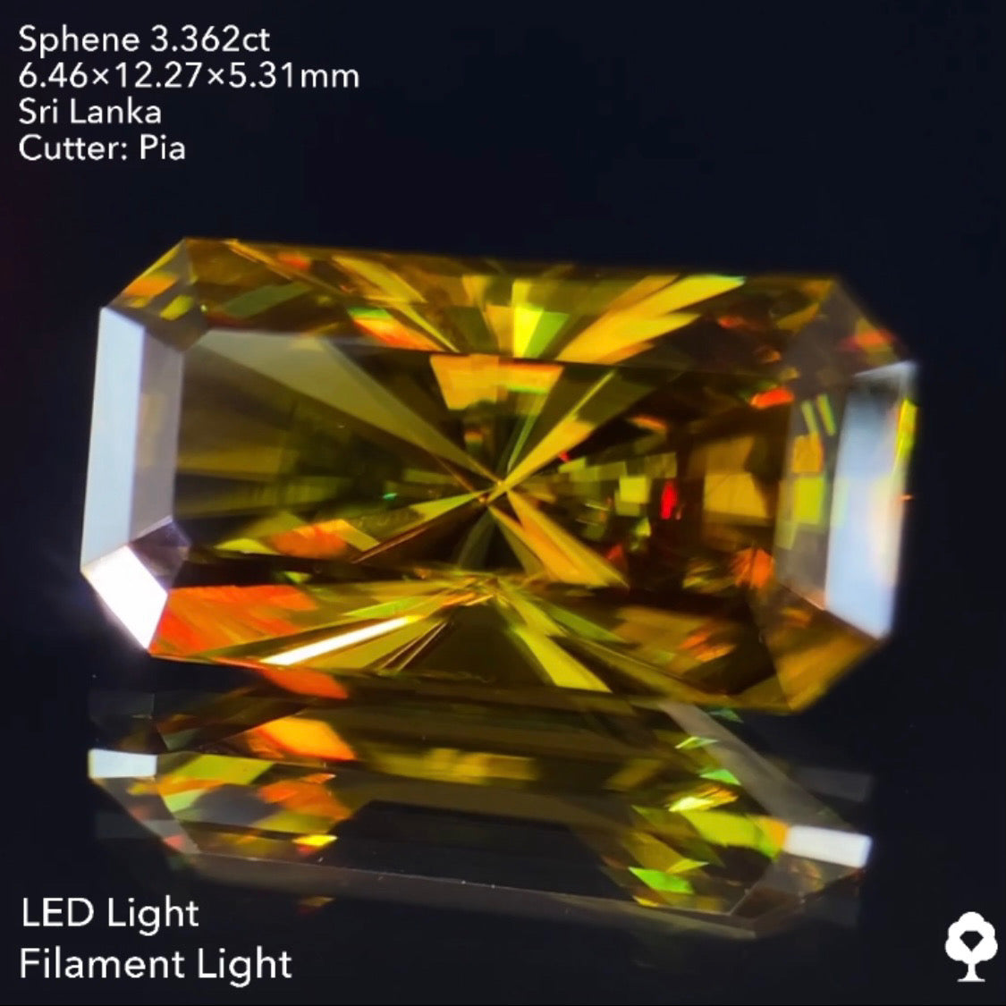 オリーブグリーンから鋭い煌めきを放つピアッちゃん渾身の窓あり放射線パビリオン★スフェーン3.362ct ピアッちゃん作品