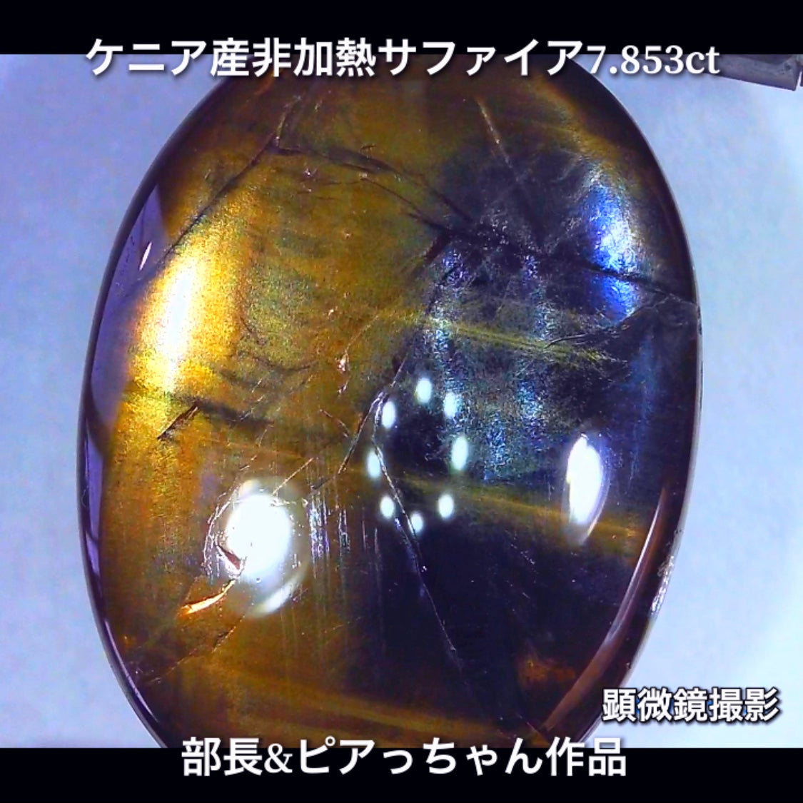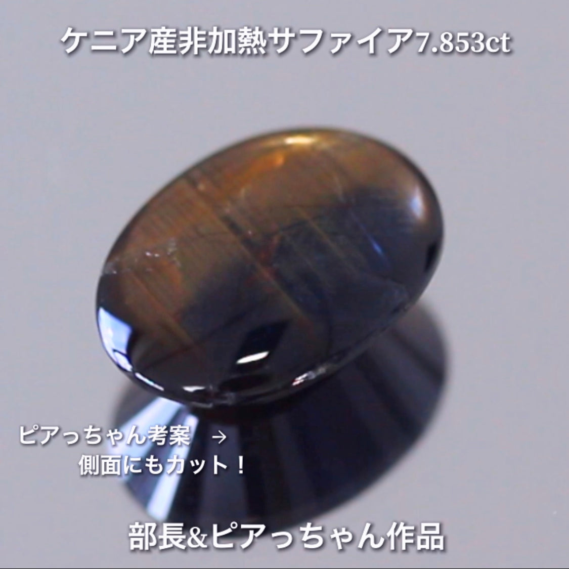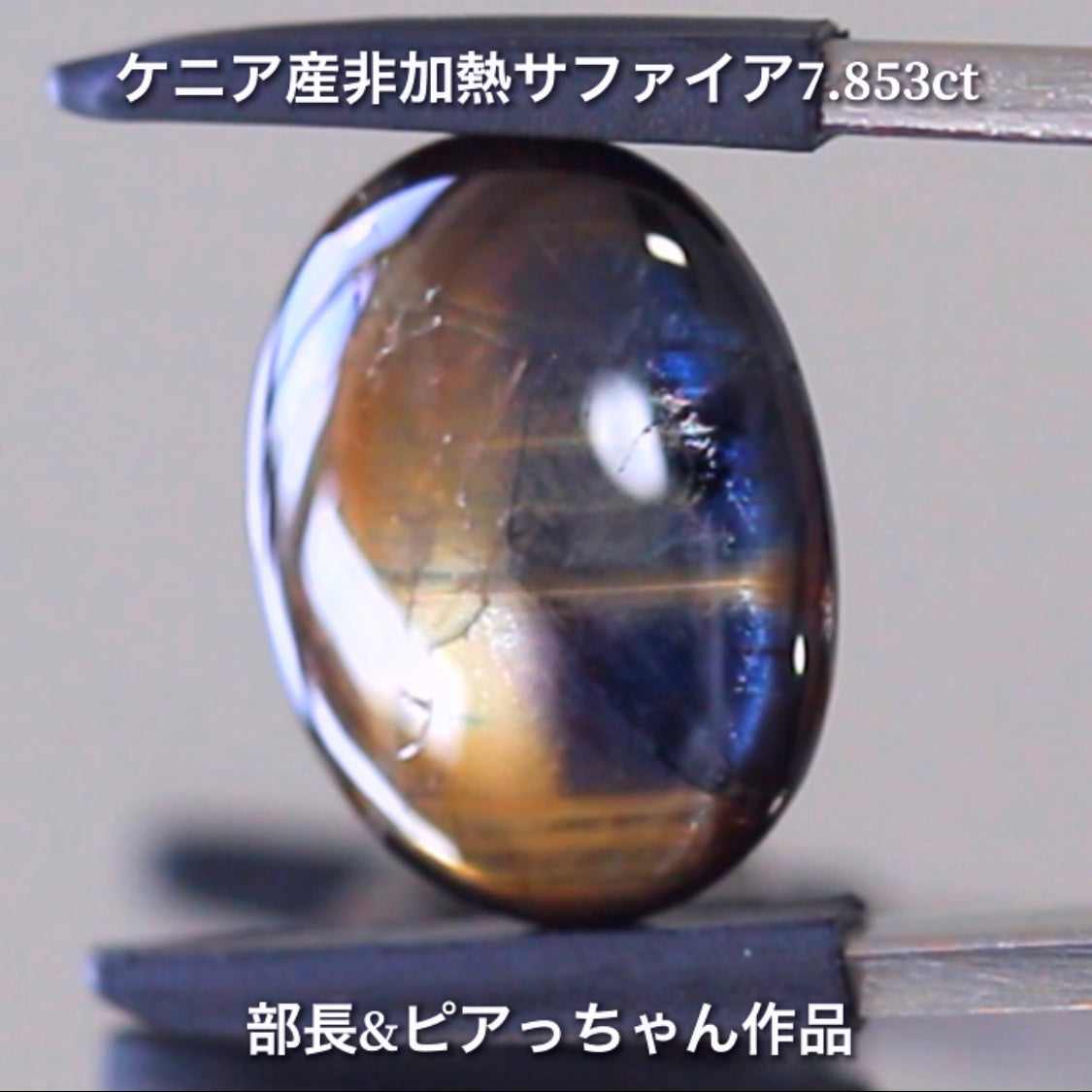 メタリックな美色ブルーと、白光りするようなゴールドシーンとのバイカラーが、なんとも魅力で美しいケニア産非加熱サファイア7.853ct。