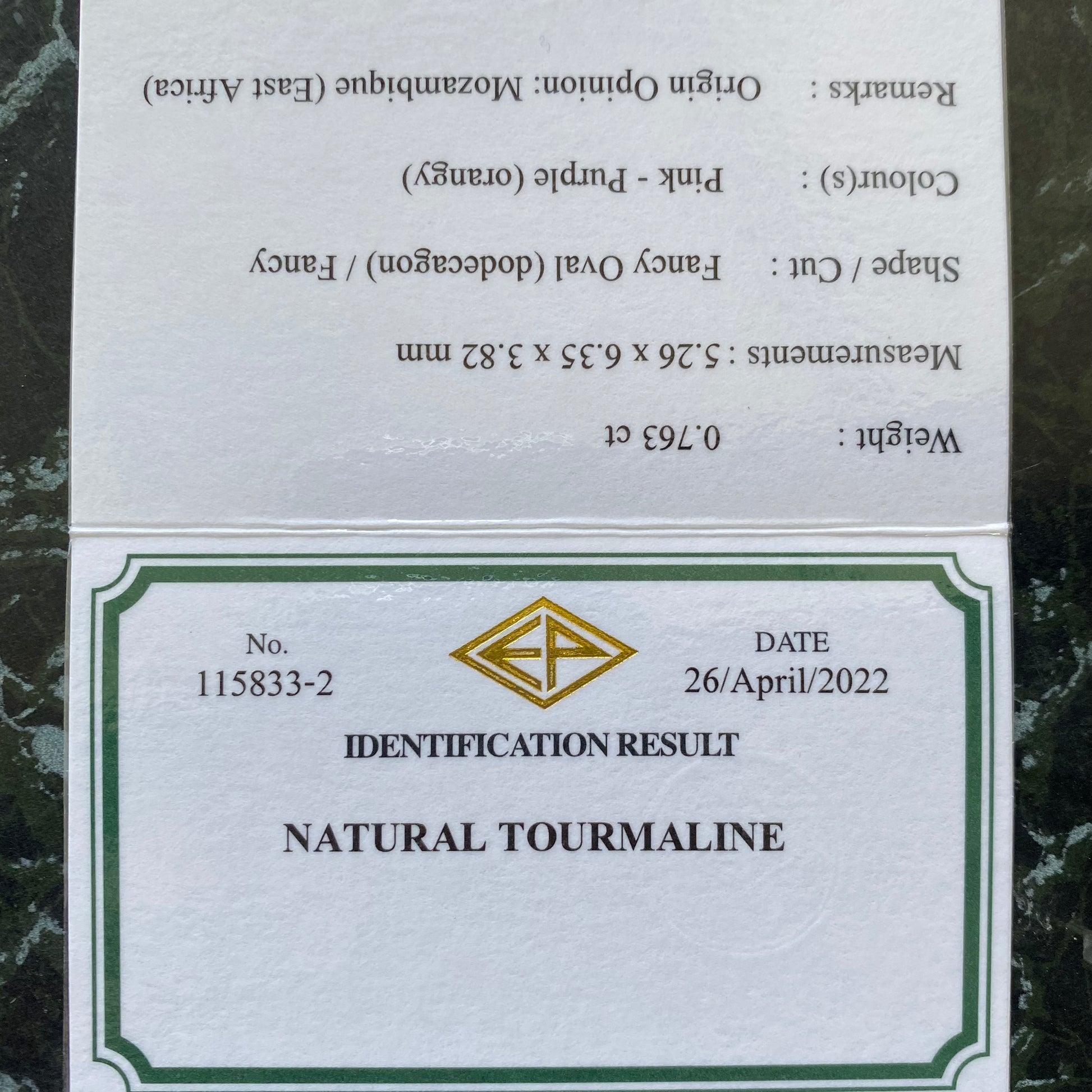 オレンジを含んだコーラルピンク系の美色で、角度によってほんのりとパープルも感じる多色性も持ってます。