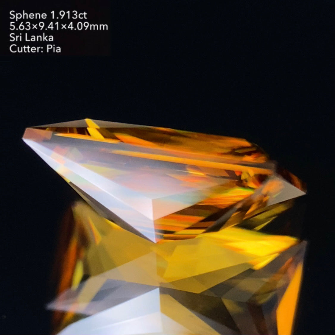 コチラの作品はここのところご紹介が続いているスリランカ産のスフェーンで、一般的にはそんなにパッとしないイメージもあるようですが、肉眼で大きく目立ったインクルージョンもなく、やや深めのゴールドカラーから、ピアッちゃんお得意のパビリオン側にリボンが見えるカットによって、バシッと明るく鮮やかで強烈な輝きを放ちます。