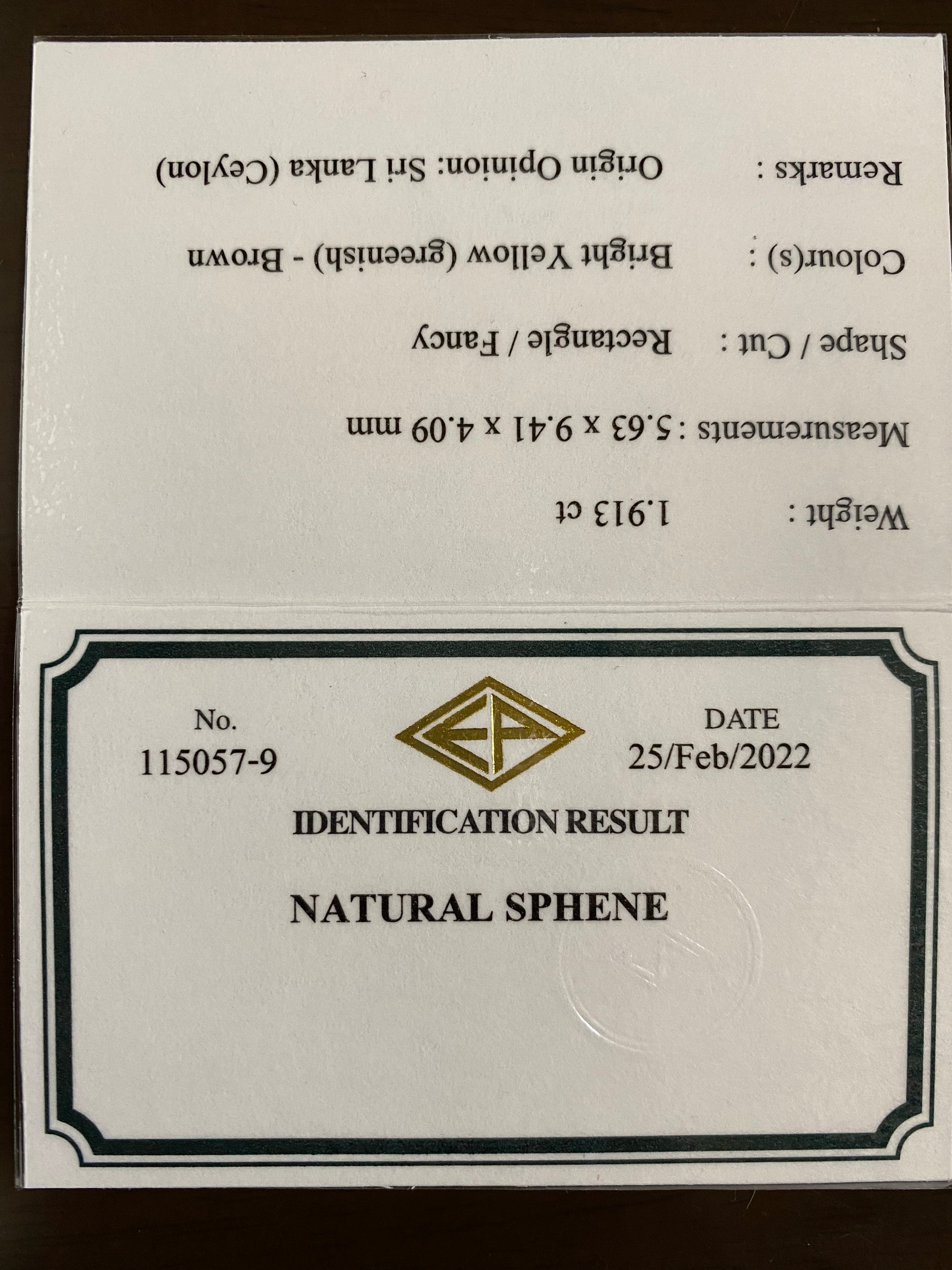 角度によって左右の半分側だけ強烈に光ることがあり、バイカラーのように思えることもある、スフェーンではそこそこレアなバゲットシェイプに仕上げられています。