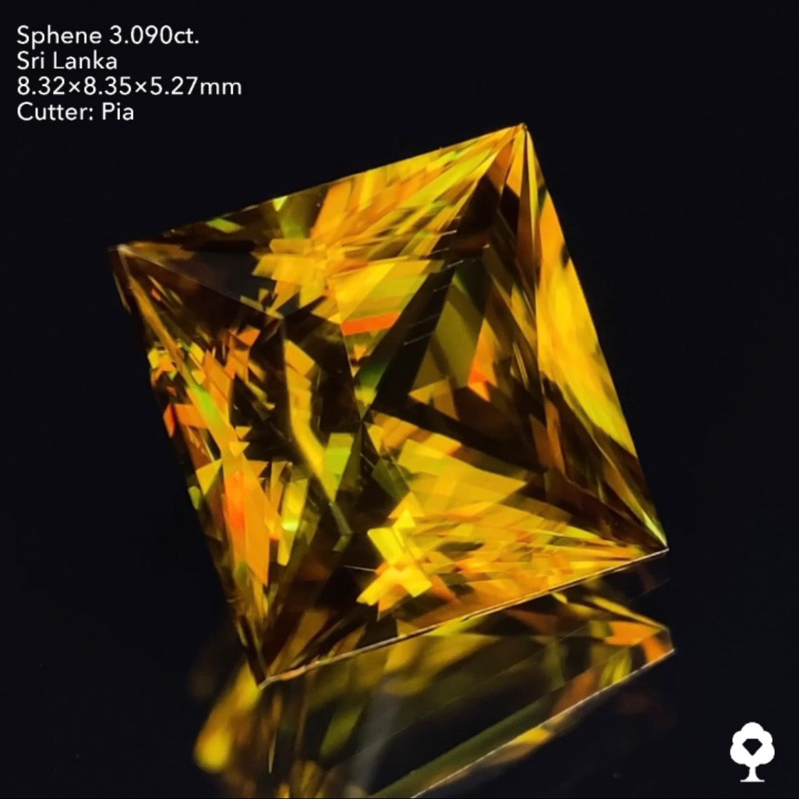特筆するインクルージョンのない美しい結晶がGTJメインカッター【ピアッちゃん】の冴え渡るテリツヤ抜群のカットによって、スフェーンの高い屈折率とダイヤモンドを超える分散度が最大限引き出され、圧巻の輝きとファイアーを放ちます。
