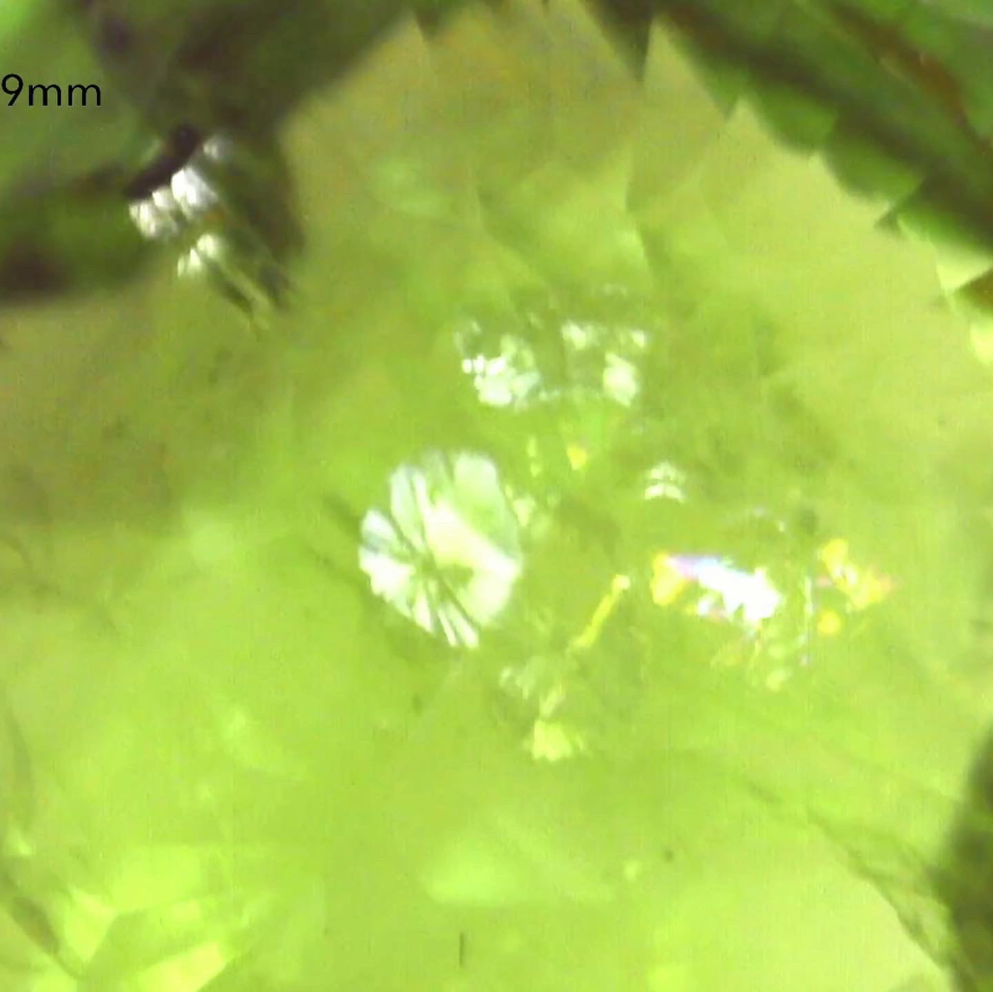 黒い鉱物インクルも散見され、一般的にはペリドットの価値を下げるものと言われていますが、完璧なカットに仕上げられた状態ではそれもペリドットの面白さを感じる価値あるモノに思えます。