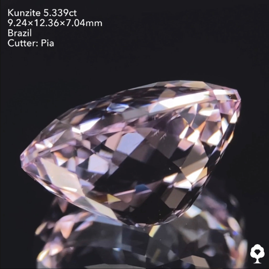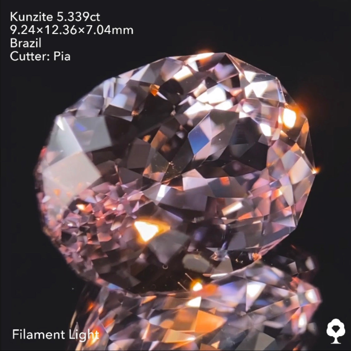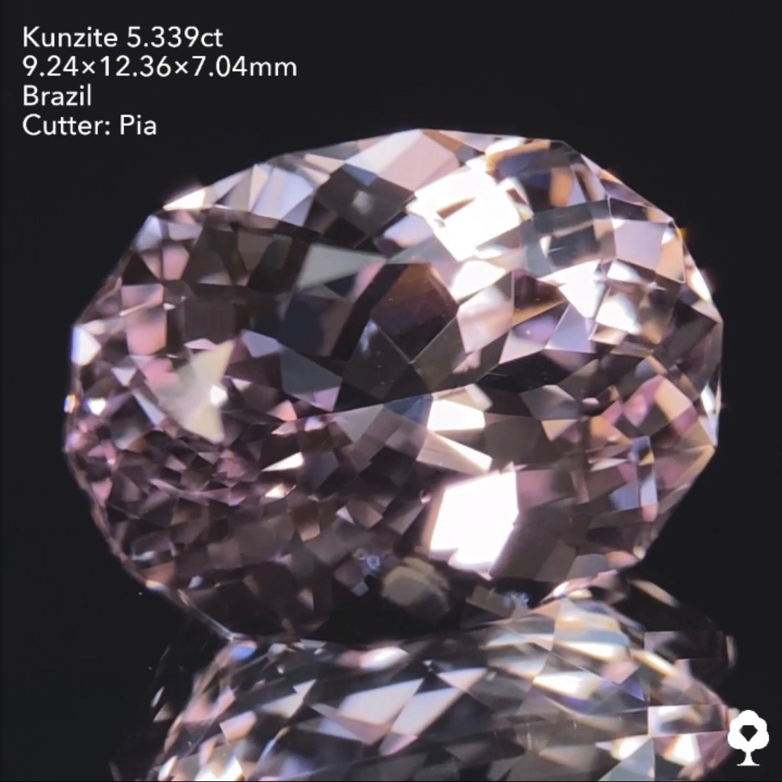 カットが難しい石種の例にも挙げられるクンツァイトを、そんなことを忘れてしまう完成度の、シャープで細やかな煌めきを放つ角のあるファンシーオーバルに仕上げました。