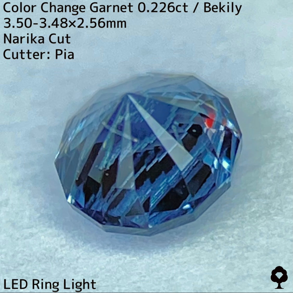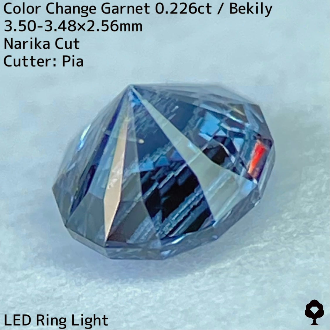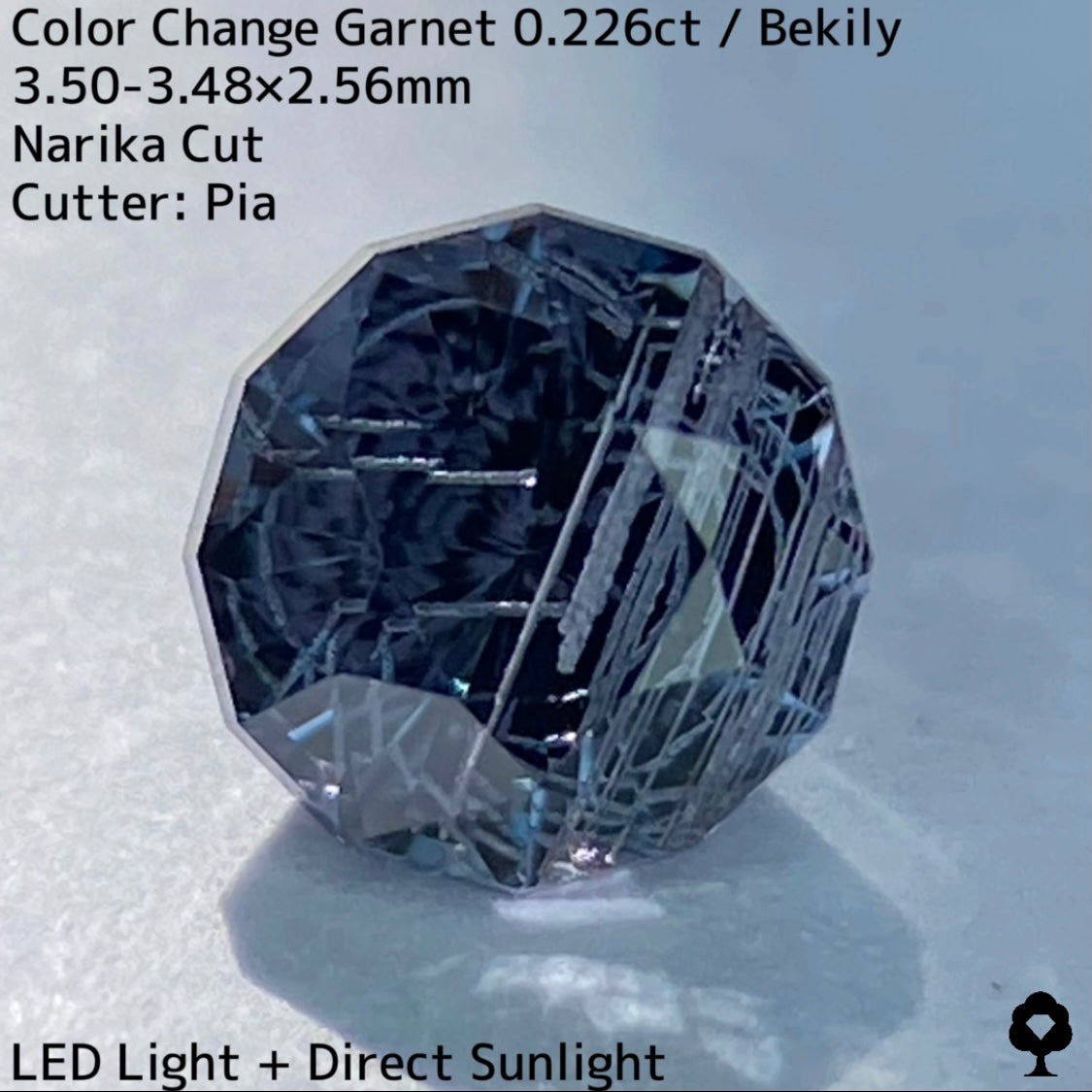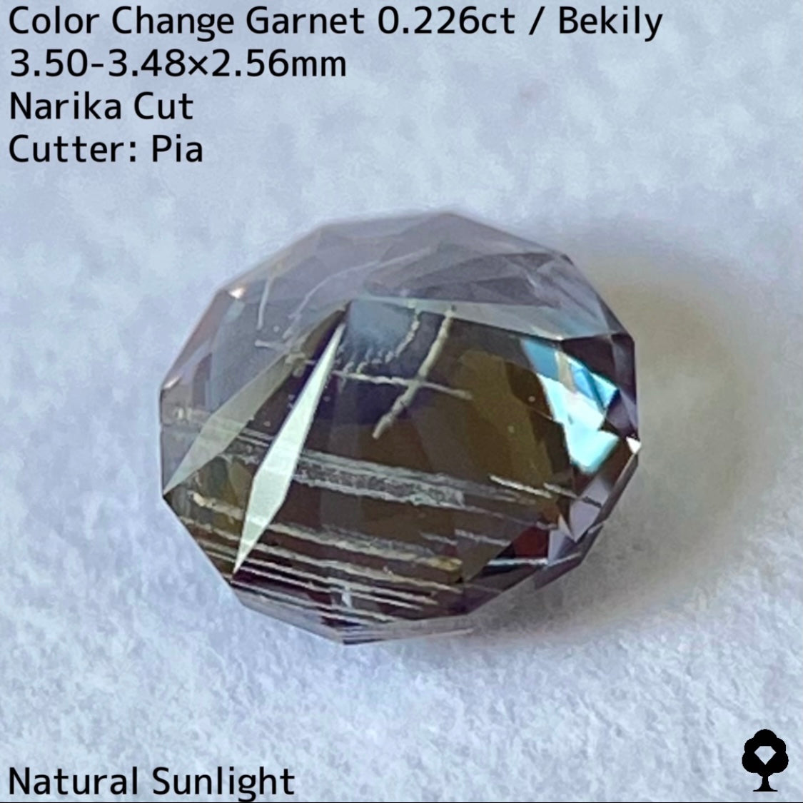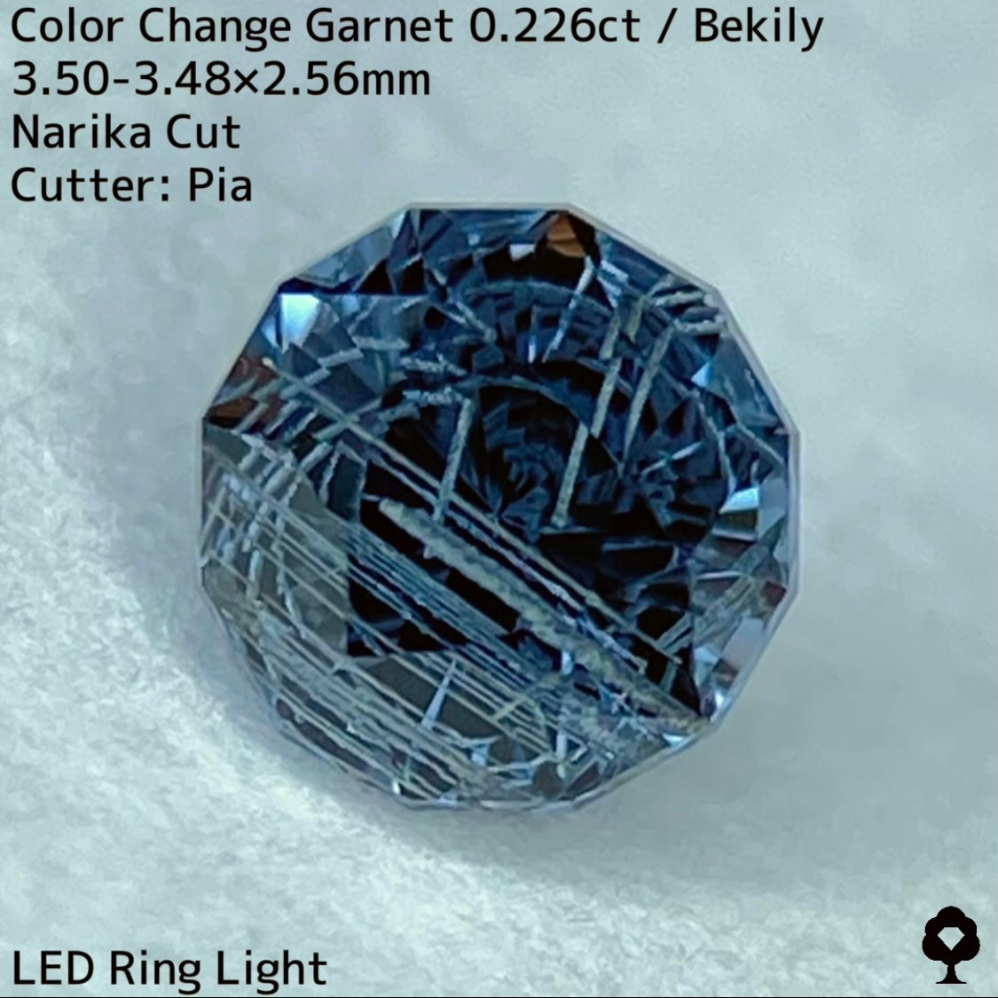 幻と呼ばれるベキリー鉱山のカラーチェンジガーネットをナリカーカットに贅沢に仕上げた、ブルー・グリーン・グレー・パープルが見る環境や光源によって移り変わる、チューブインクルージョンがクラウン側の半分を占める個性派の一石です。
