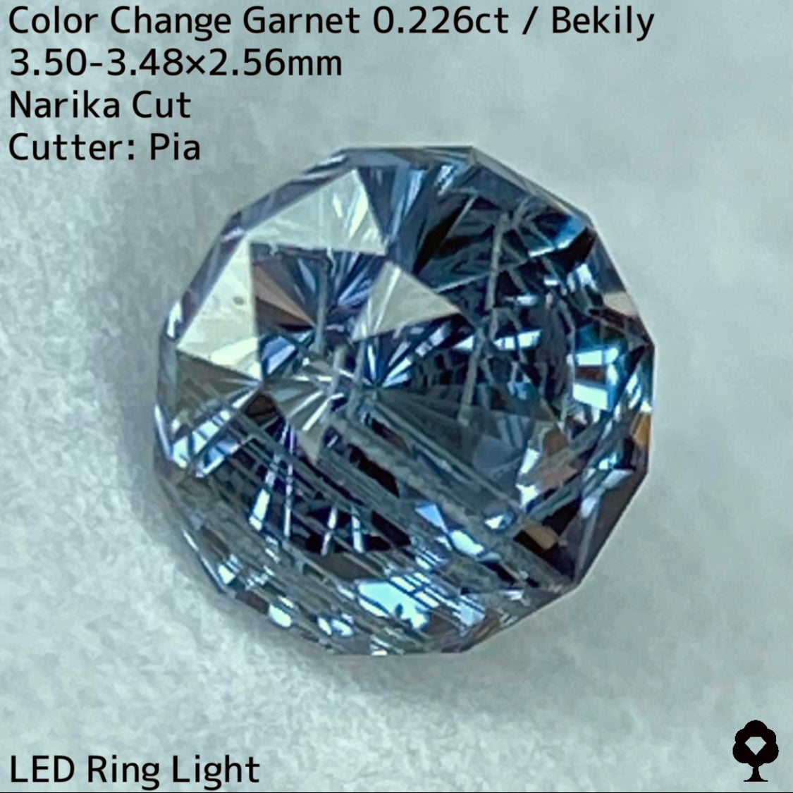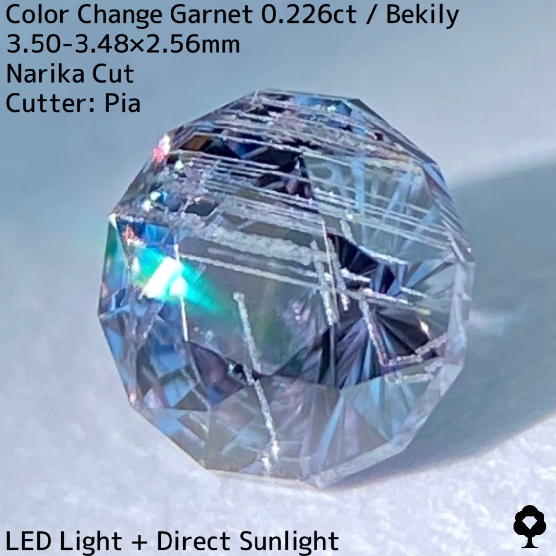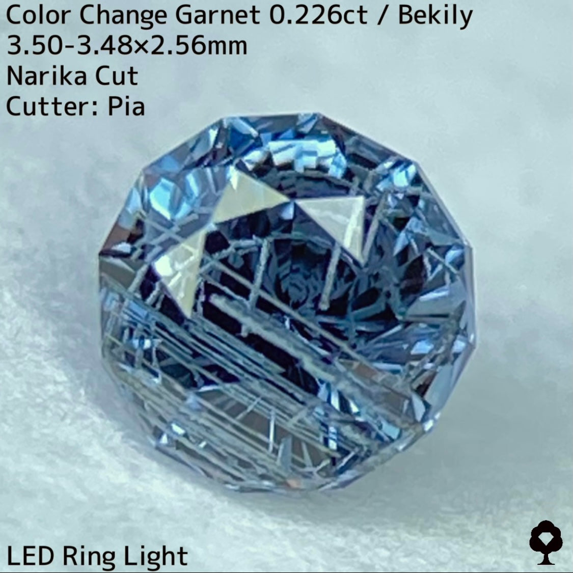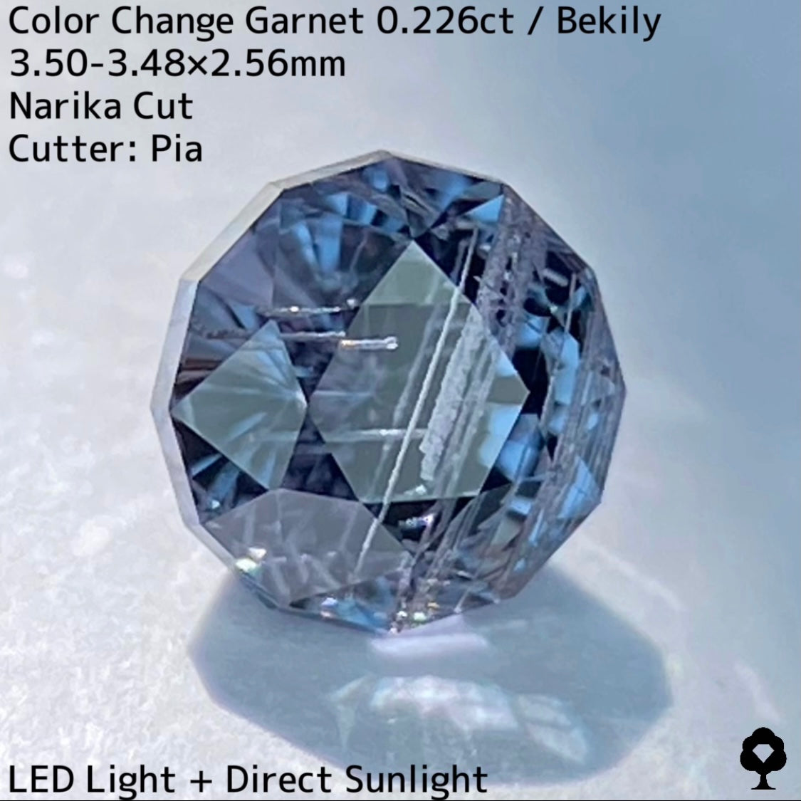 幻と呼ばれるベキリー鉱山のカラーチェンジガーネットをナリカーカットに贅沢に仕上げた、ブルー・グリーン・グレー・パープルが見る環境や光源によって移り変わる、チューブインクルージョンがクラウン側の半分を占める個性派の一石です。