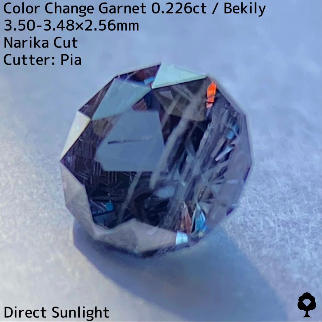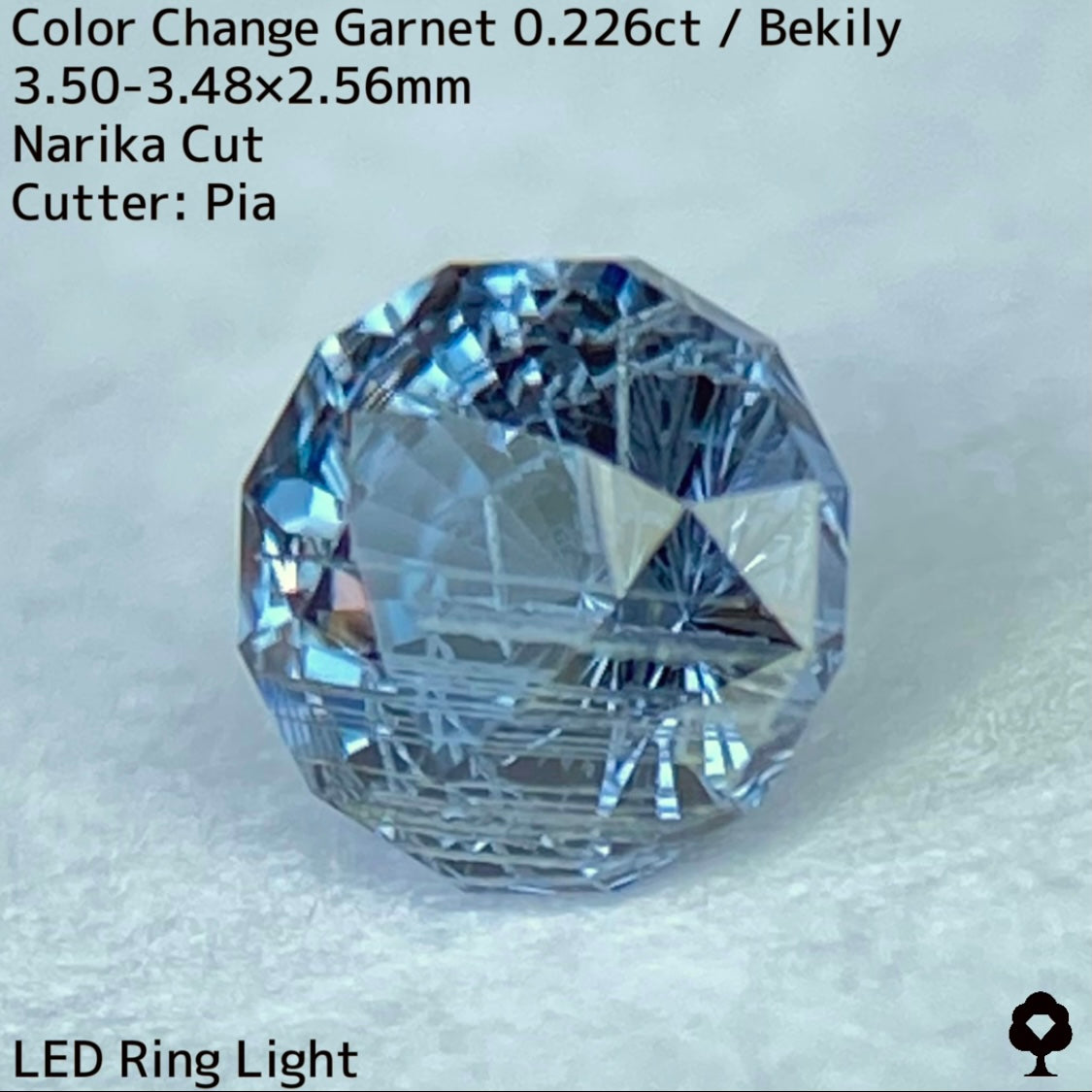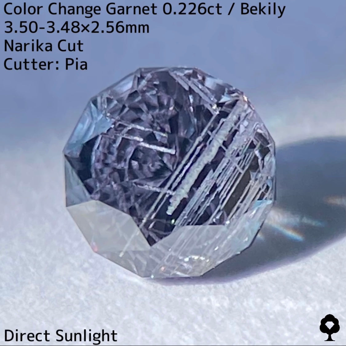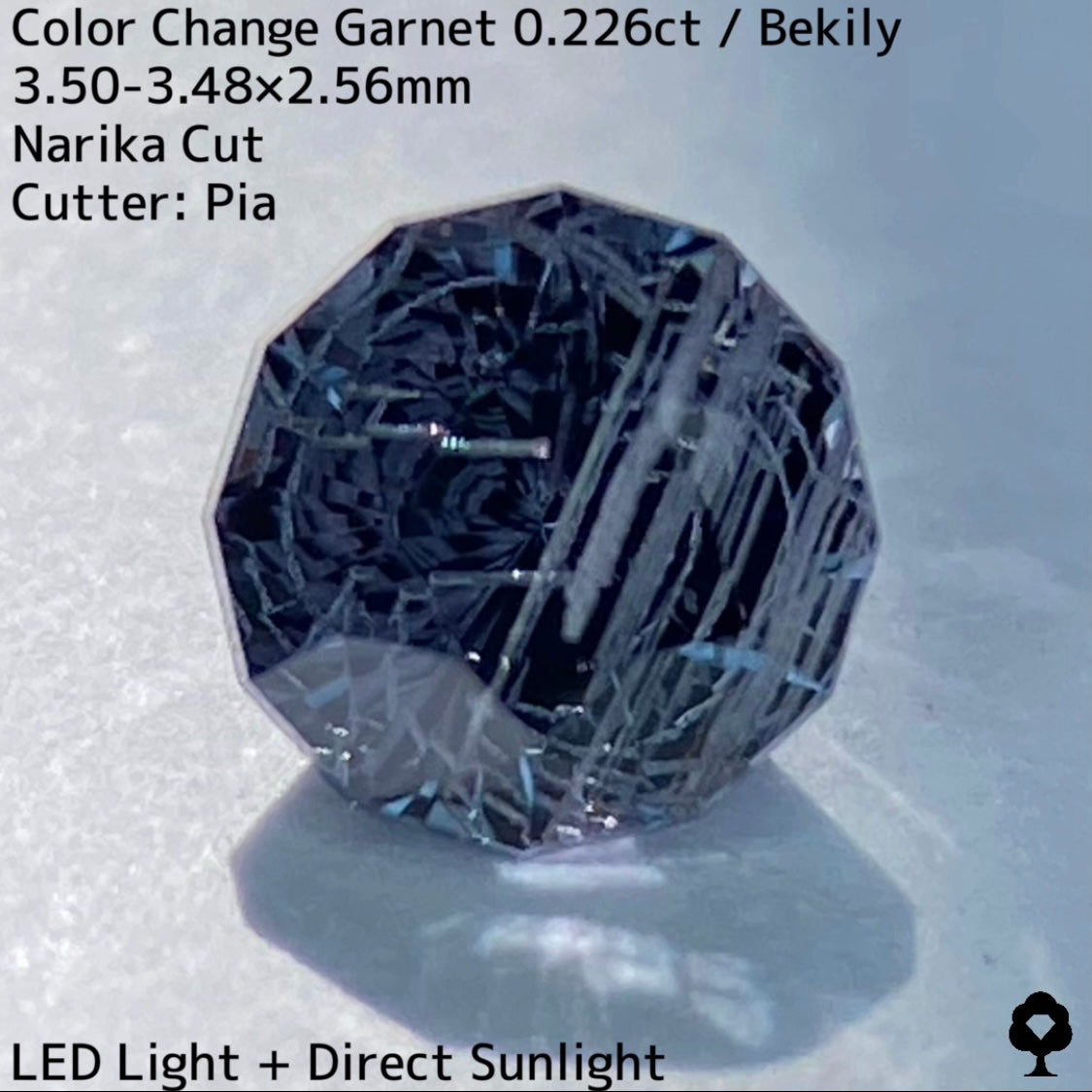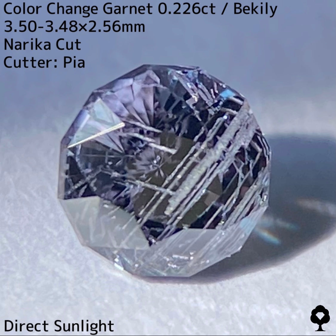 幻と呼ばれるベキリー鉱山のカラーチェンジガーネットをナリカーカットに贅沢に仕上げた、ブルー・グリーン・グレー・パープルが見る環境や光源によって移り変わる、チューブインクルージョンがクラウン側の半分を占める個性派の一石です。
