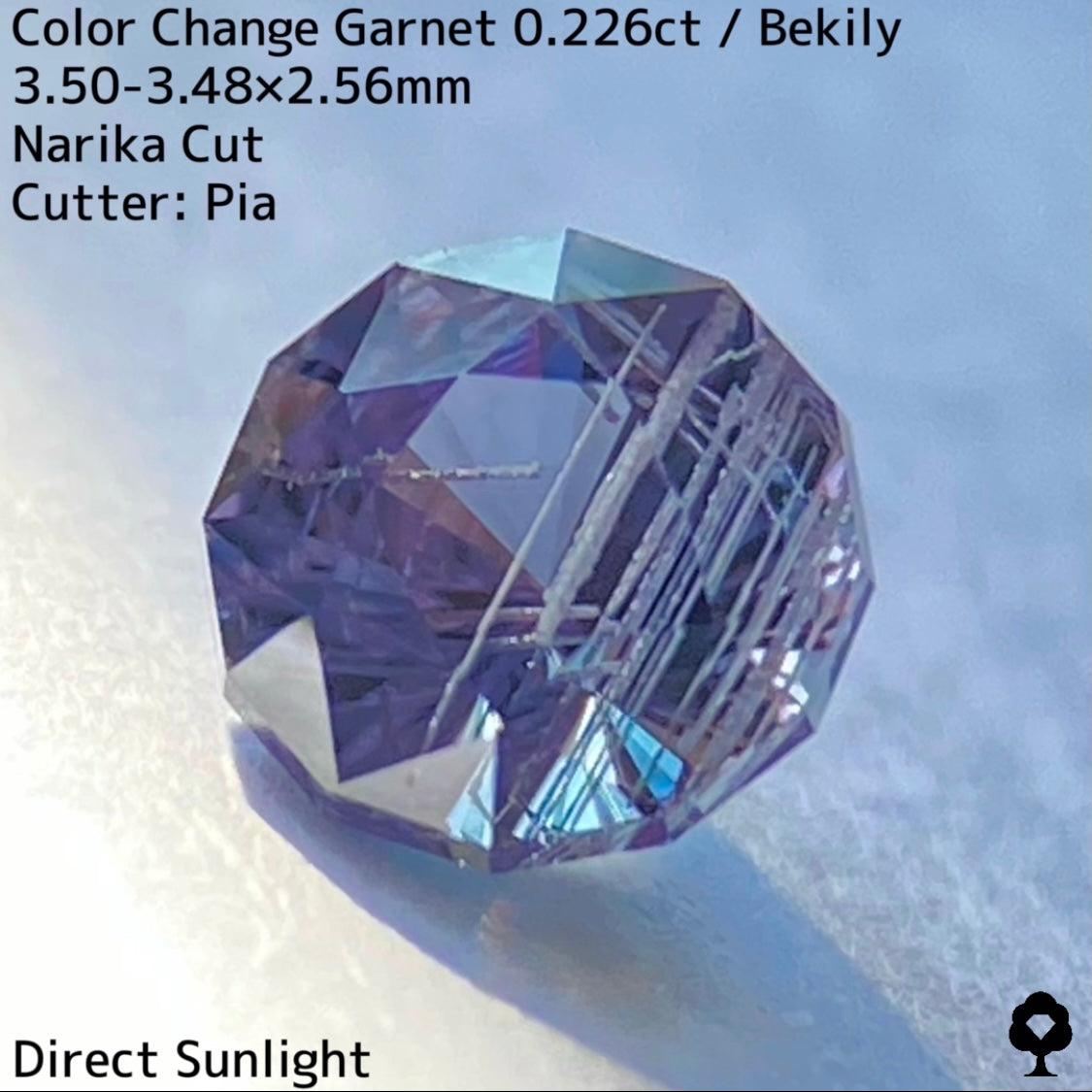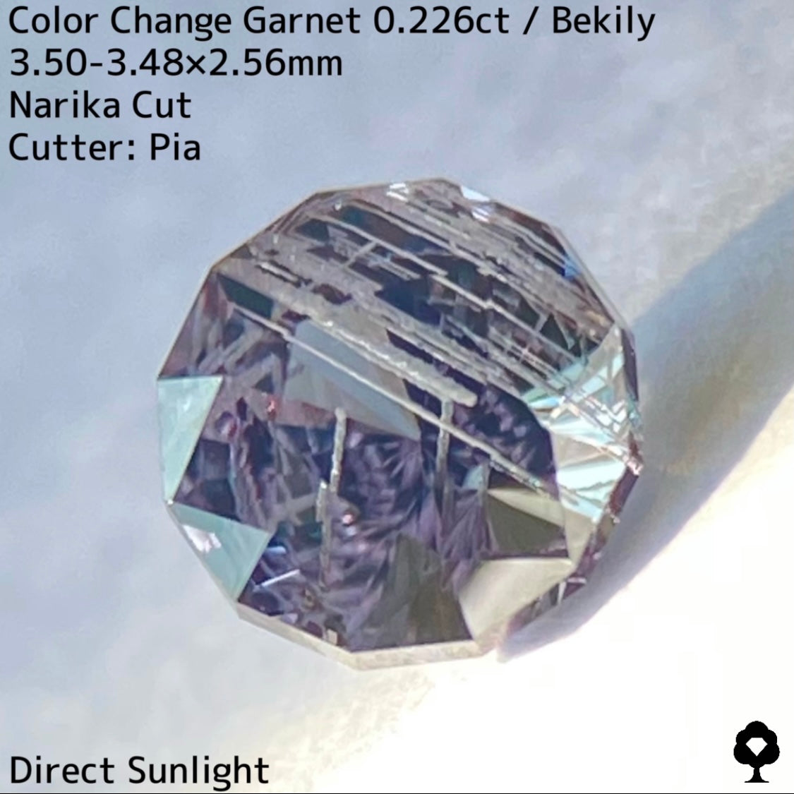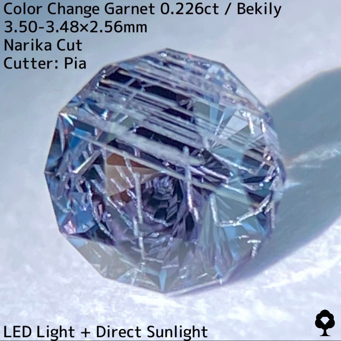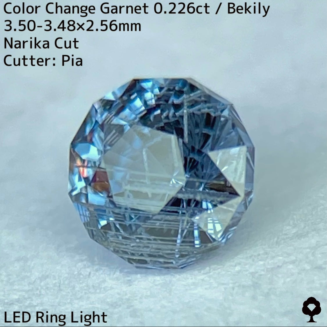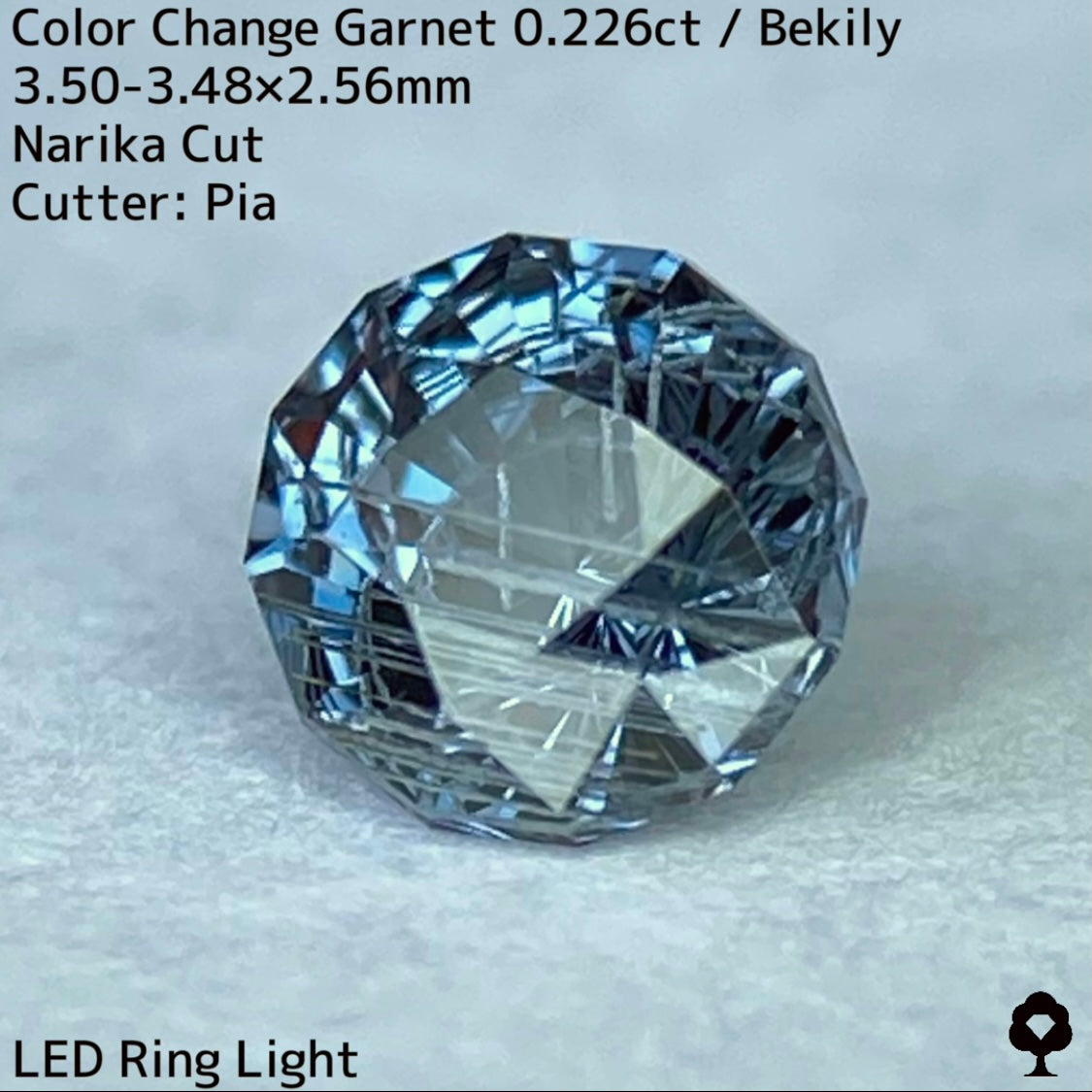 幻と呼ばれるベキリー鉱山のカラーチェンジガーネットをナリカーカットに贅沢に仕上げた、ブルー・グリーン・グレー・パープルが見る環境や光源によって移り変わる、チューブインクルージョンがクラウン側の半分を占める個性派の一石です。