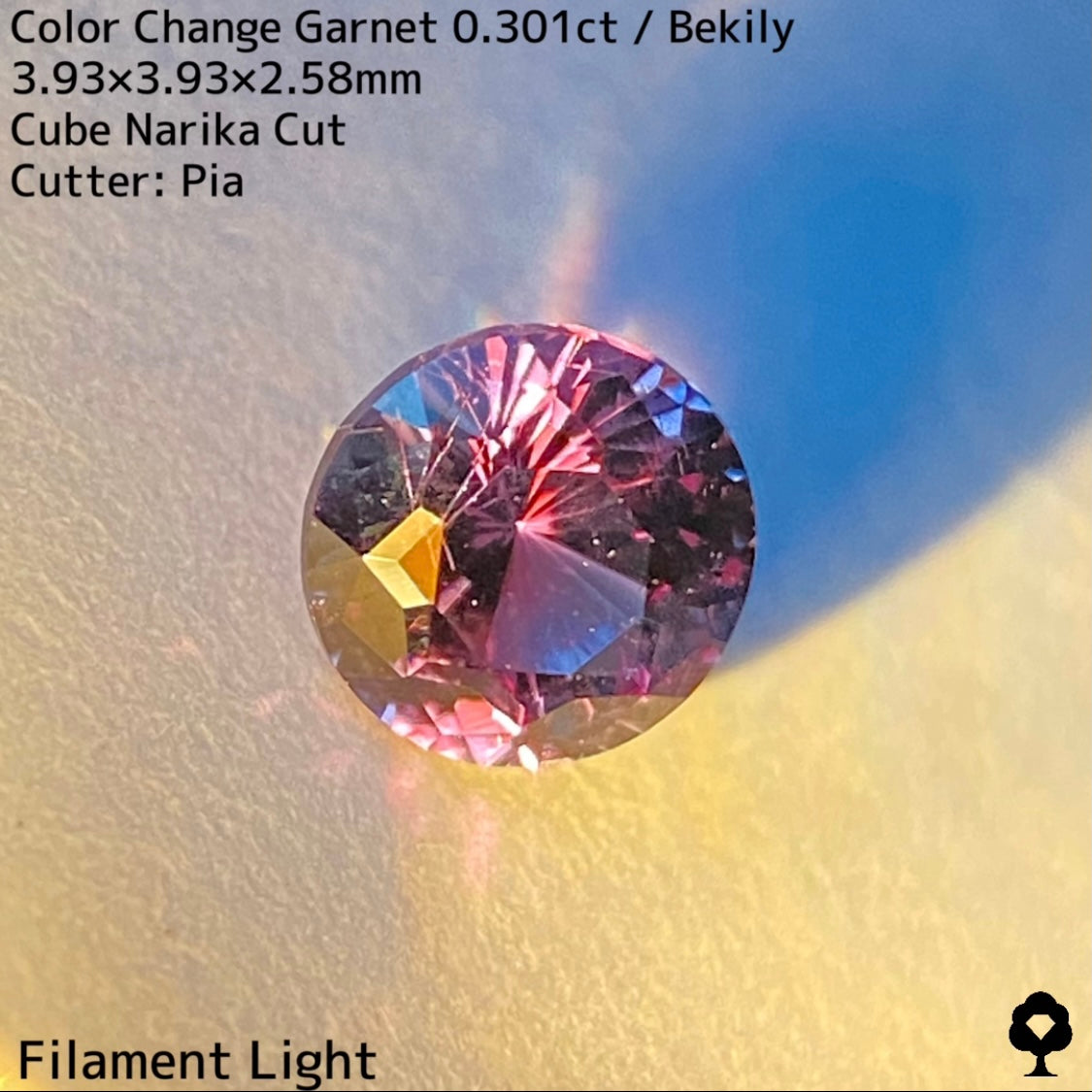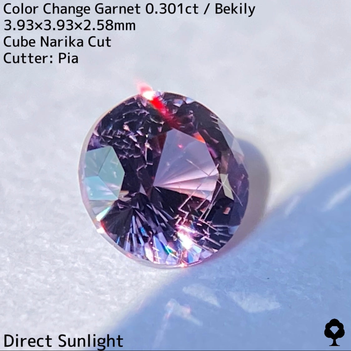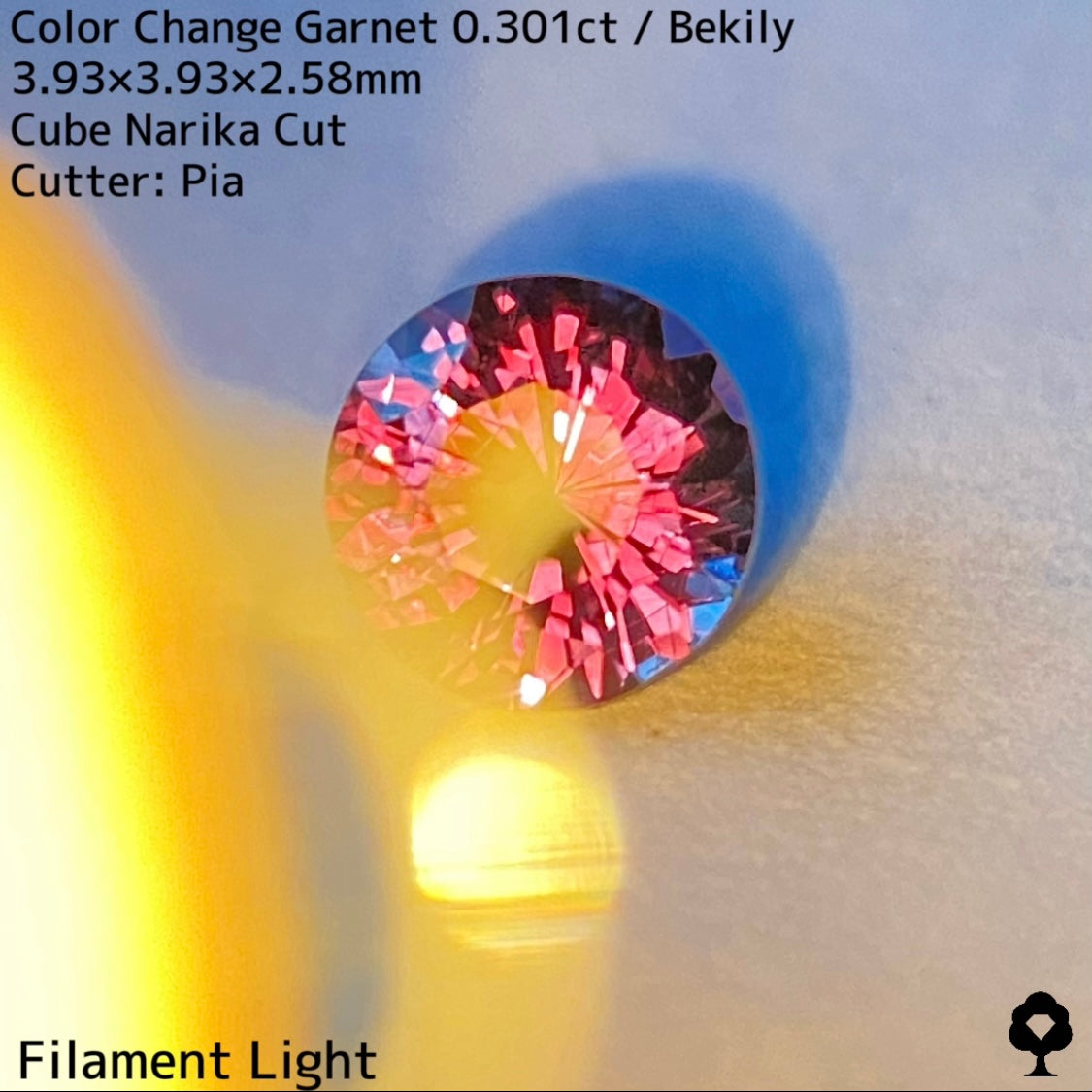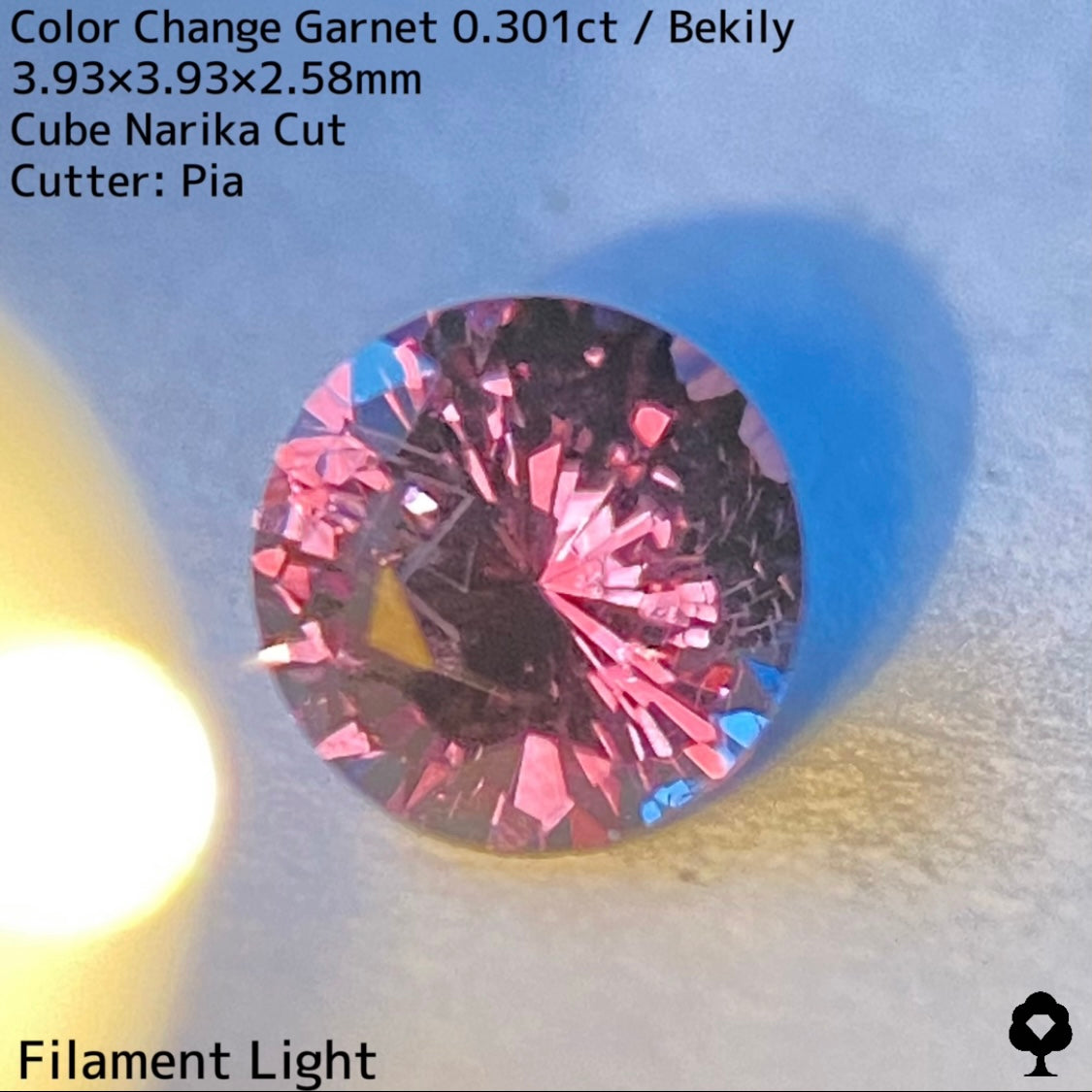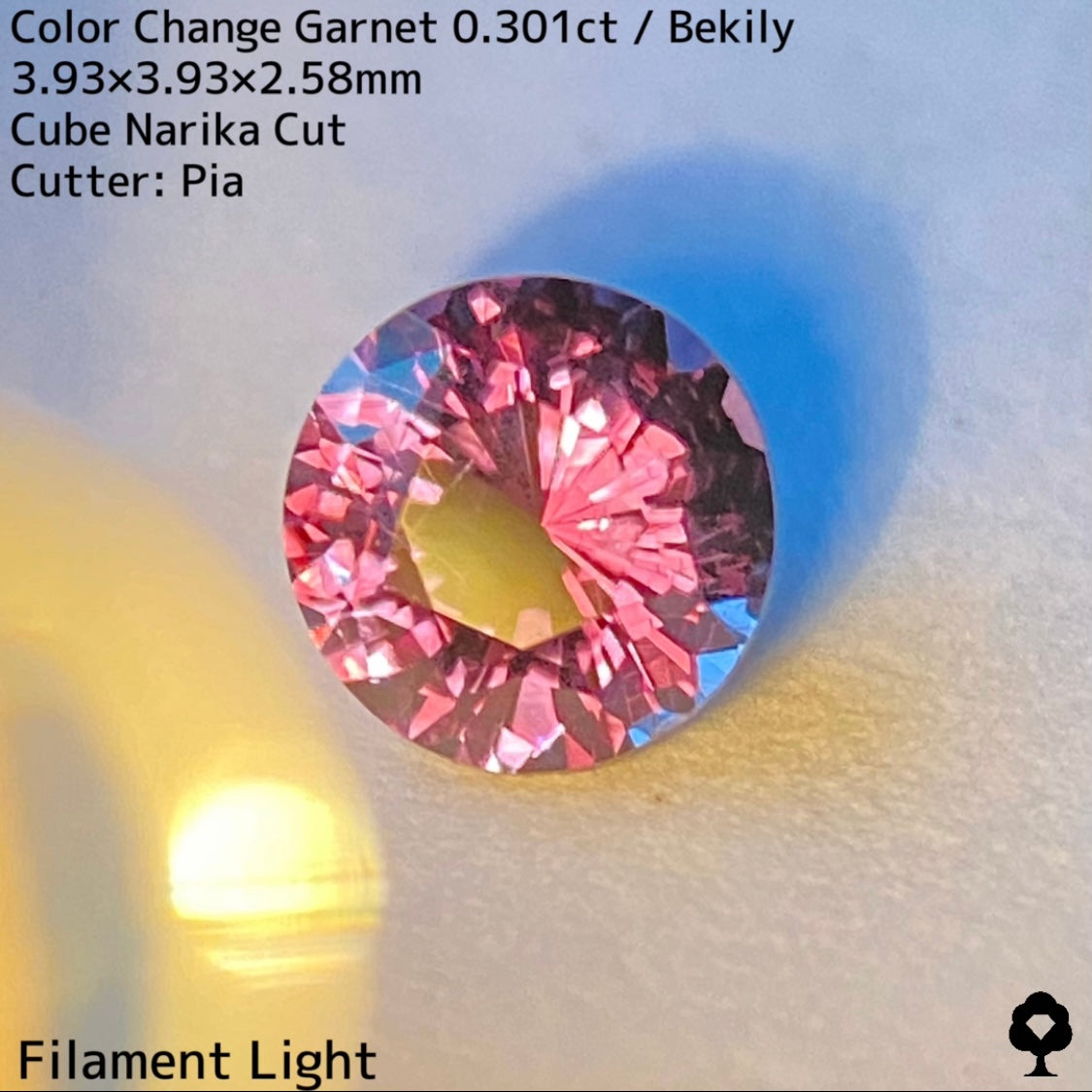 直射日光に当たると軽くカラーチェンジし、パープリッシュピンクが出てきて、フィラメントライトを当てるとかなりチェンジして、鮮やかなピンクとパープルの混ざった色合いに変化して、赤い煌めきも放たれ品質の高さを物語っています。