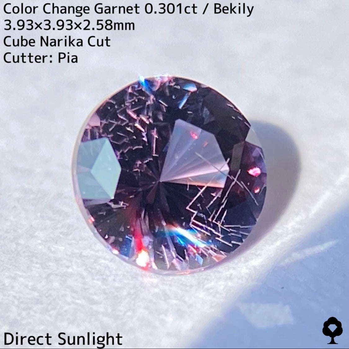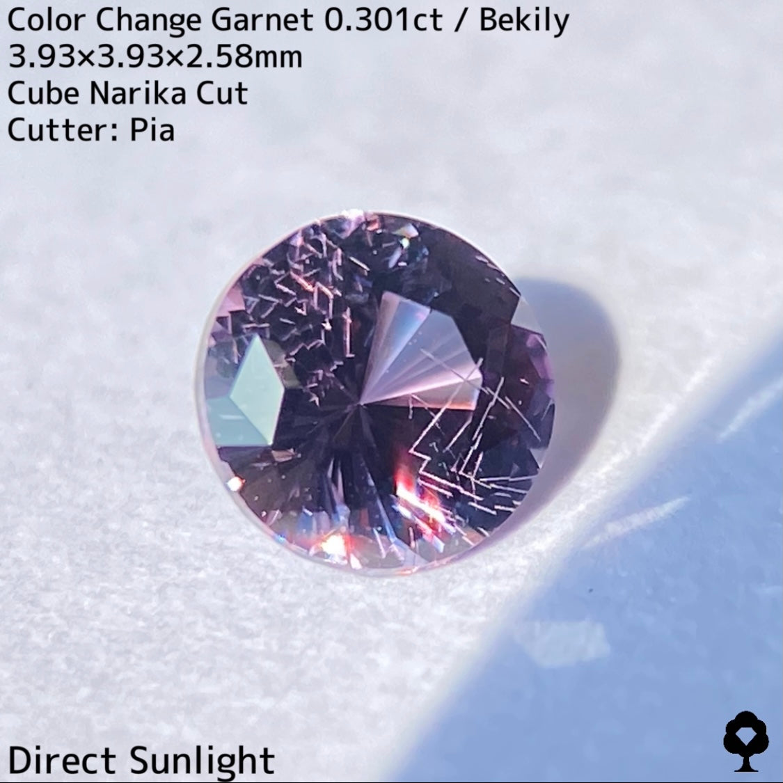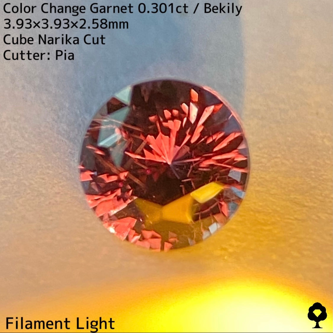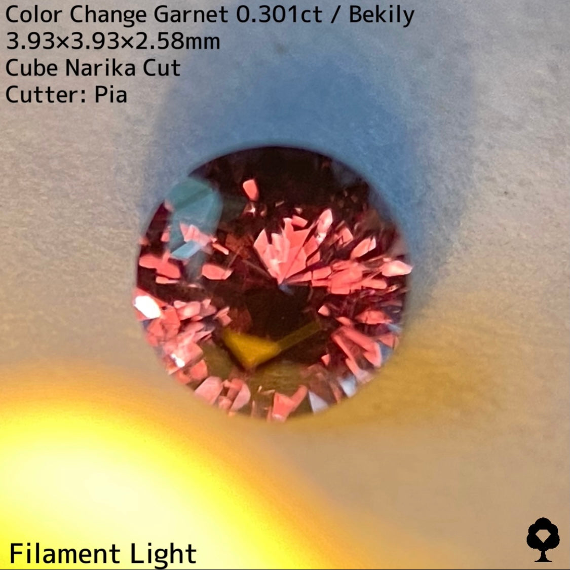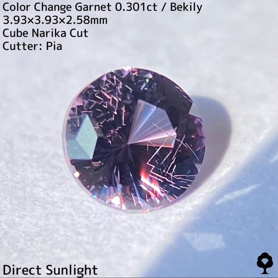 直射日光に当たると軽くカラーチェンジし、パープリッシュピンクが出てきて、フィラメントライトを当てるとかなりチェンジして、鮮やかなピンクとパープルの混ざった色合いに変化して、赤い煌めきも放たれ品質の高さを物語っています。