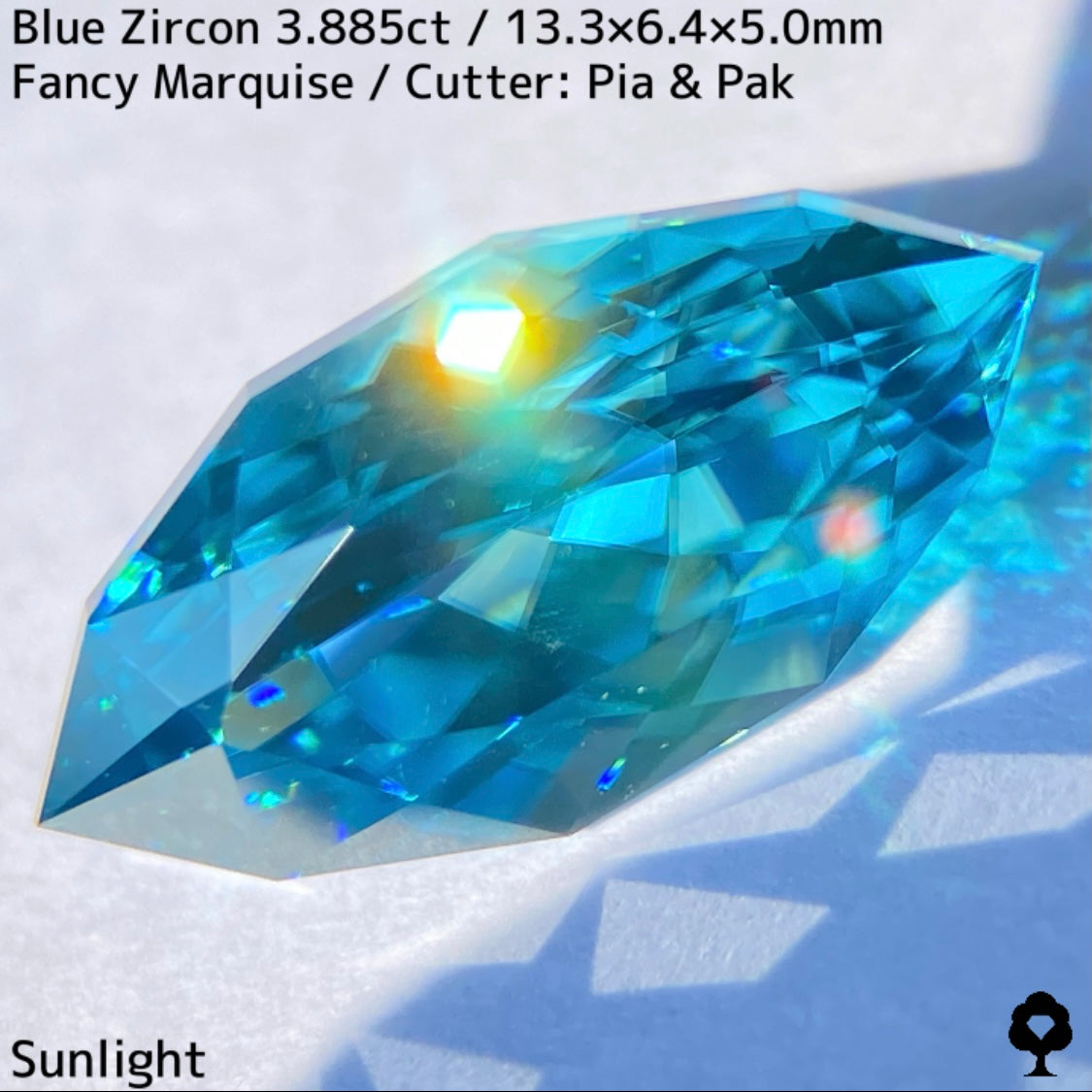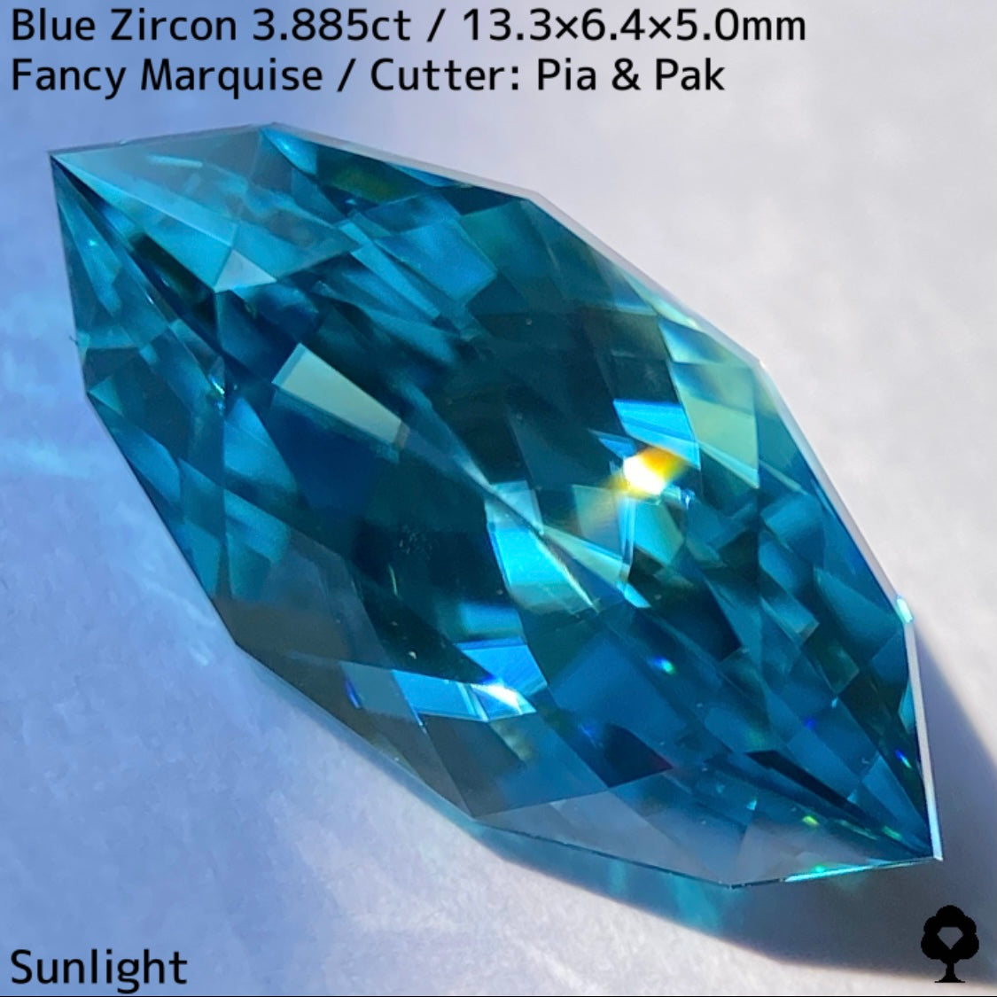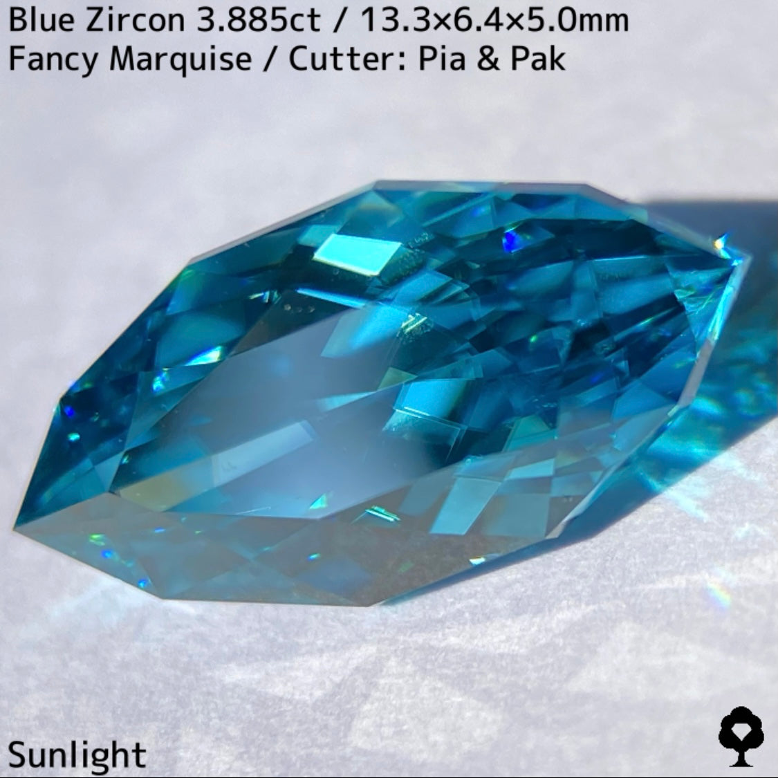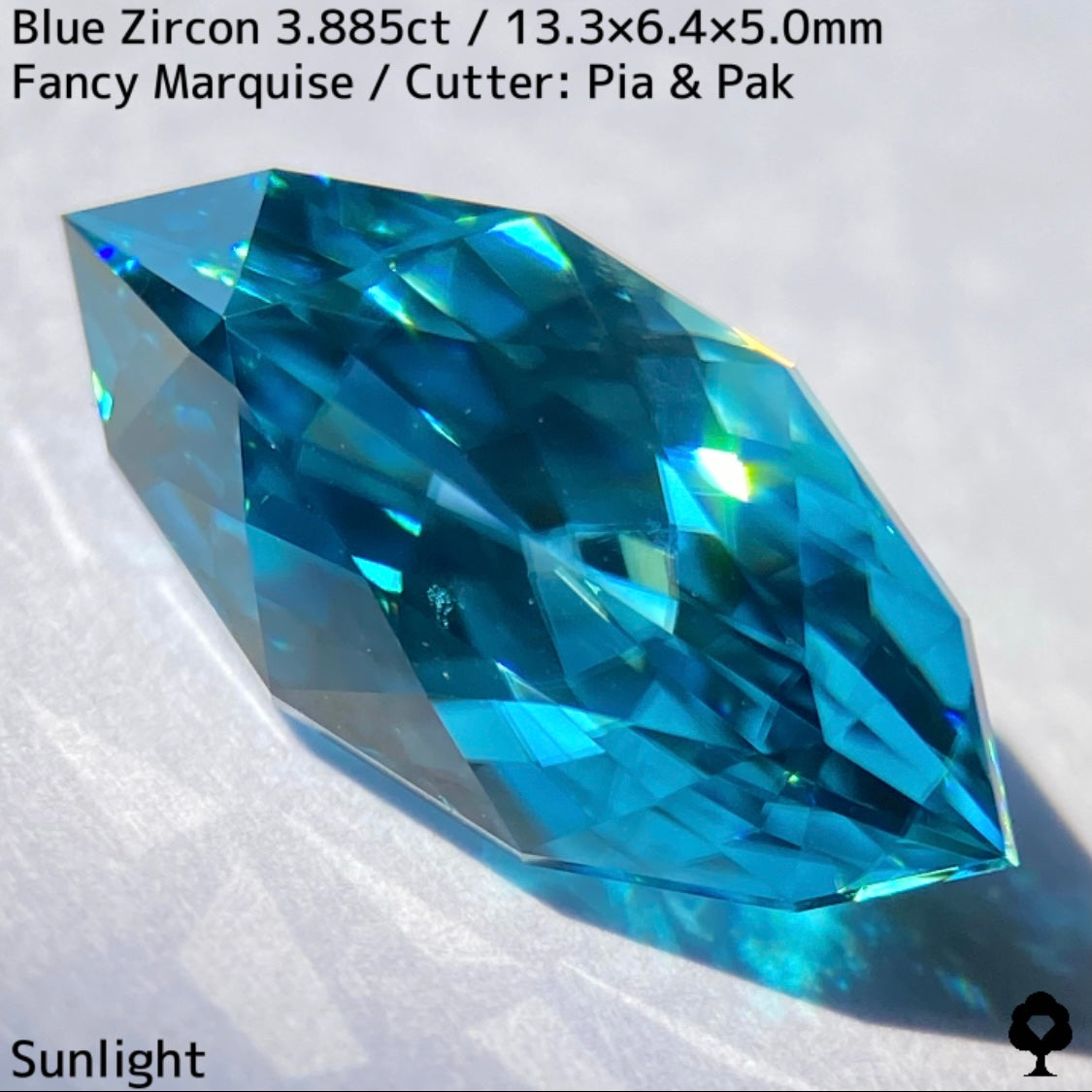 グリーンがかったマリンブルーの美しい結晶で、煌めきの強いジルコンのポテンシャルを抜群のカットによって最大限に引き出し、煌めきファイアーが溢れる一石です。