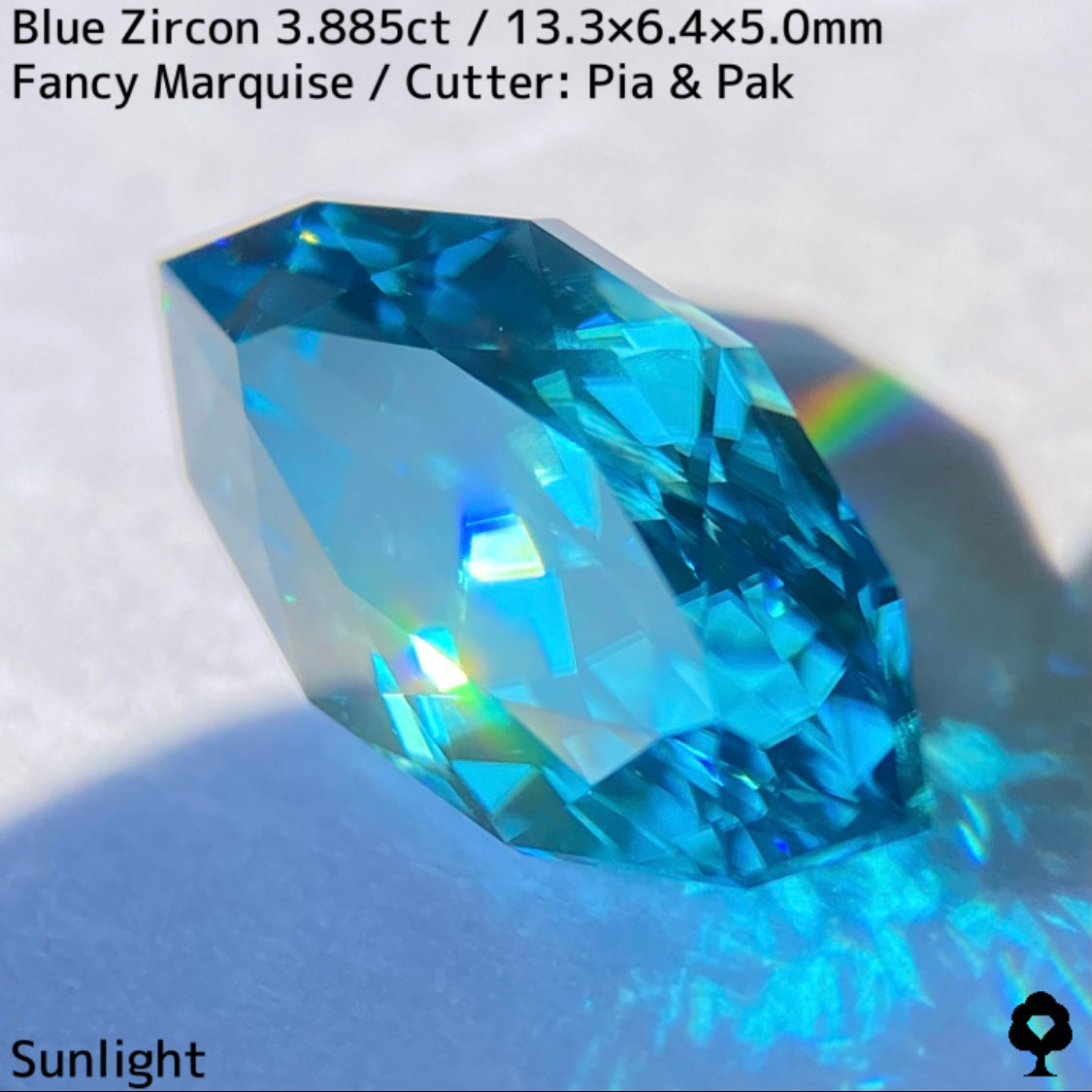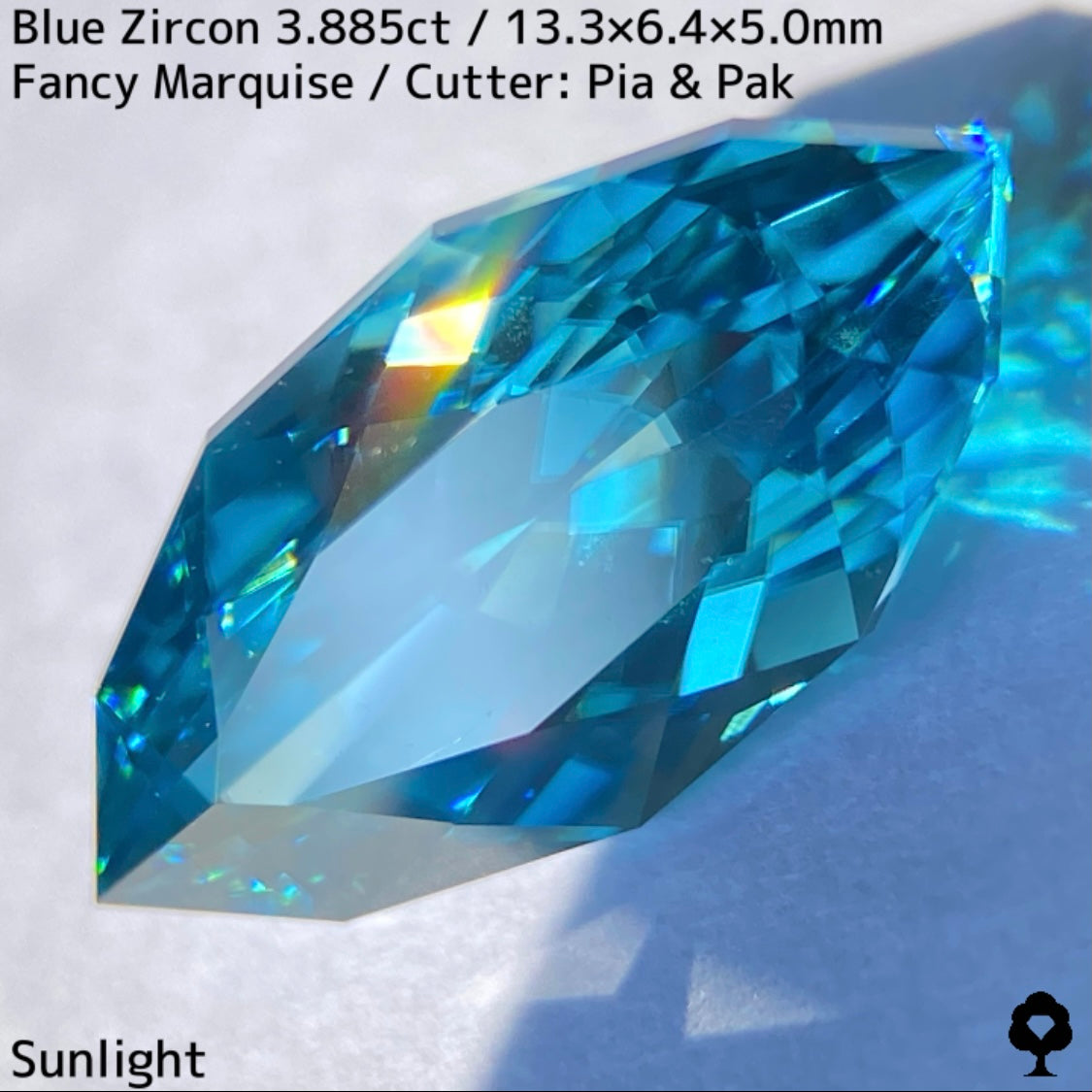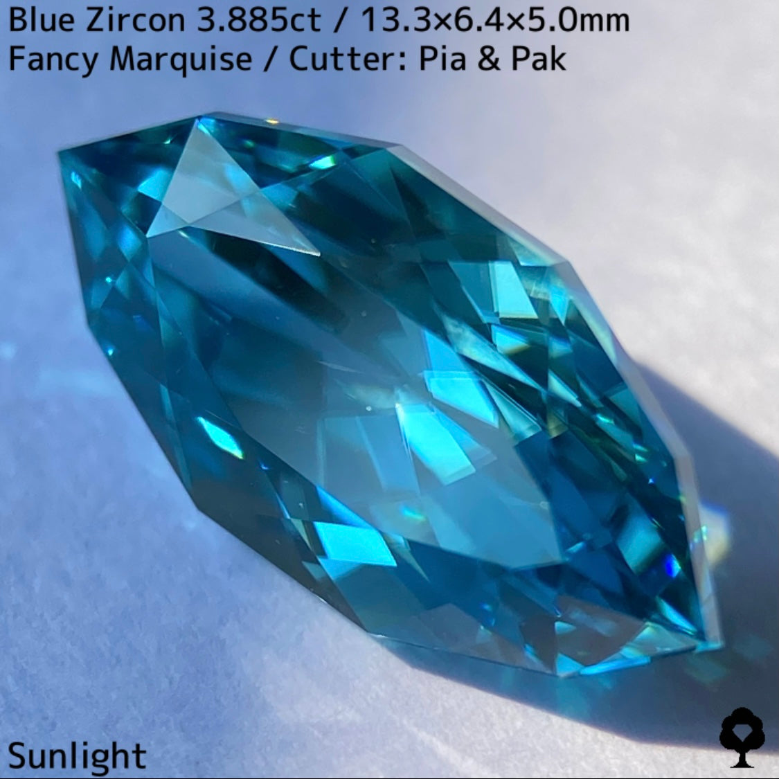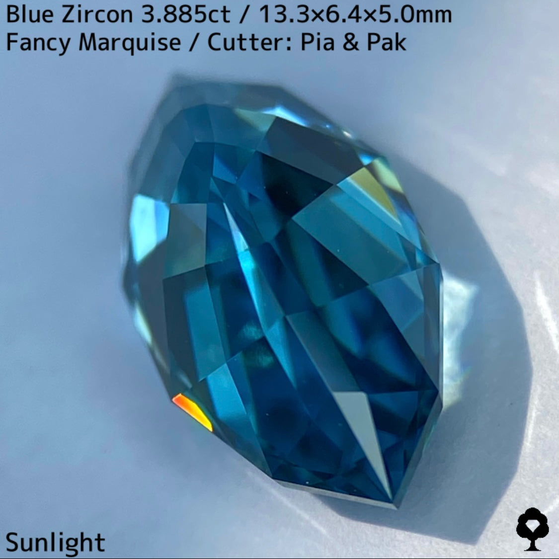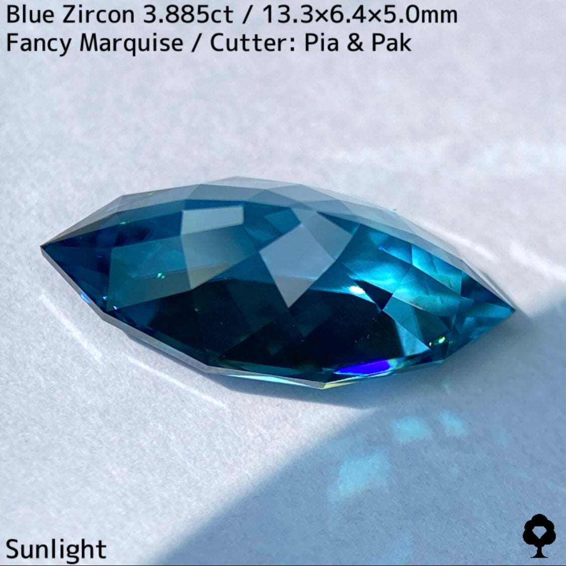 グリーンがかったマリンブルーの美しい結晶で、煌めきの強いジルコンのポテンシャルを抜群のカットによって最大限に引き出し、煌めきファイアーが溢れる一石です。