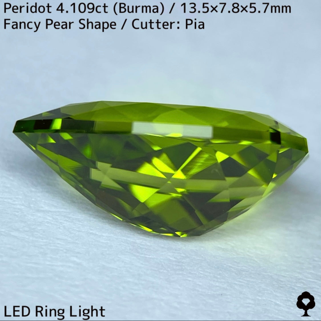 ビルマ産で4ctアップの希少な美結晶ファンシーペアシェイプ★ペリドット4.109ct