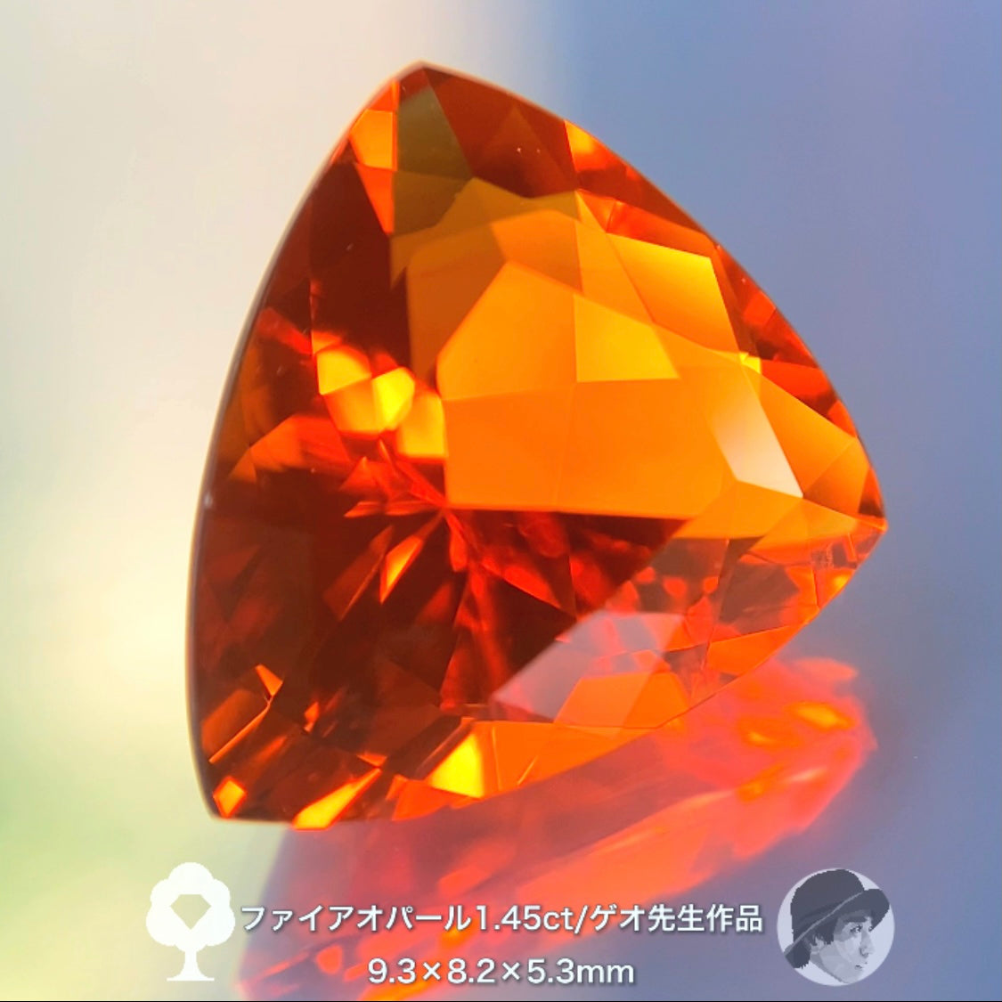 スーパーマンダリンカラーのファイアオパール 1.45ctです。独創的天才カット職人ゲオちゃんの変形トリリアントカット。