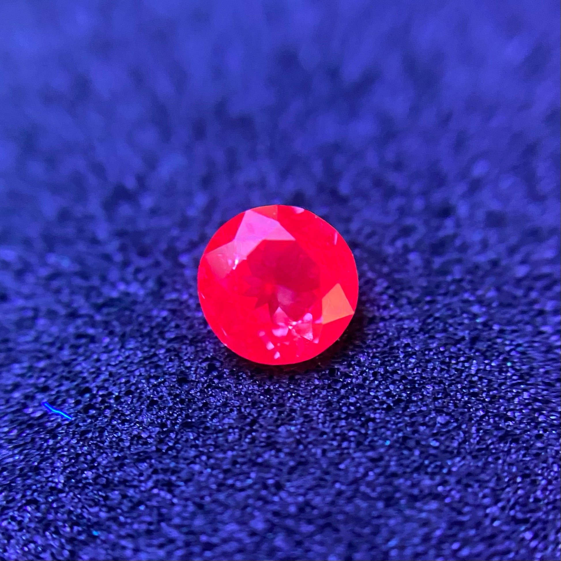 パープリッシュなルビーレッドが美しく、パビリオン側のフラワーカットが鮮やかなダリヤのようなカットにより華やかな輝きを放つラウンドシェイプのルビーです。
