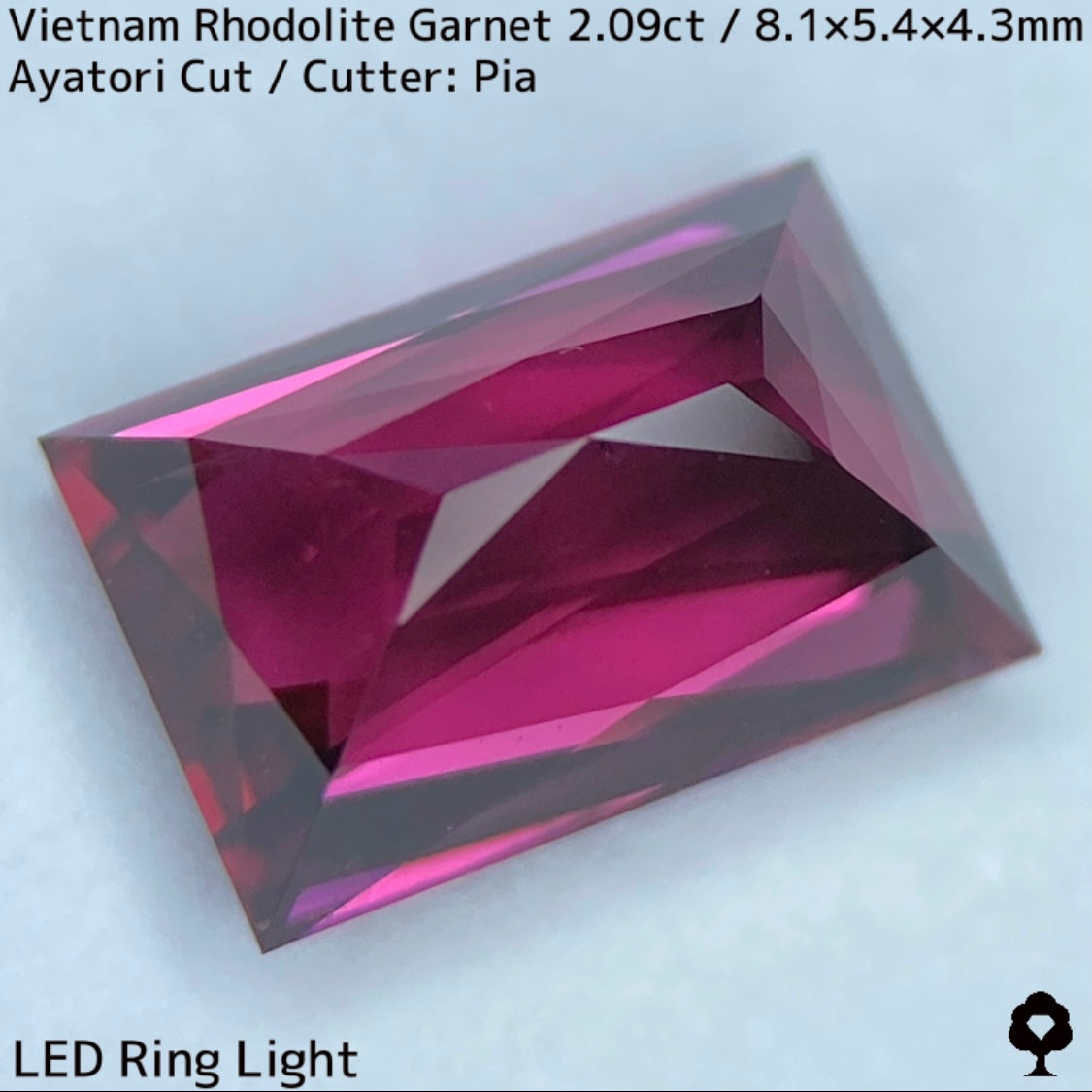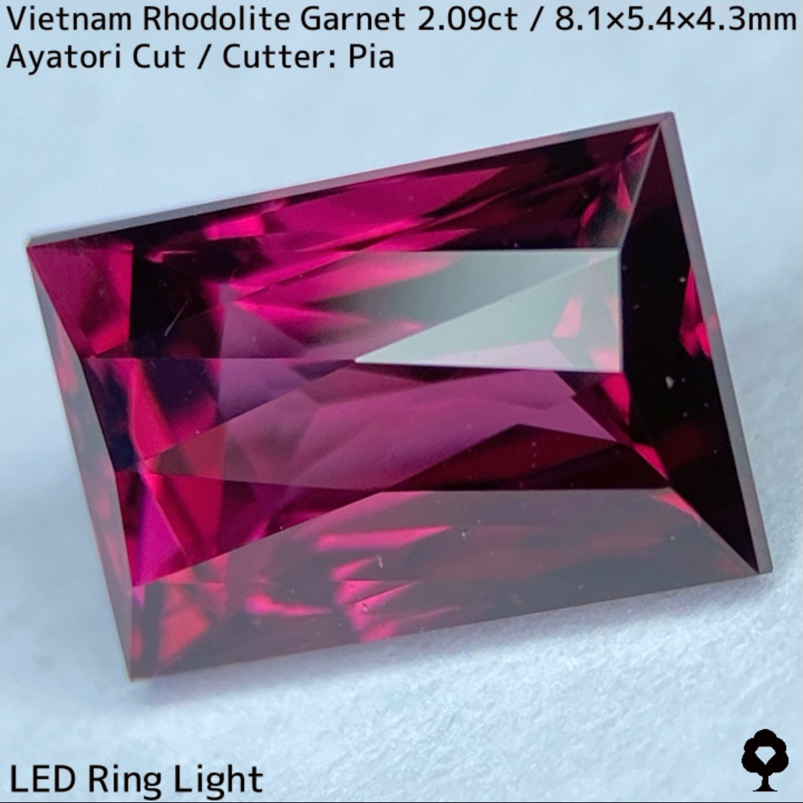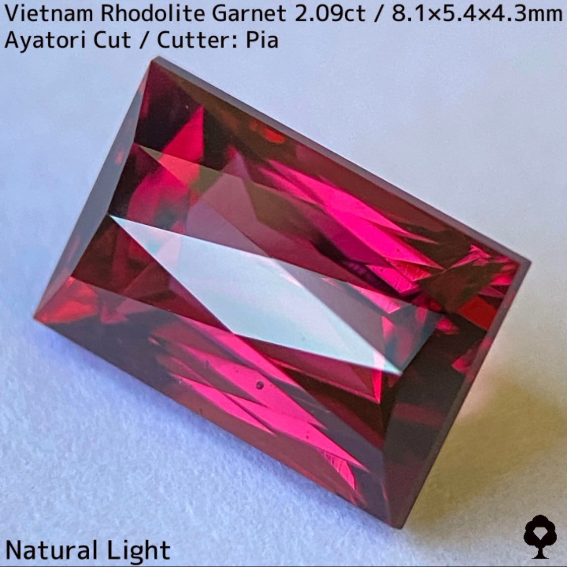 流通量の少ないベトナム産のロードライトガーネットで、赤とオレンジとパープルが混ざり合った濃厚な薔薇色の一石を、シザースカットの極みと言えるアヤトリカットに仕上げました。