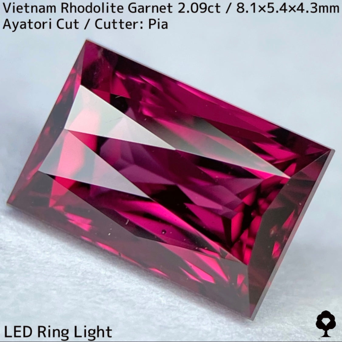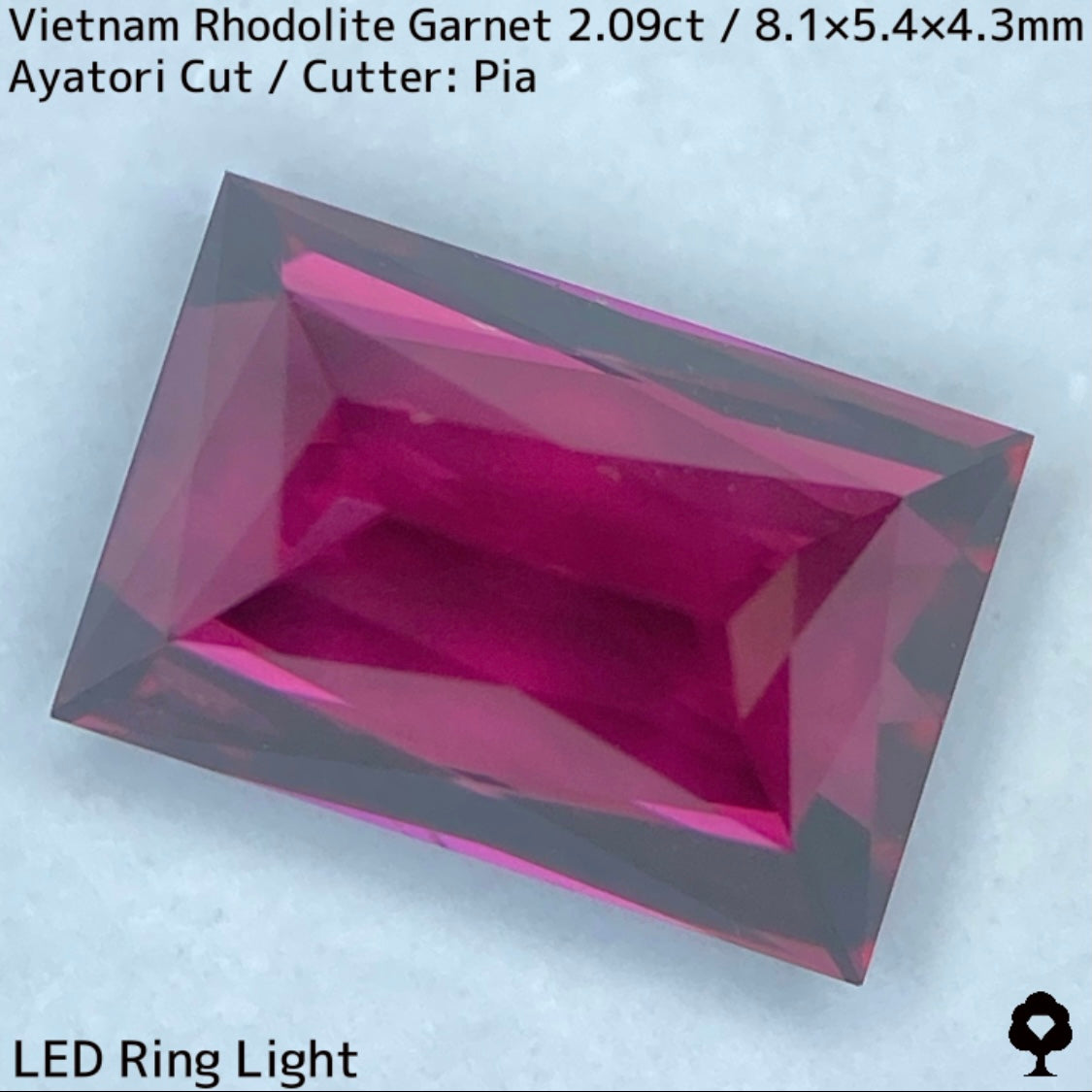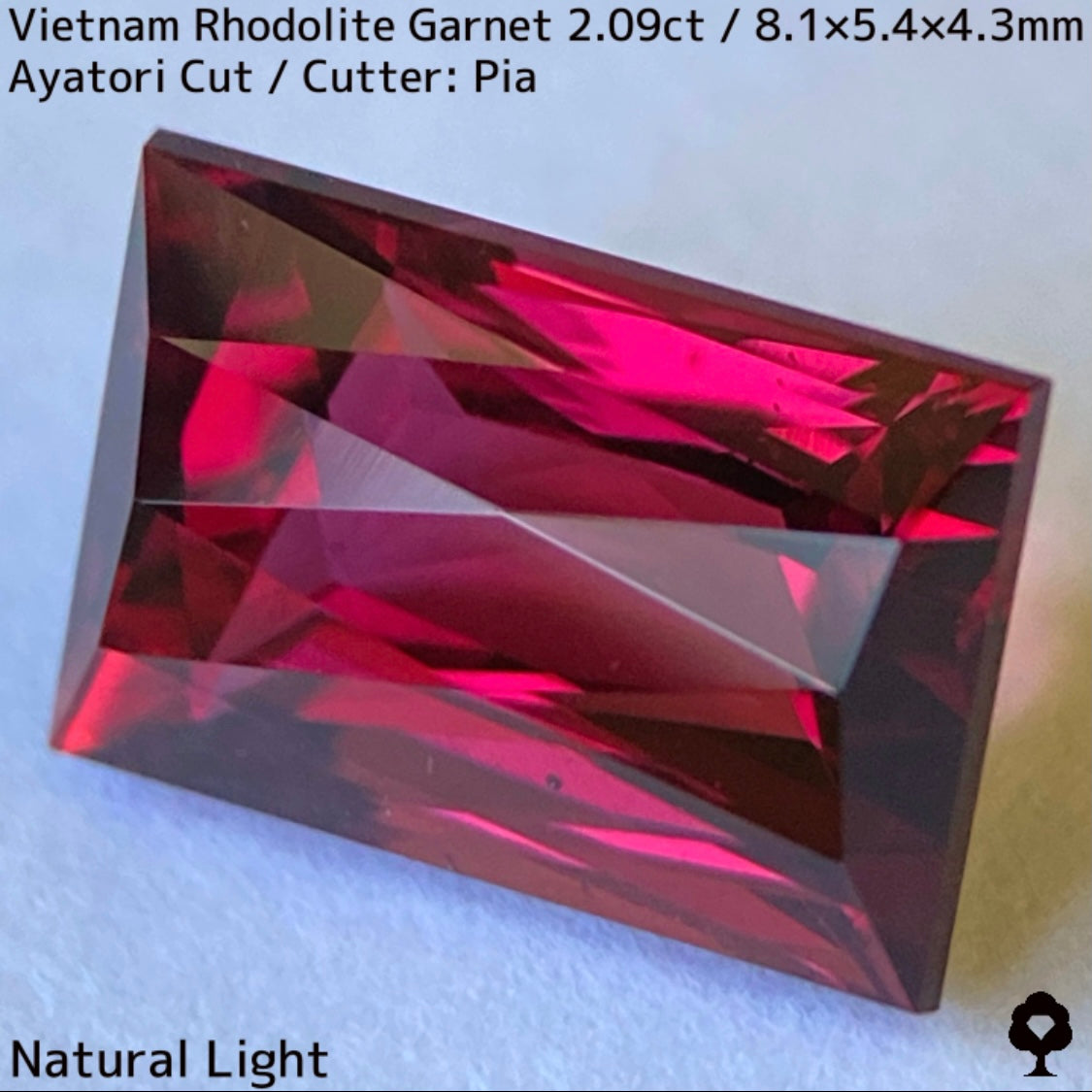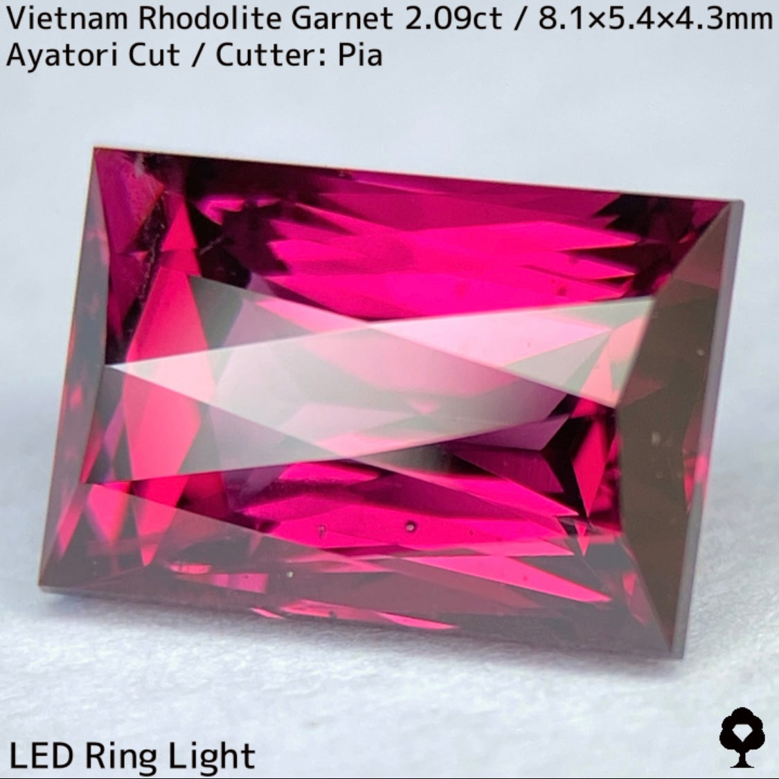 流通量の少ないベトナム産のロードライトガーネットで、赤とオレンジとパープルが混ざり合った濃厚な薔薇色の一石を、シザースカットの極みと言えるアヤトリカットに仕上げました。