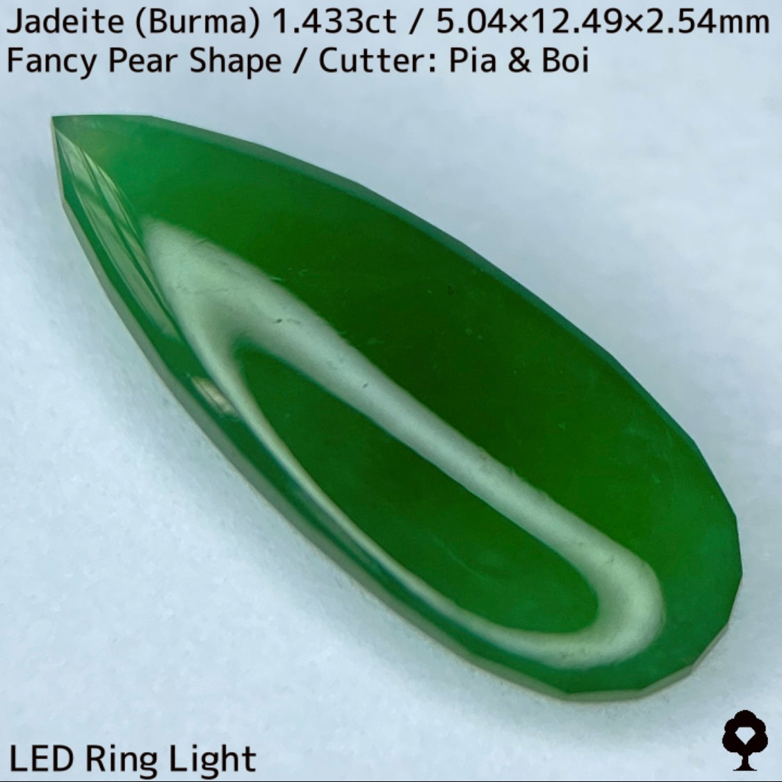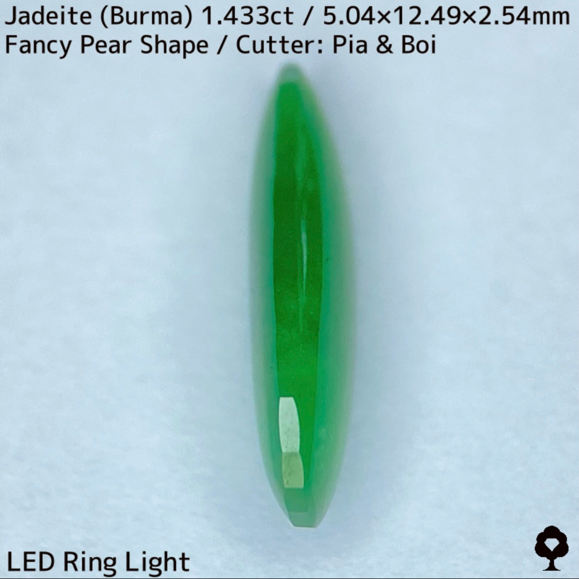 翡翠1.433ct★明るい美グリーンのマスターストーンはGTJならではのさりげなく輪郭が縁取られたツヤツヤファンシーペアシェイプ