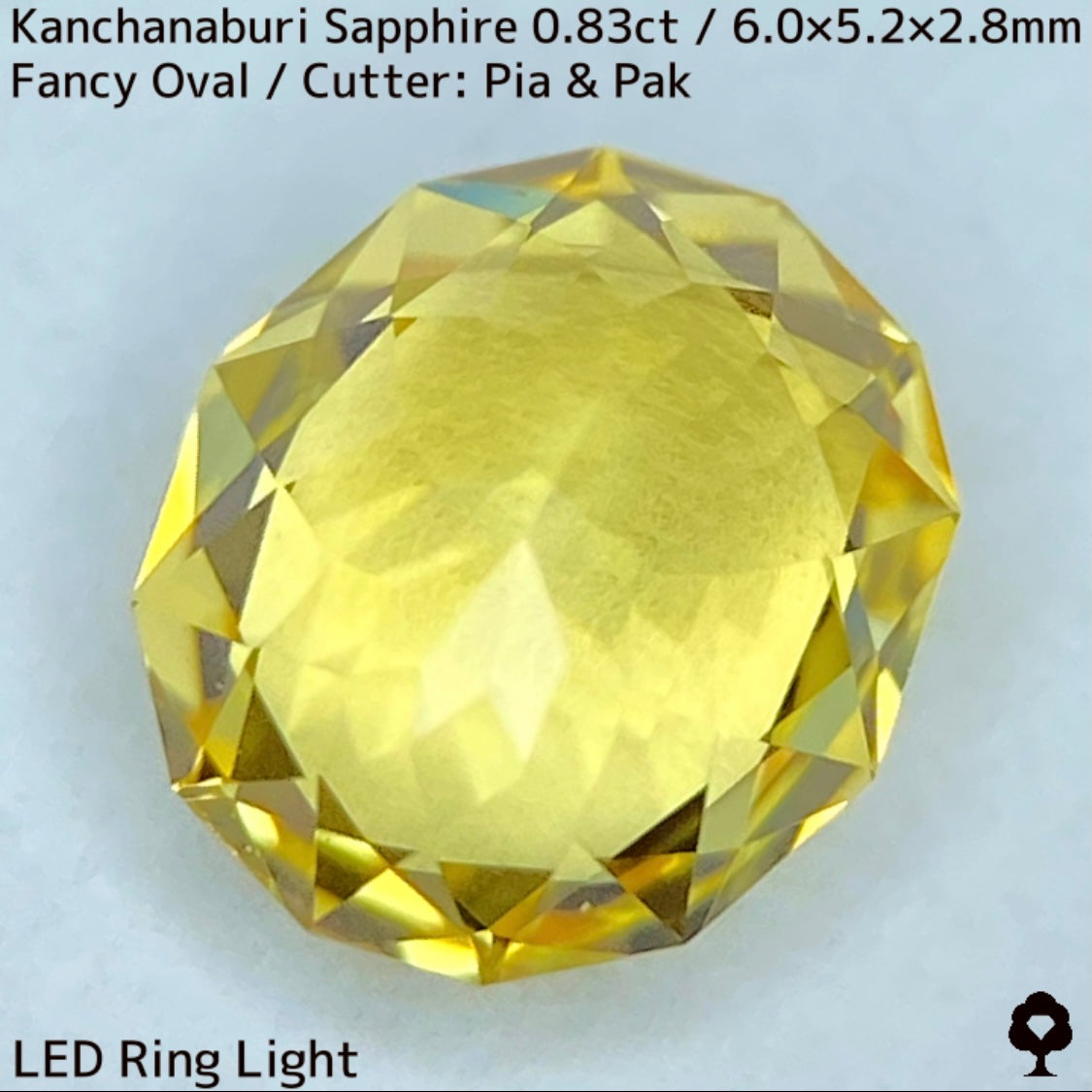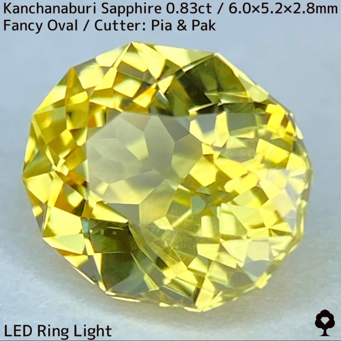 わずかにグリーンを感じるライトイエローのサファイアで、輪郭を縁取ったファンシーオーバルに仕上げ、細やかなフラワーカットによる華やかな煌めきとチラつくファイアーが美しいです。