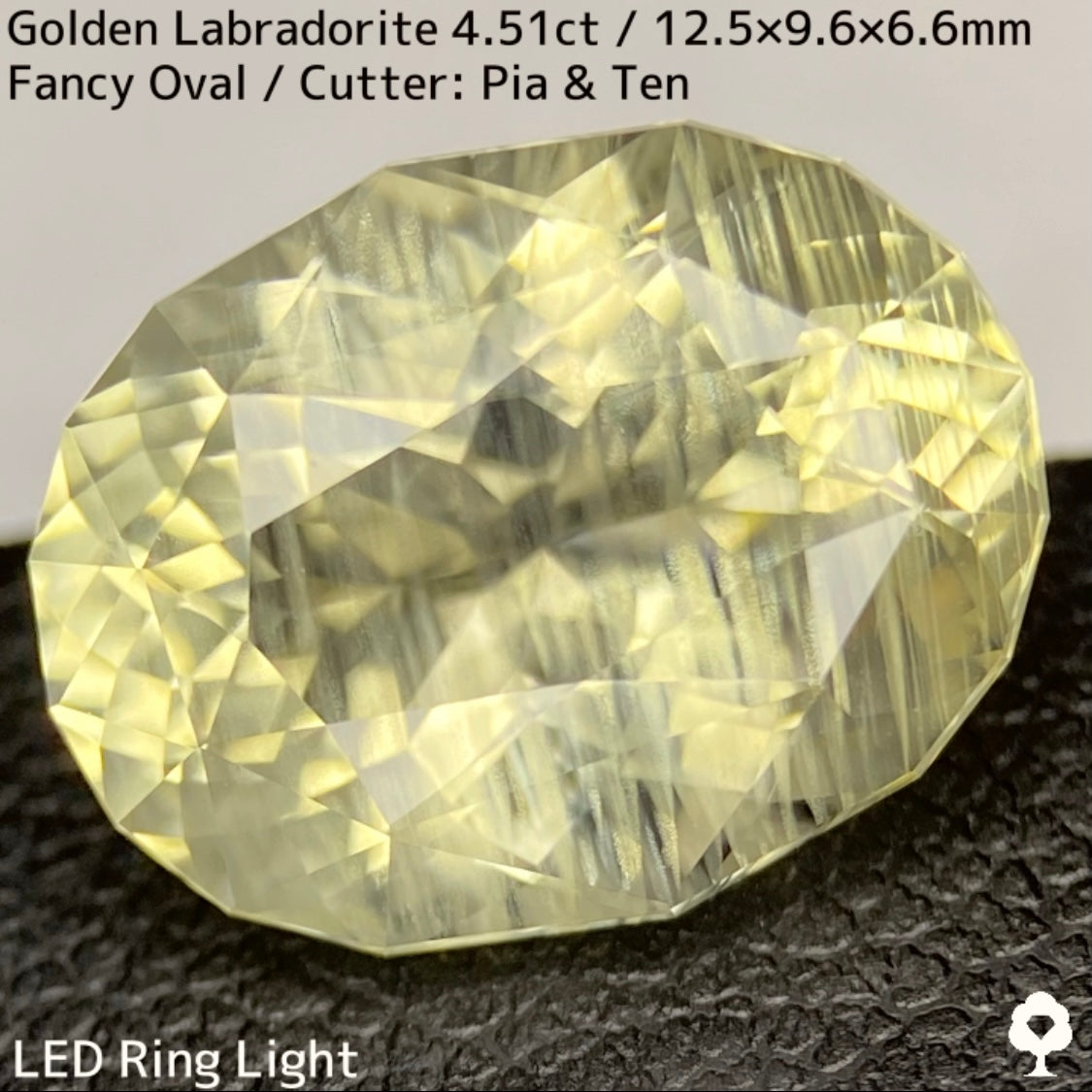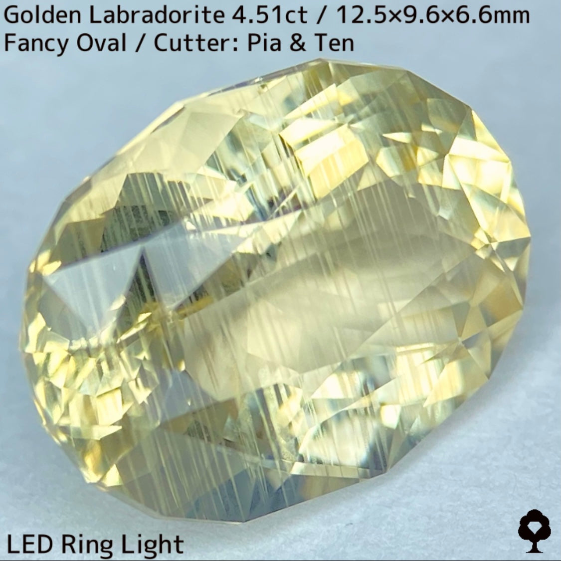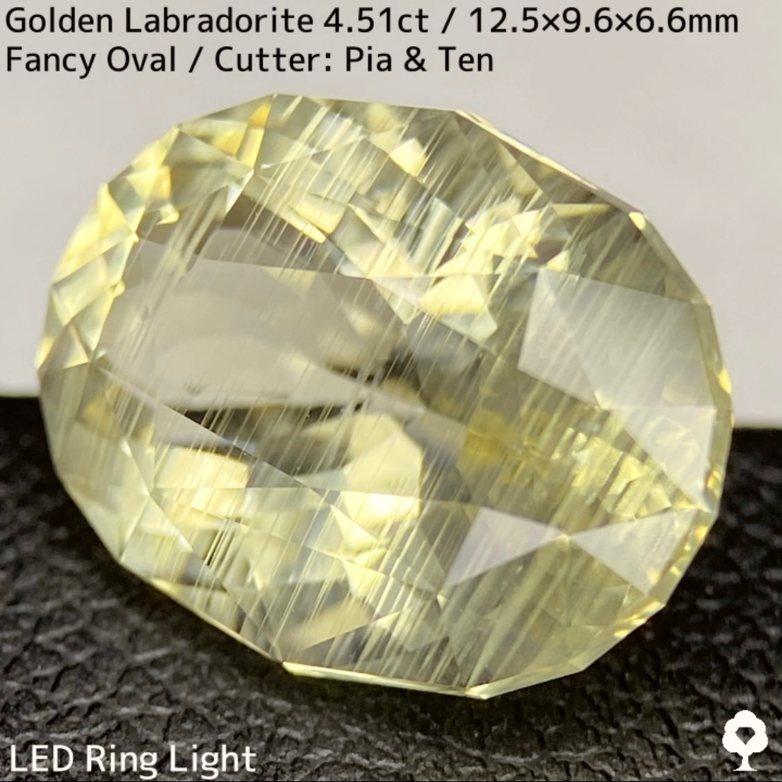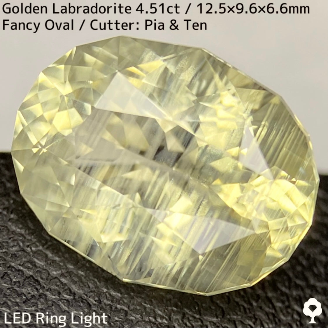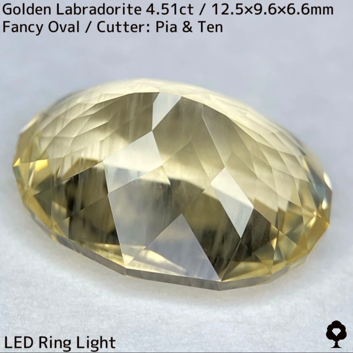 ゴールデンラブラドライト4.51ct★原石からつくりあげた虎のような千切りシラーが走る高貴なシャンパンゴールド★同じロットの原石付き