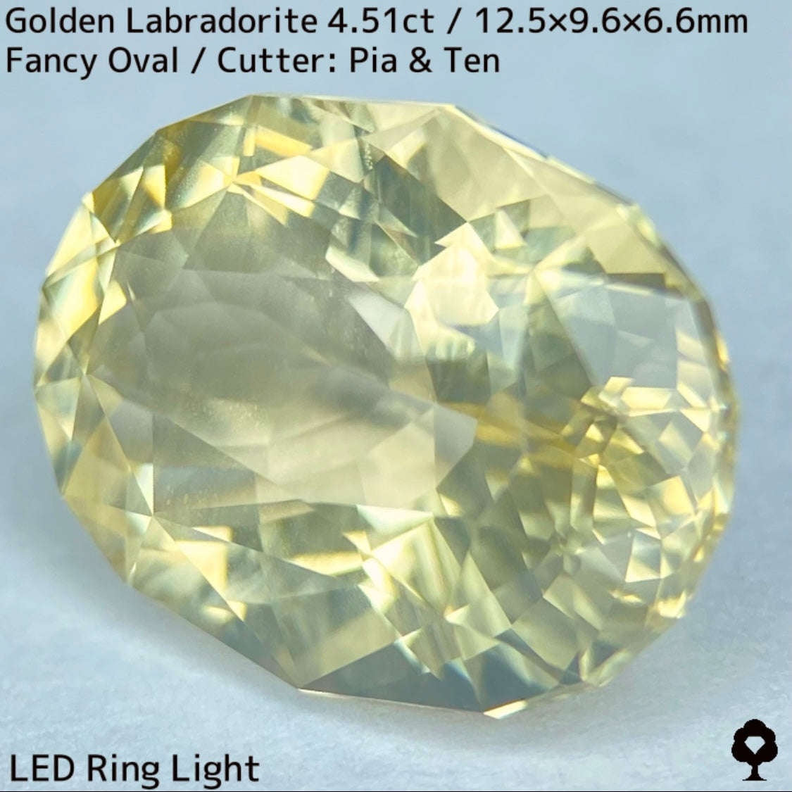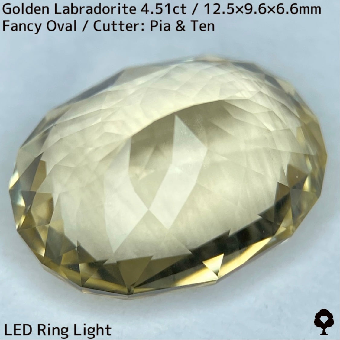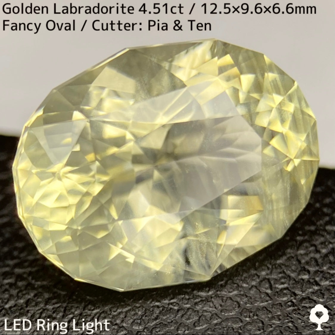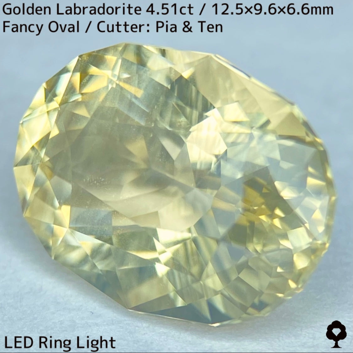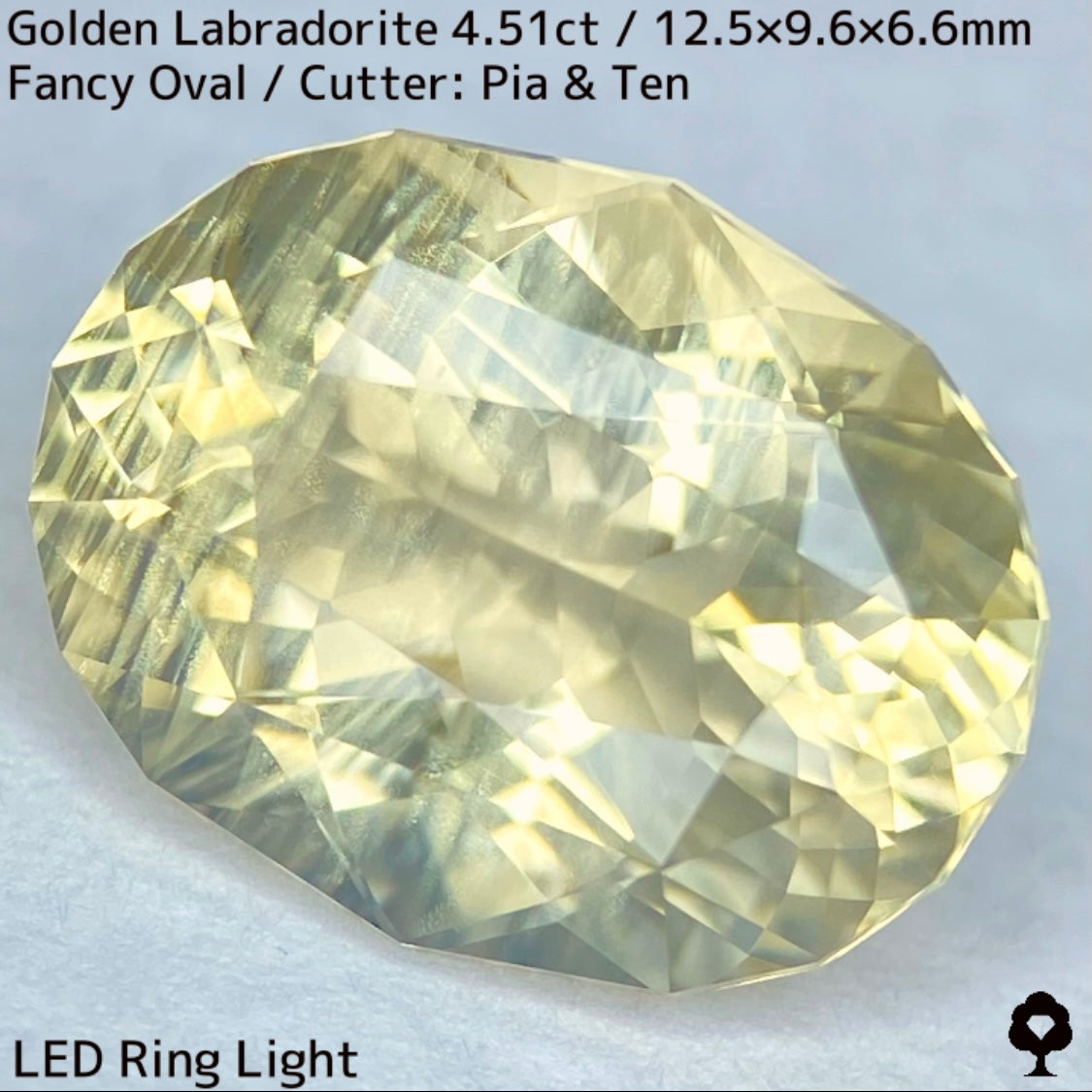 ゴールデンラブラドライト4.51ct★原石からつくりあげた虎のような千切りシラーが走る高貴なシャンパンゴールド★同じロットの原石付き