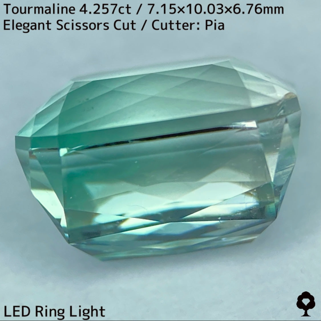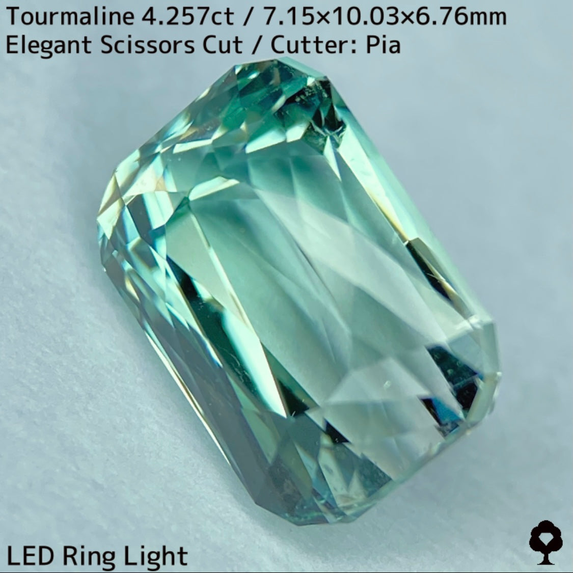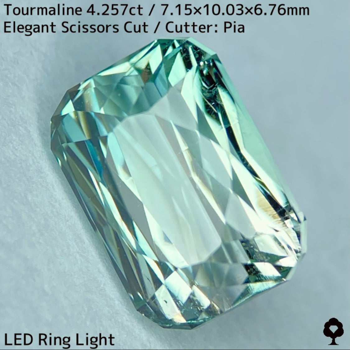 淡いミントカラーからカラーレスへとグラデーションがかった、たっぷりとしたボリュームとプロポーションのトルマリンを、輪郭を細かく縁取ったオクタゴン系シェイプのエレガントカットにし、シザースカットを入れた作品に仕上げました。