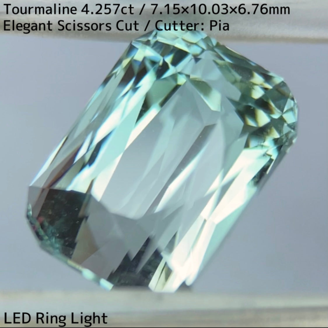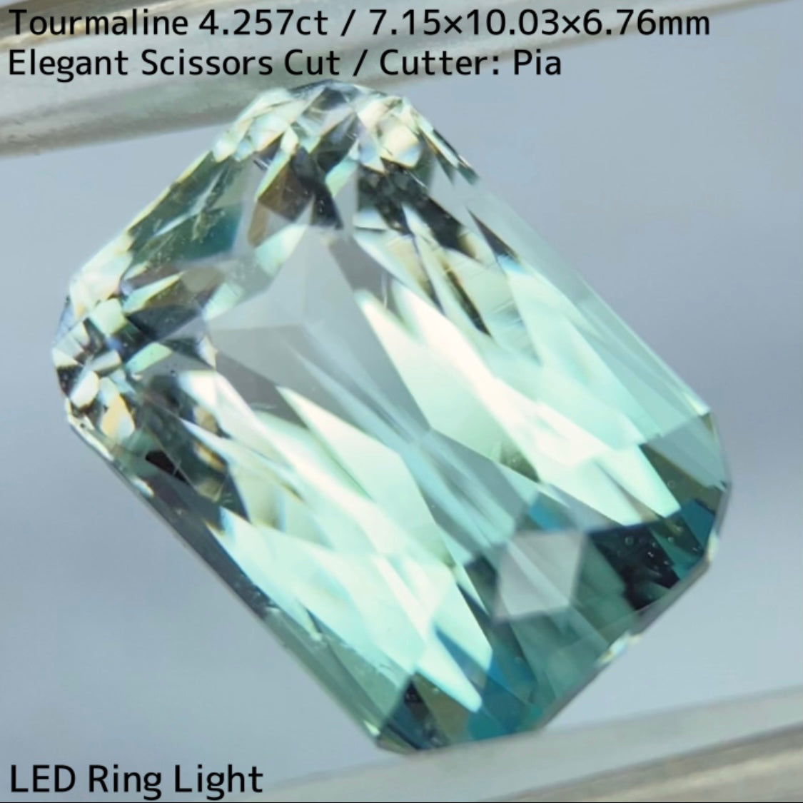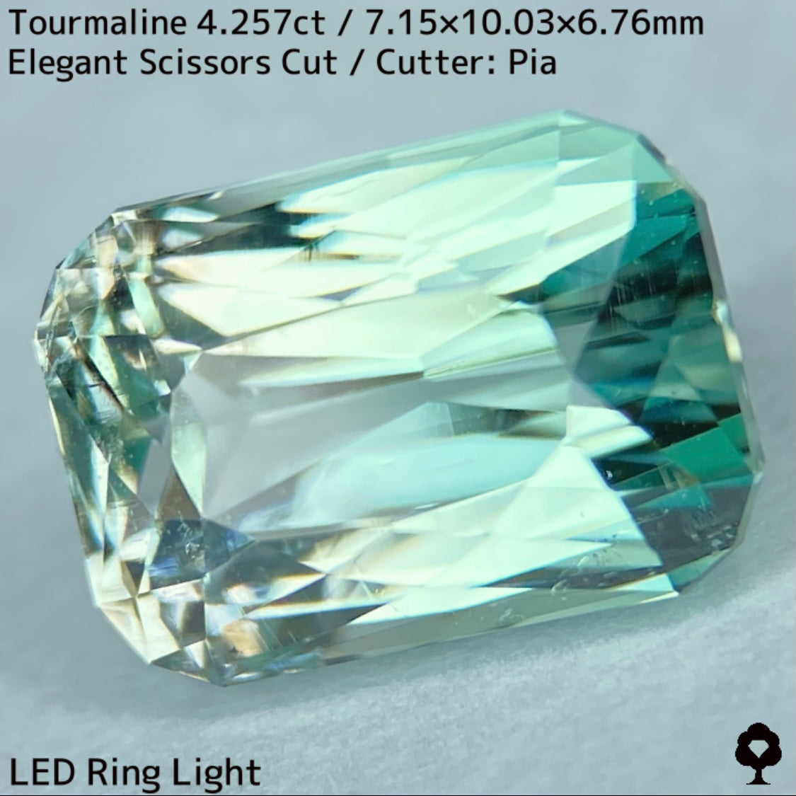 淡いミントカラーからカラーレスへとグラデーションがかった、たっぷりとしたボリュームとプロポーションのトルマリンを、輪郭を細かく縁取ったオクタゴン系シェイプのエレガントカットにし、シザースカットを入れた作品に仕上げました。