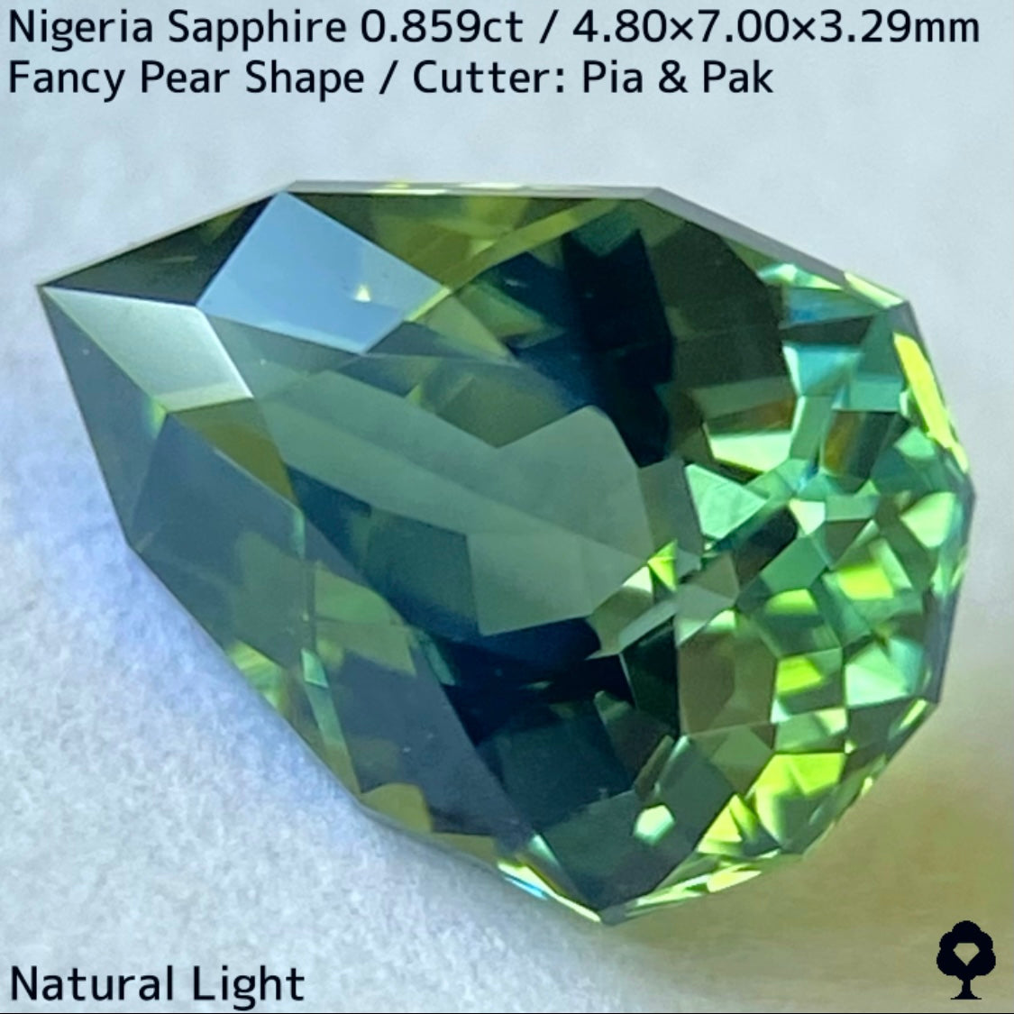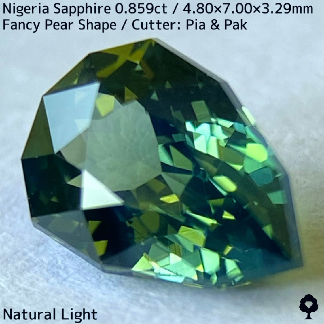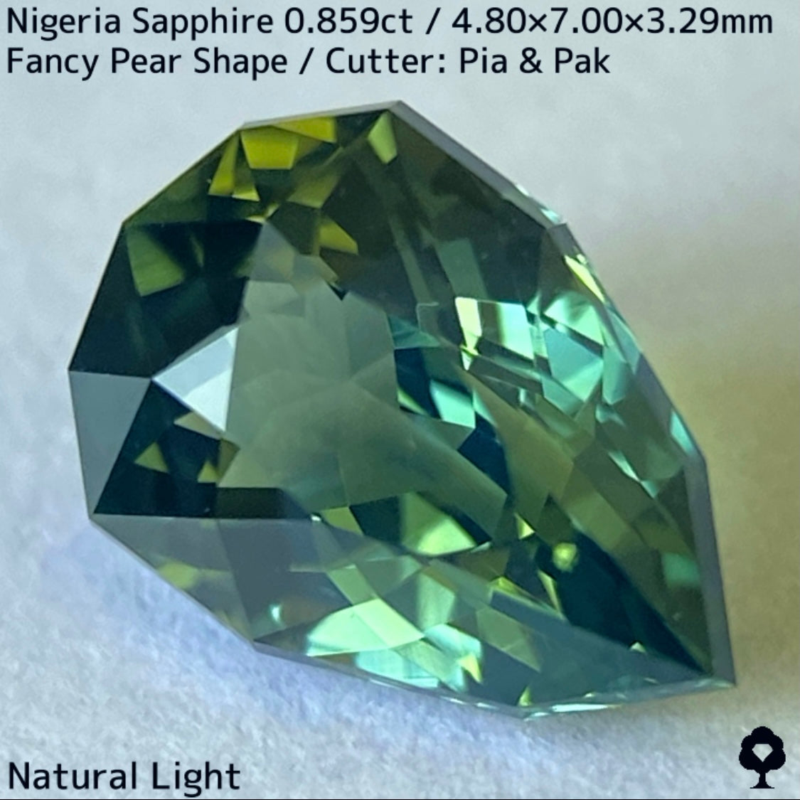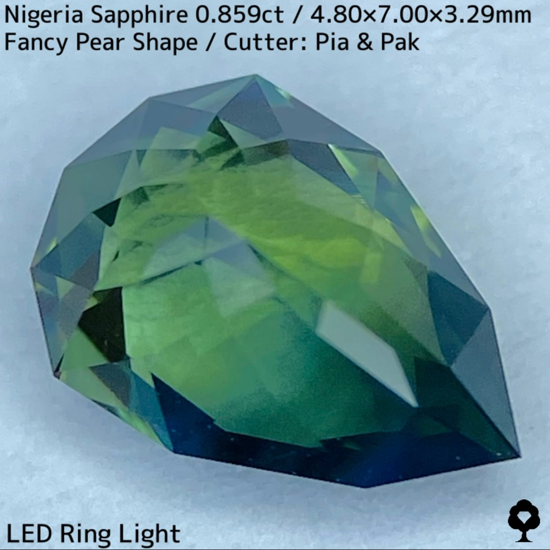 明るさのあるグリーンの美しい結晶にシルキーブルーがペアシェイプの先端から覆う、なんとも言えないカッコいい雰囲気のナイジェリア産ブルーイッシュグリーンサファイアです。