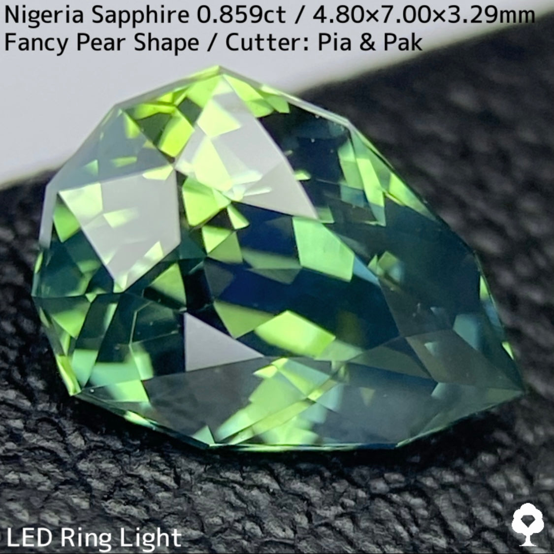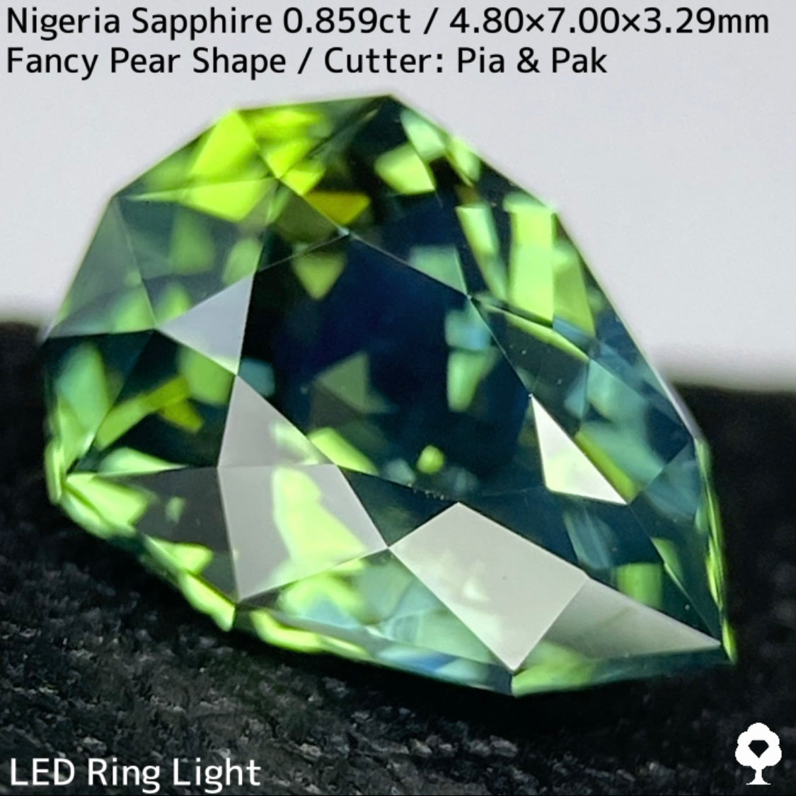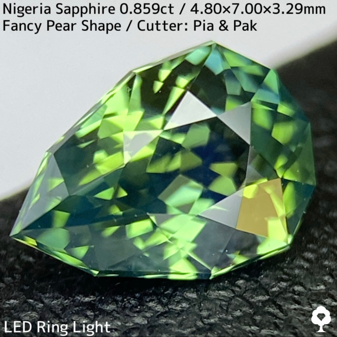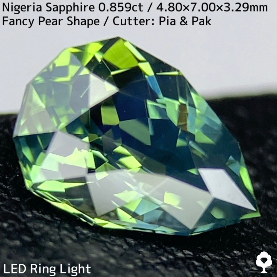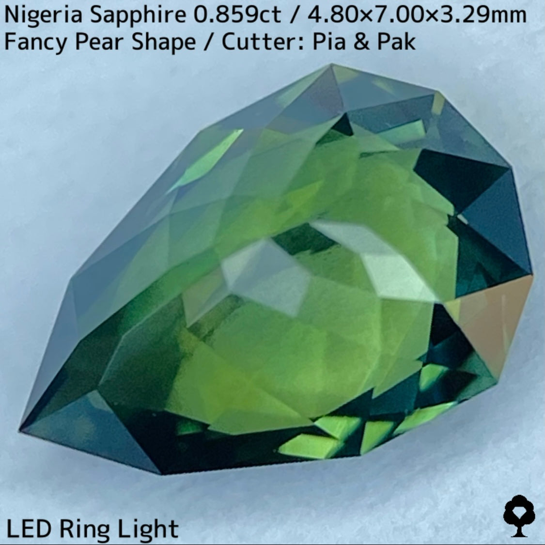 明るさのあるグリーンの美しい結晶にシルキーブルーがペアシェイプの先端から覆う、なんとも言えないカッコいい雰囲気のナイジェリア産ブルーイッシュグリーンサファイアです。
