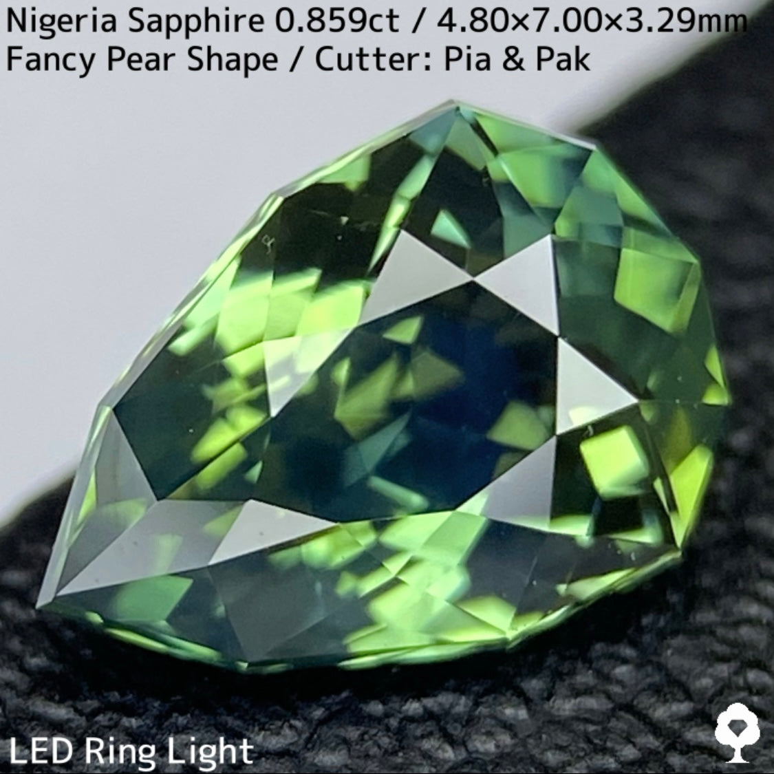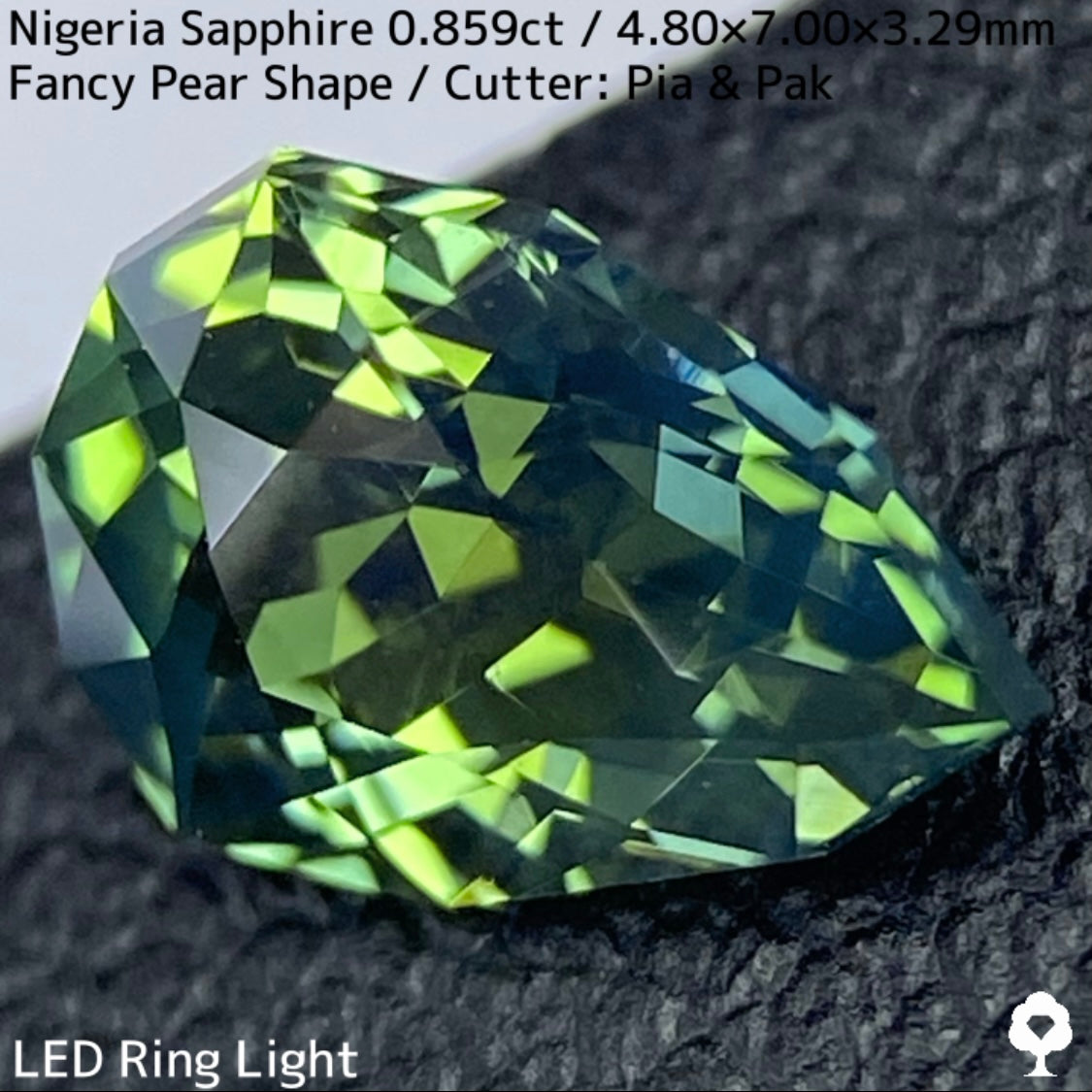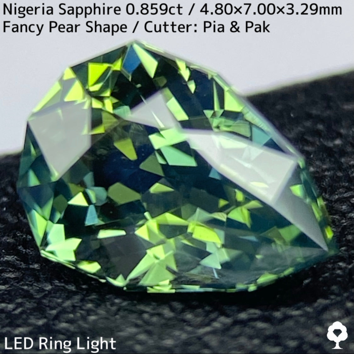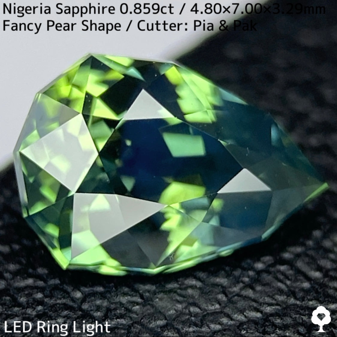 明るさのあるグリーンの美しい結晶にシルキーブルーがペアシェイプの先端から覆う、なんとも言えないカッコいい雰囲気のナイジェリア産ブルーイッシュグリーンサファイアです。