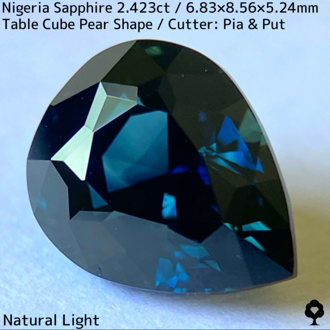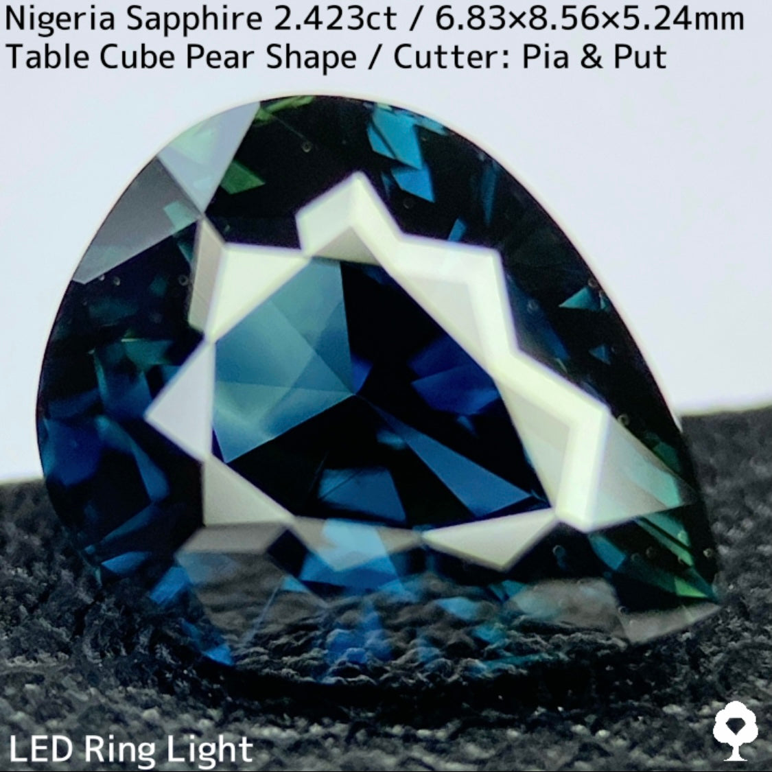 ペアシェイプのパビリオン側は端正なステップカットで、クラウン側にはテーブルの周りに変則的な箱のカタチが浮かぶテーブルキューブカットが施されています。