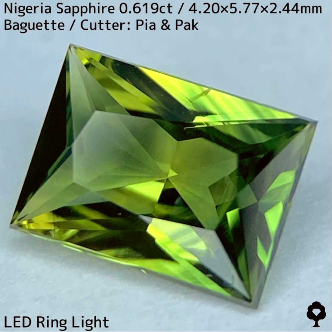 スッキリとしたイエローにブルーの色だまりやカラーバンドがあり、プリンセスカットを長くしたようなシャープなカットデザインのバゲットに仕上げられパーティ感あるグリーンの煌めきを放つナイジェリア産サファイアです。