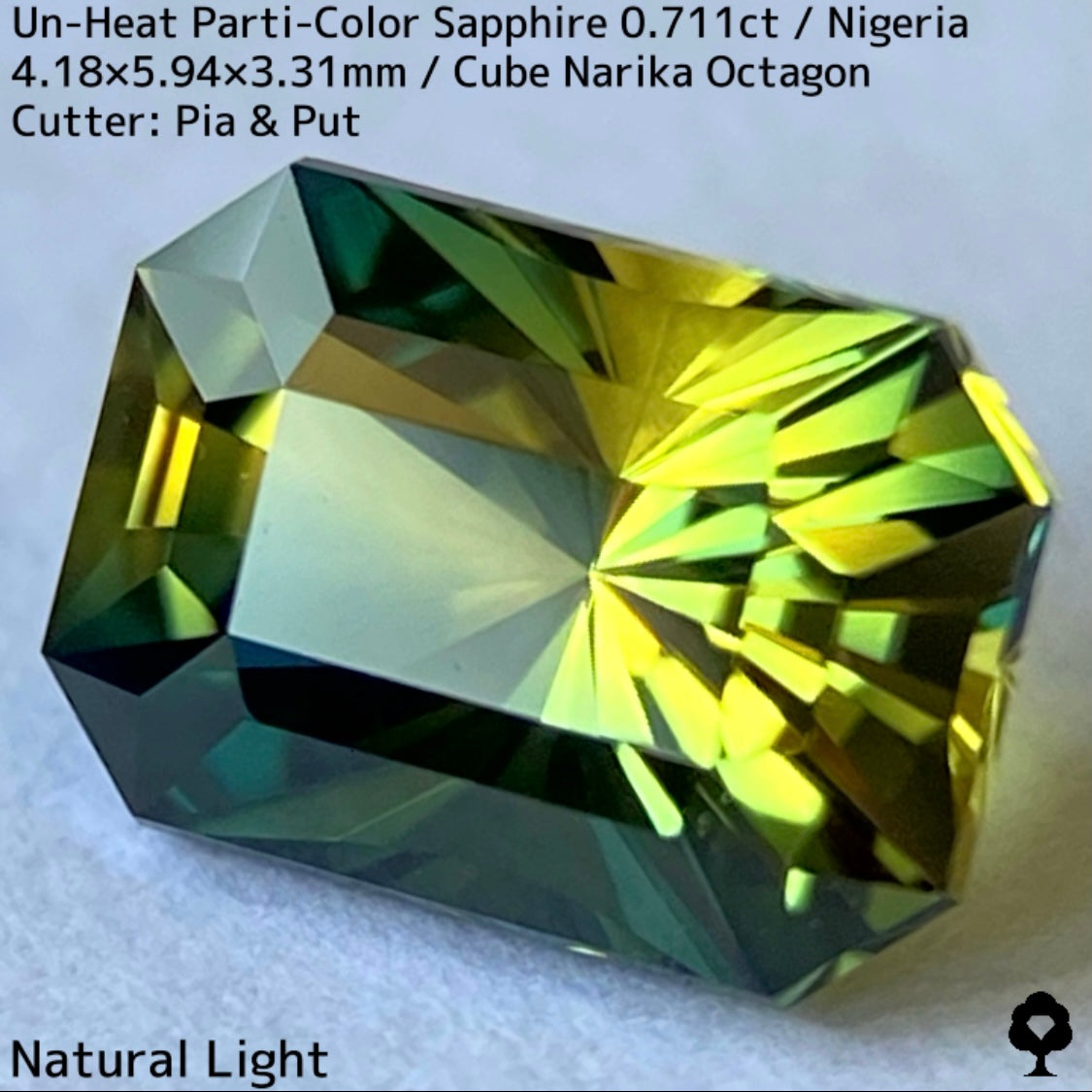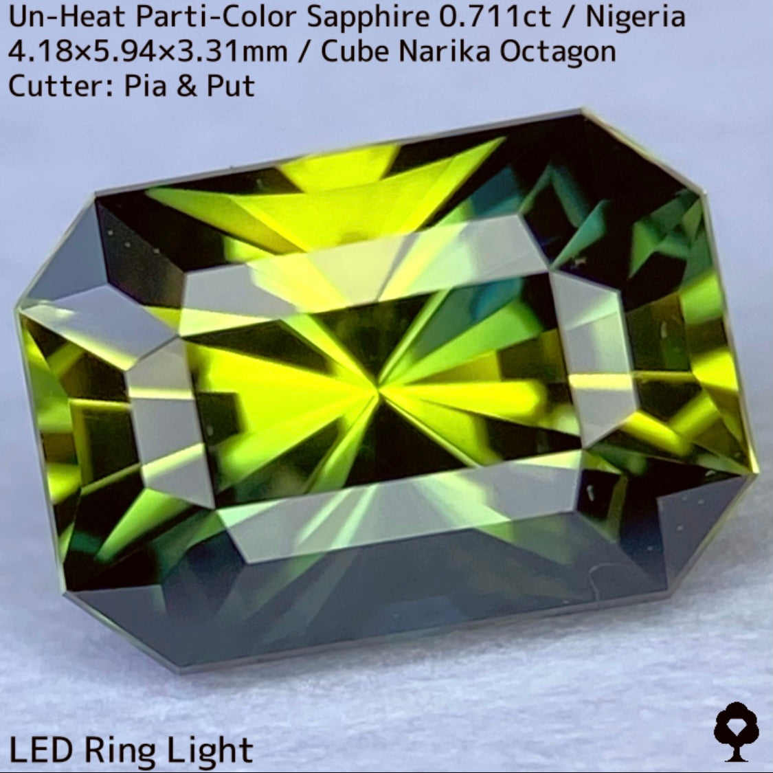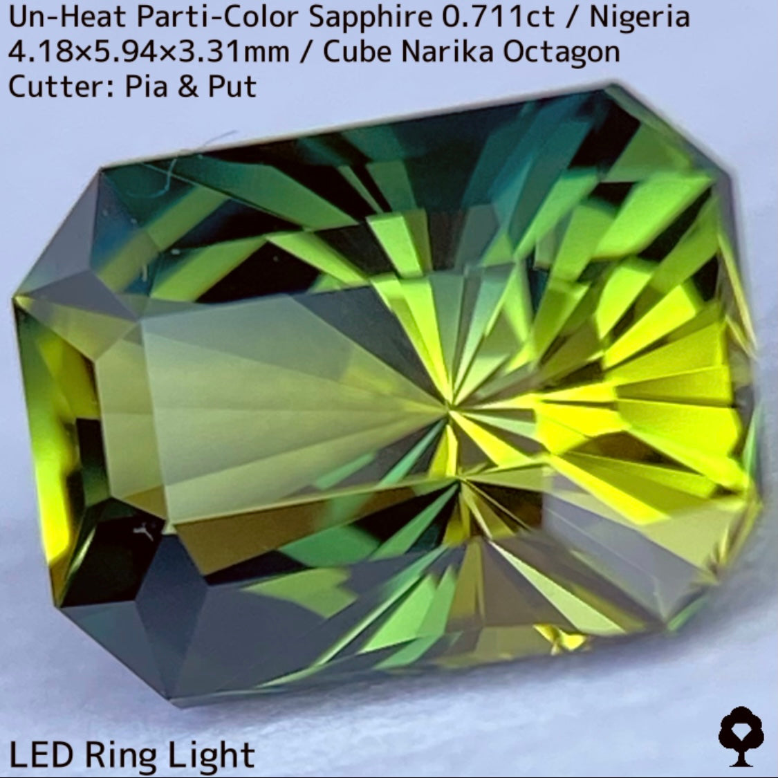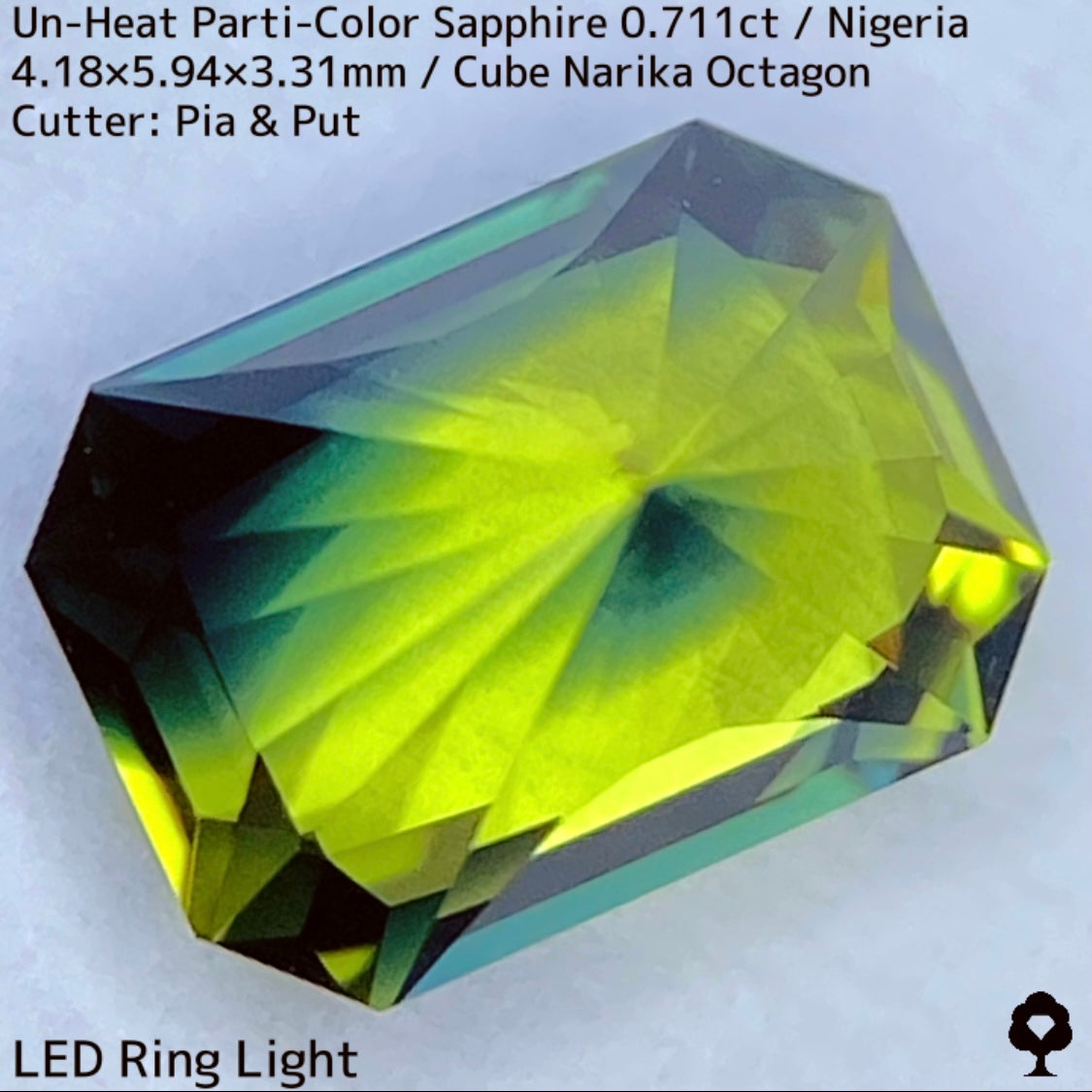 タイ語で時計を意味するナリカーカットに仕上げられた一石で、抜群の透明度のイエローの部分にインディゴの色合いが反射して混ざり合い、軽く色がカクテルされたイエローとグリーンの煌めきがとても美しいです。