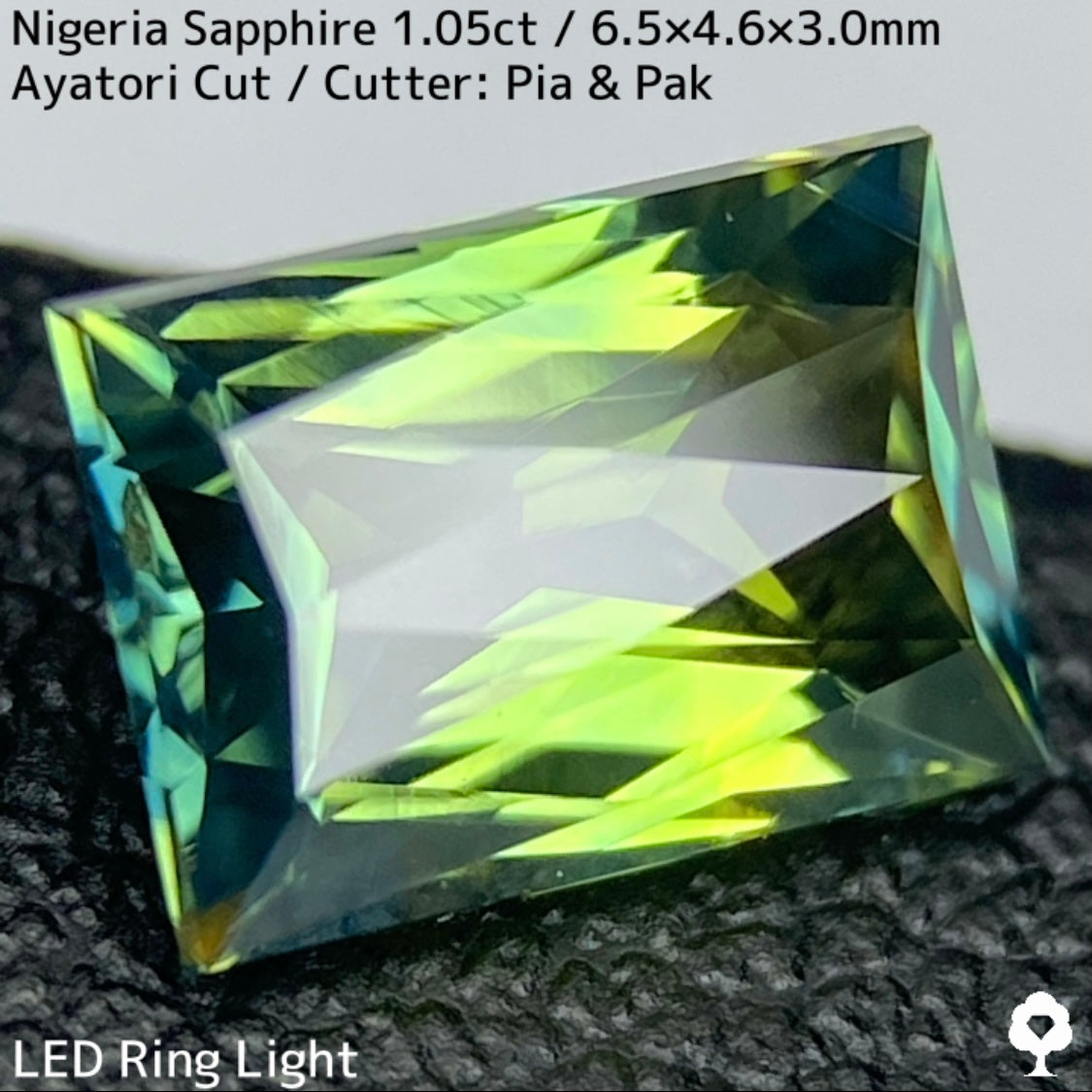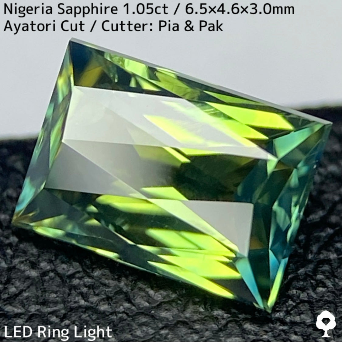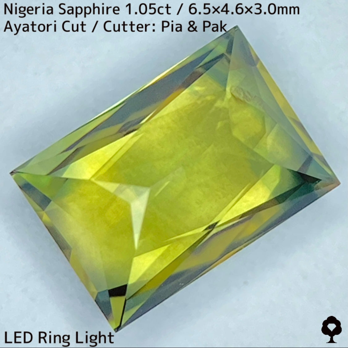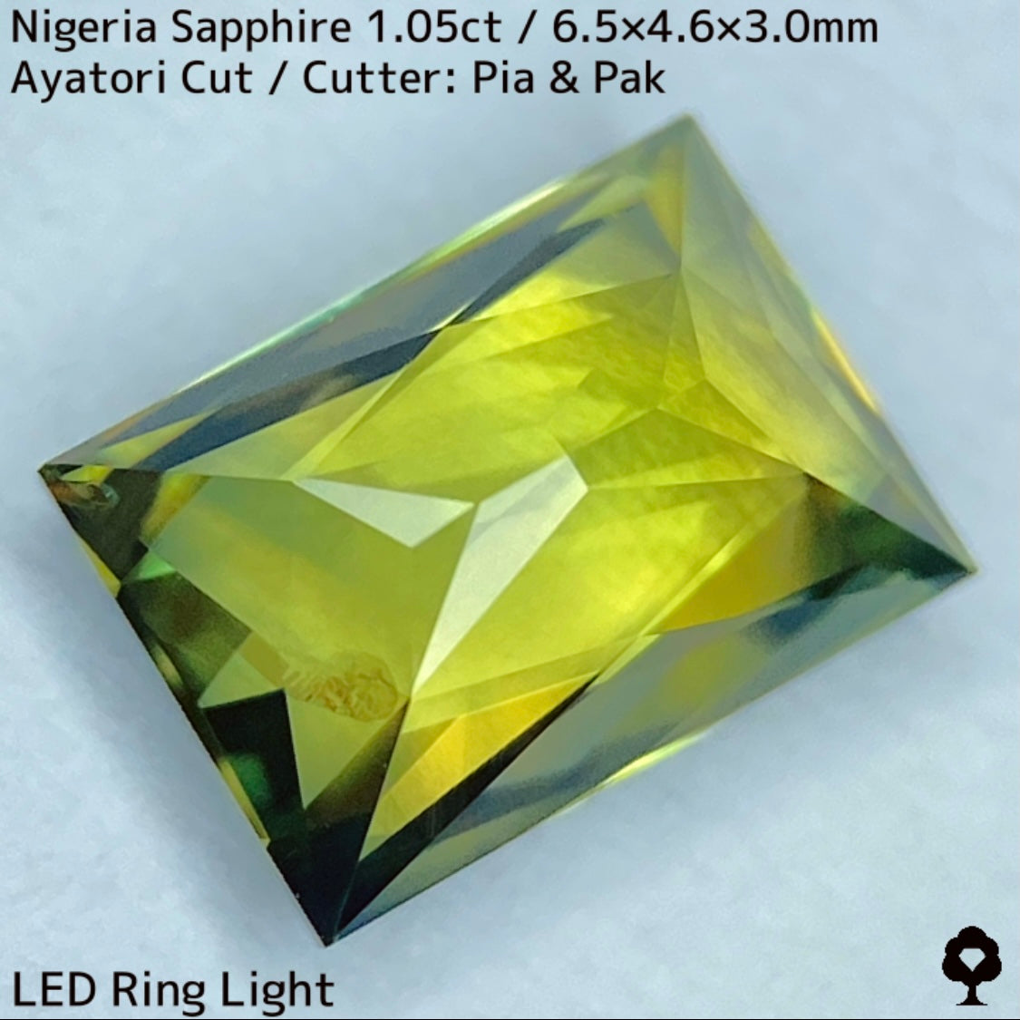 明るいイエローにブルーの色だまりがあることによって色が混ざり合い、パーティ感のあるイエローイッシュグリーンの煌めきが美しいナイジェリア産サファイアです。