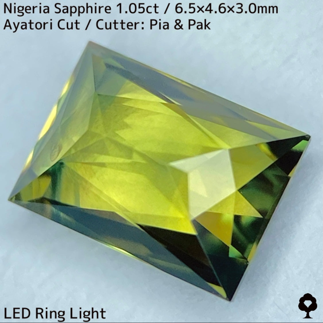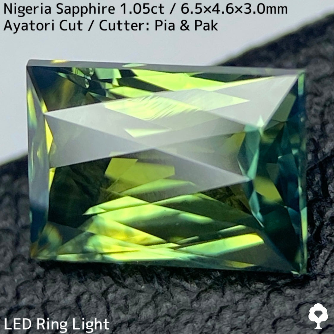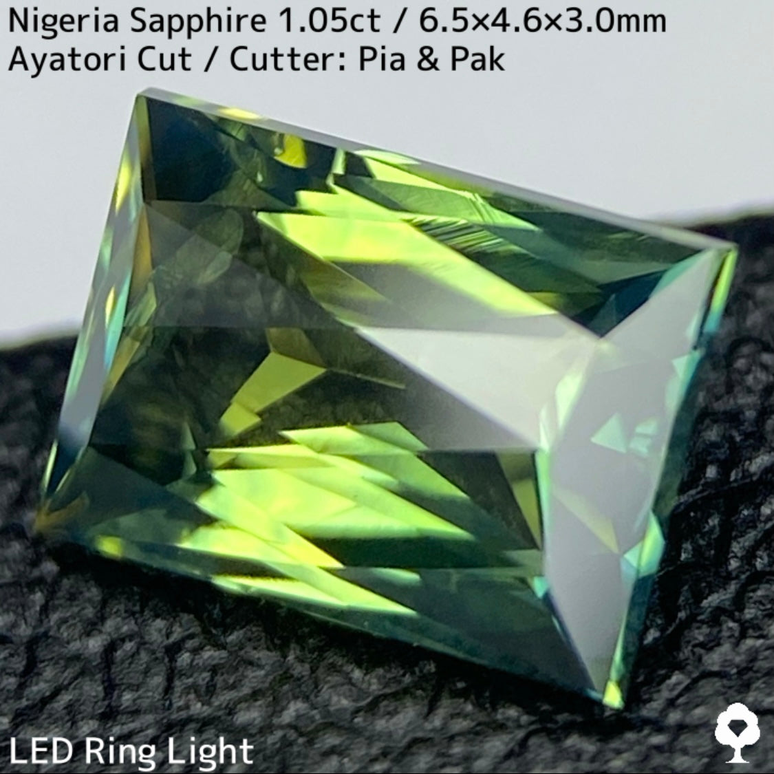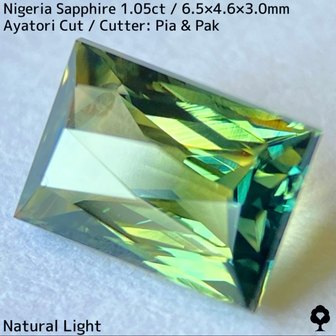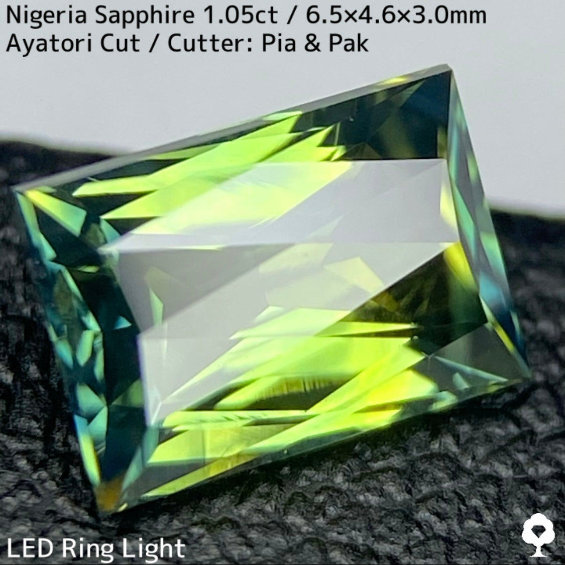 明るいイエローにブルーの色だまりがあることによって色が混ざり合い、パーティ感のあるイエローイッシュグリーンの煌めきが美しいナイジェリア産サファイアです。
