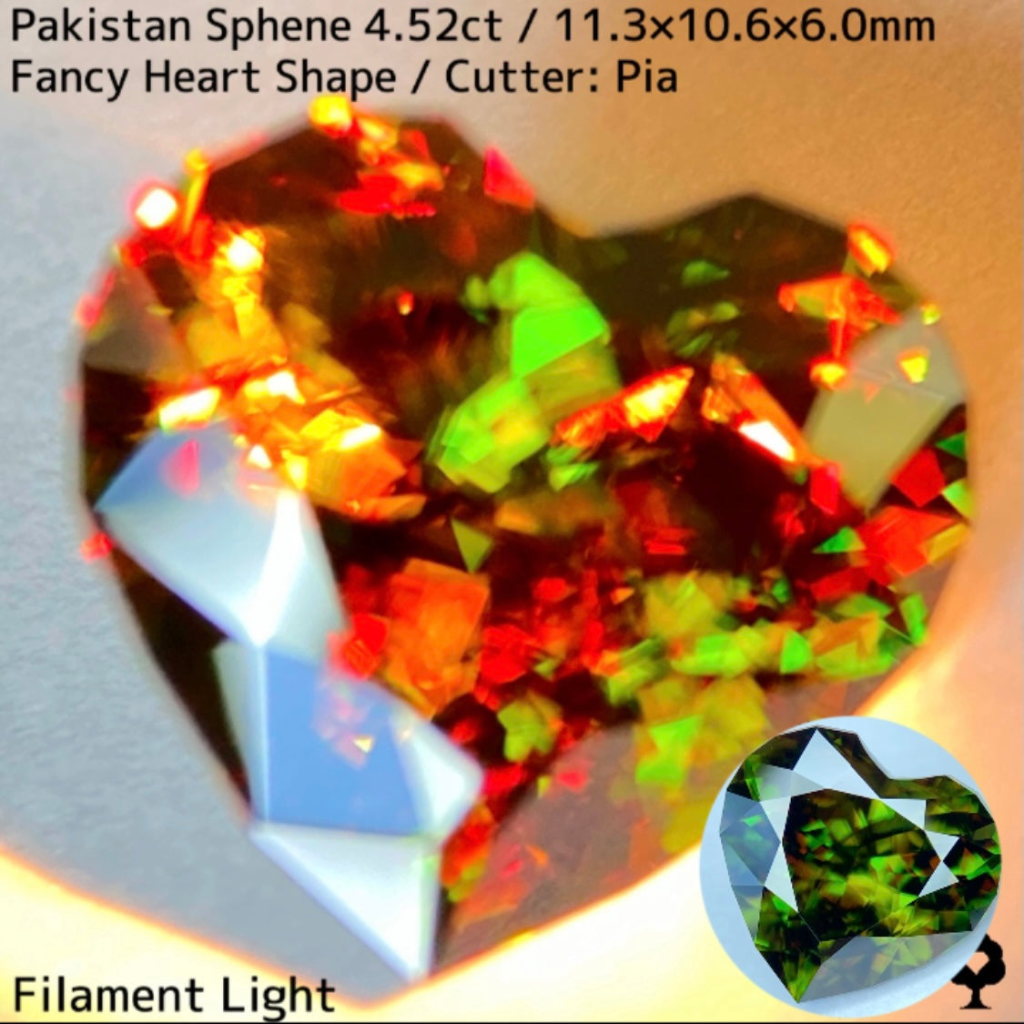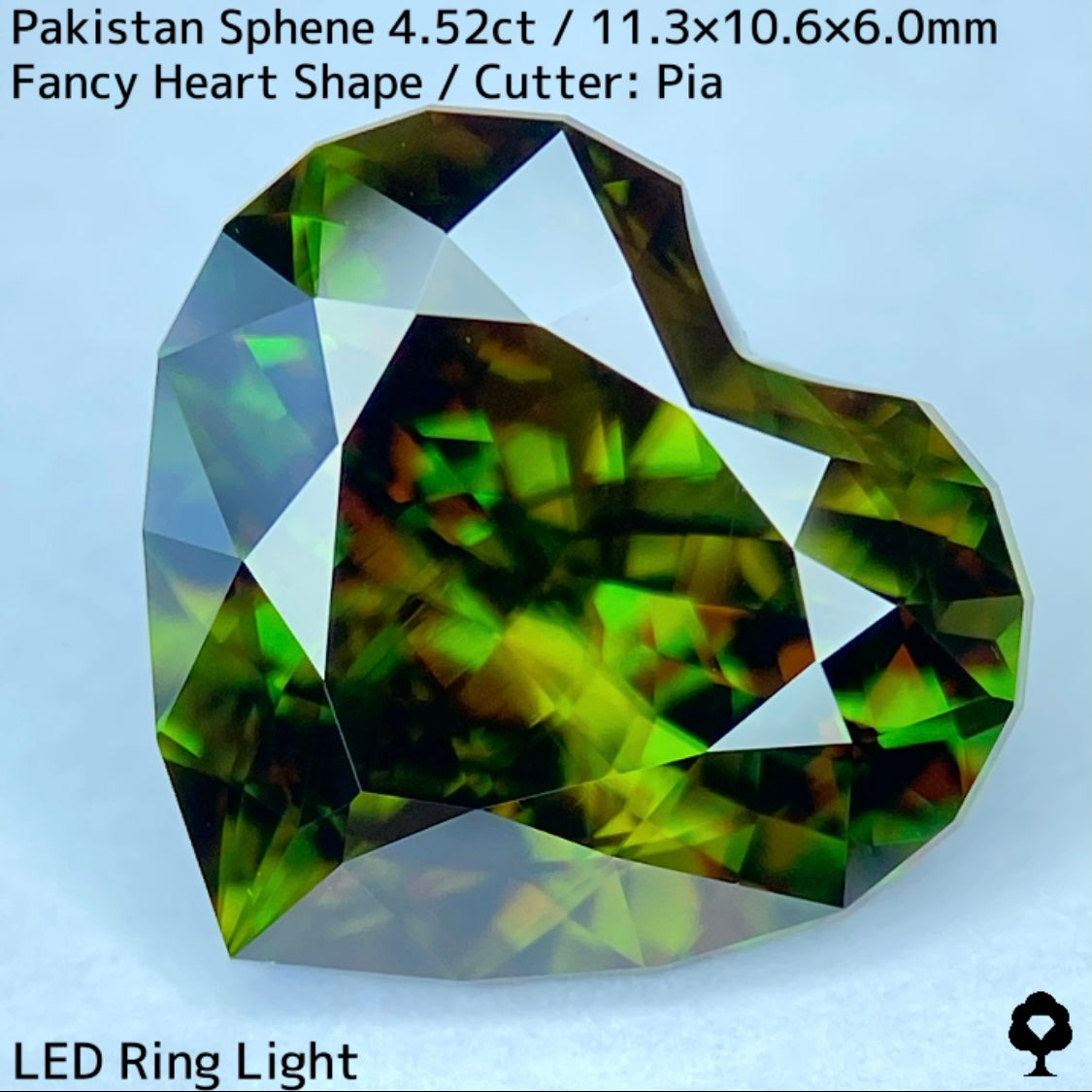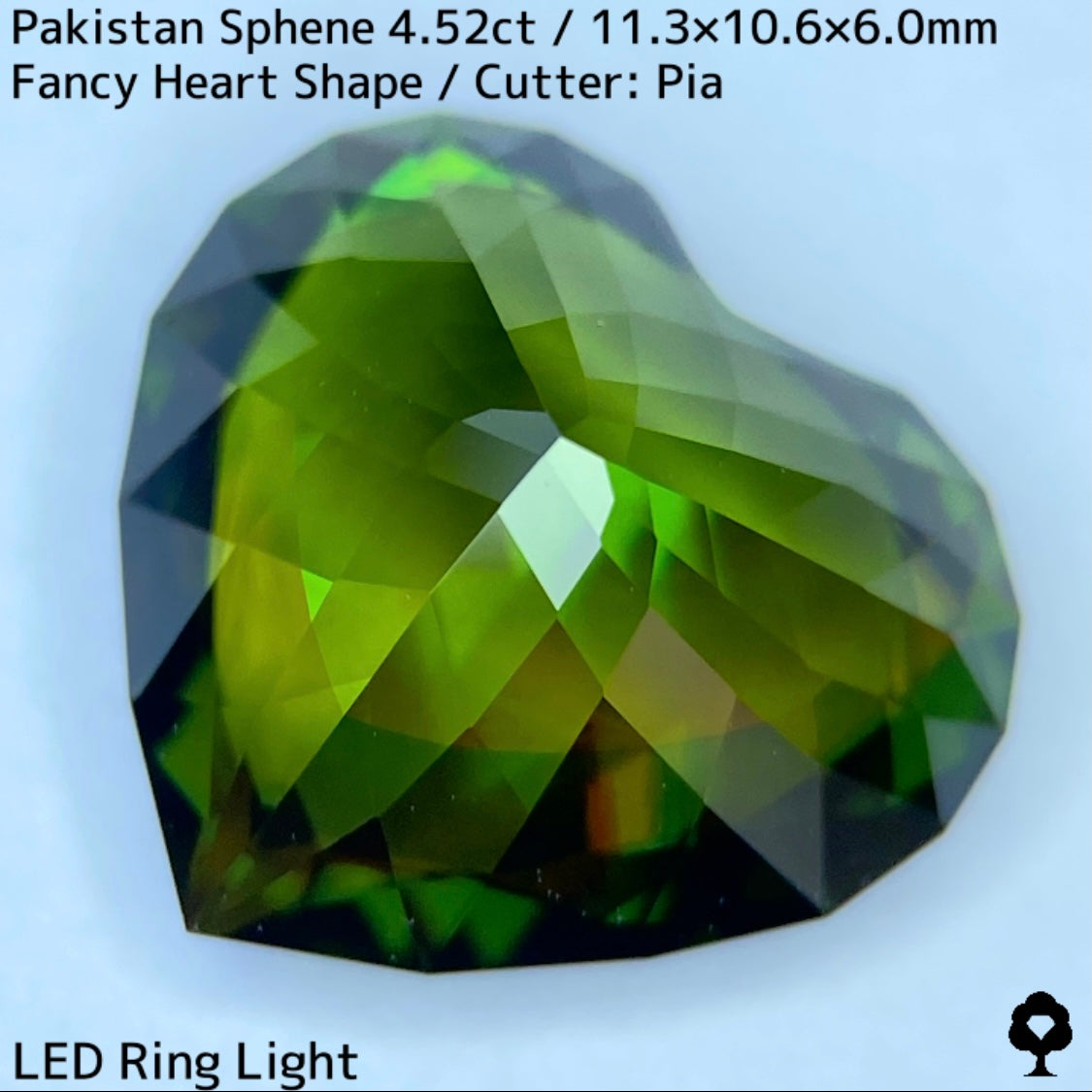 濃色の地色から鮮やかなグリーンの煌めきを放つパキスタンスフェーンを、輪郭を縁取ったファンシーハートシェイプに仕上げた一石です。
