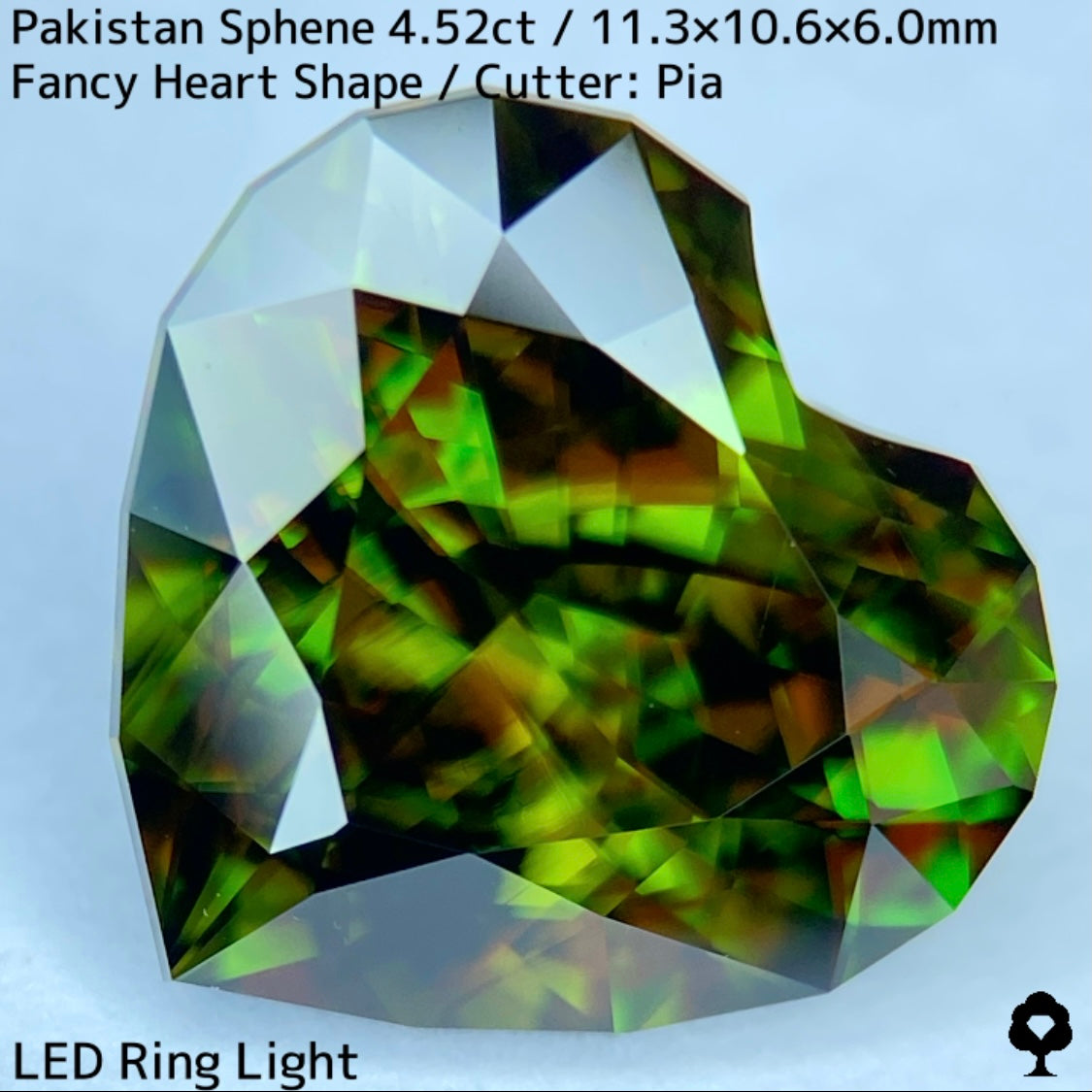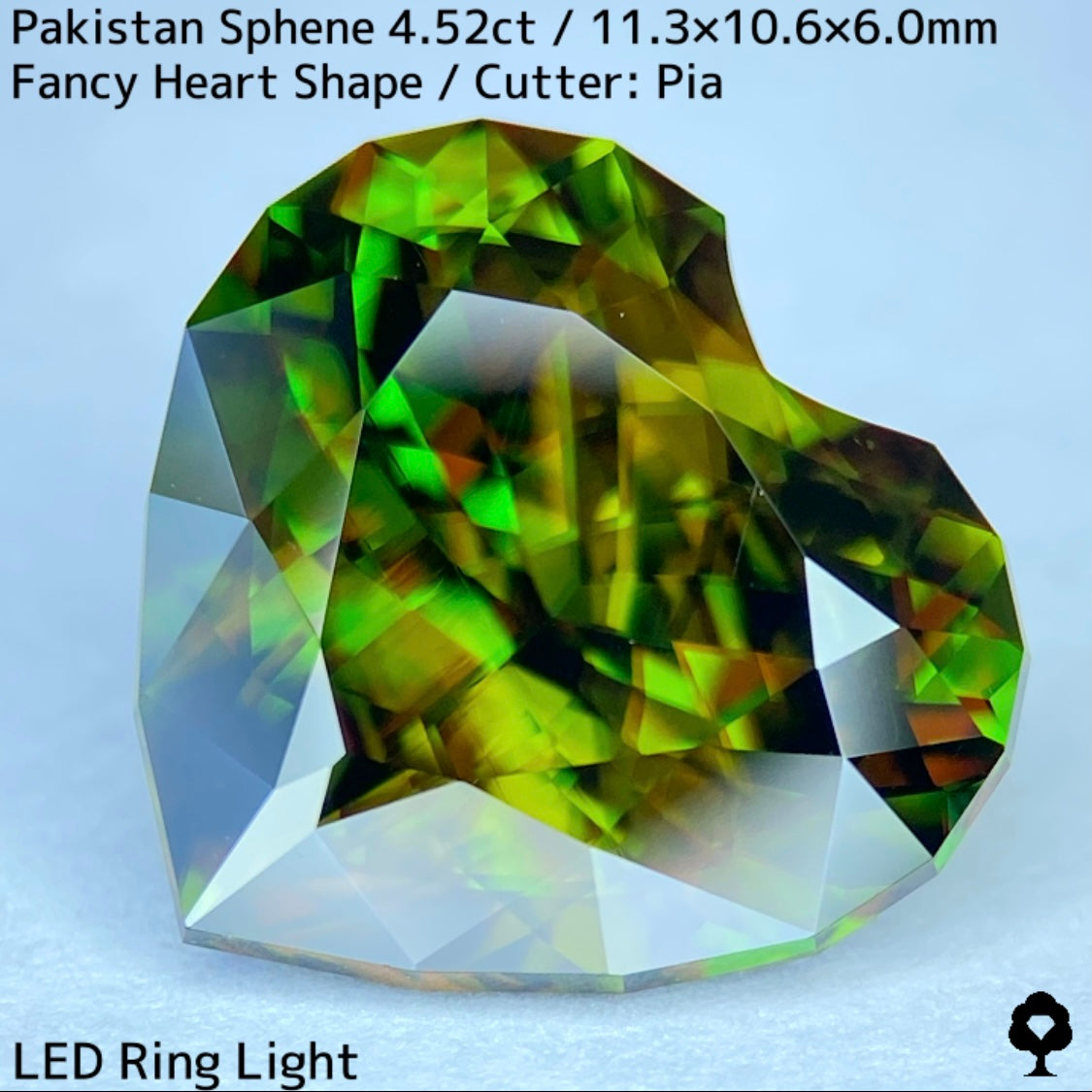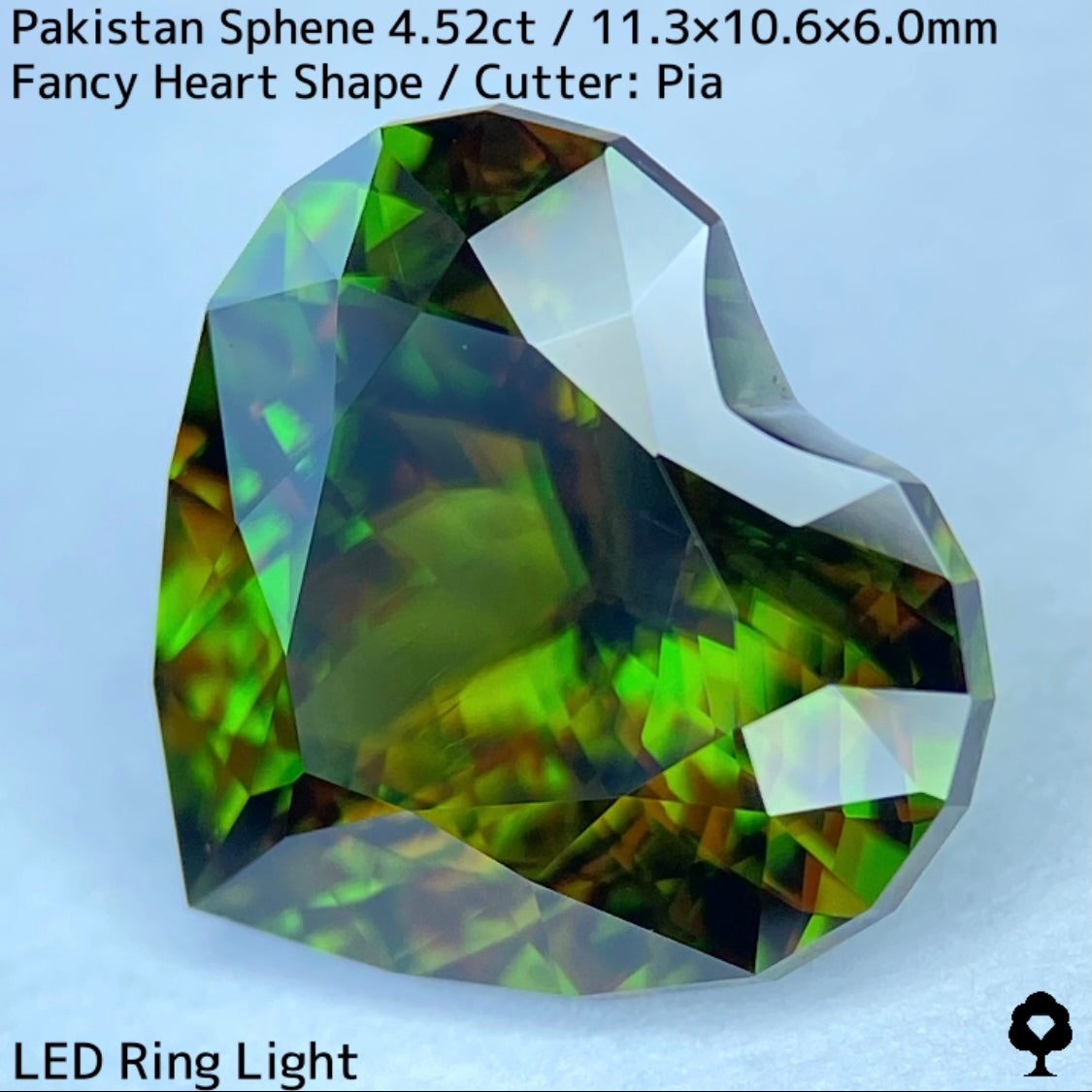 濃色の地色から鮮やかなグリーンの煌めきを放つパキスタンスフェーンを、輪郭を縁取ったファンシーハートシェイプに仕上げた一石です。