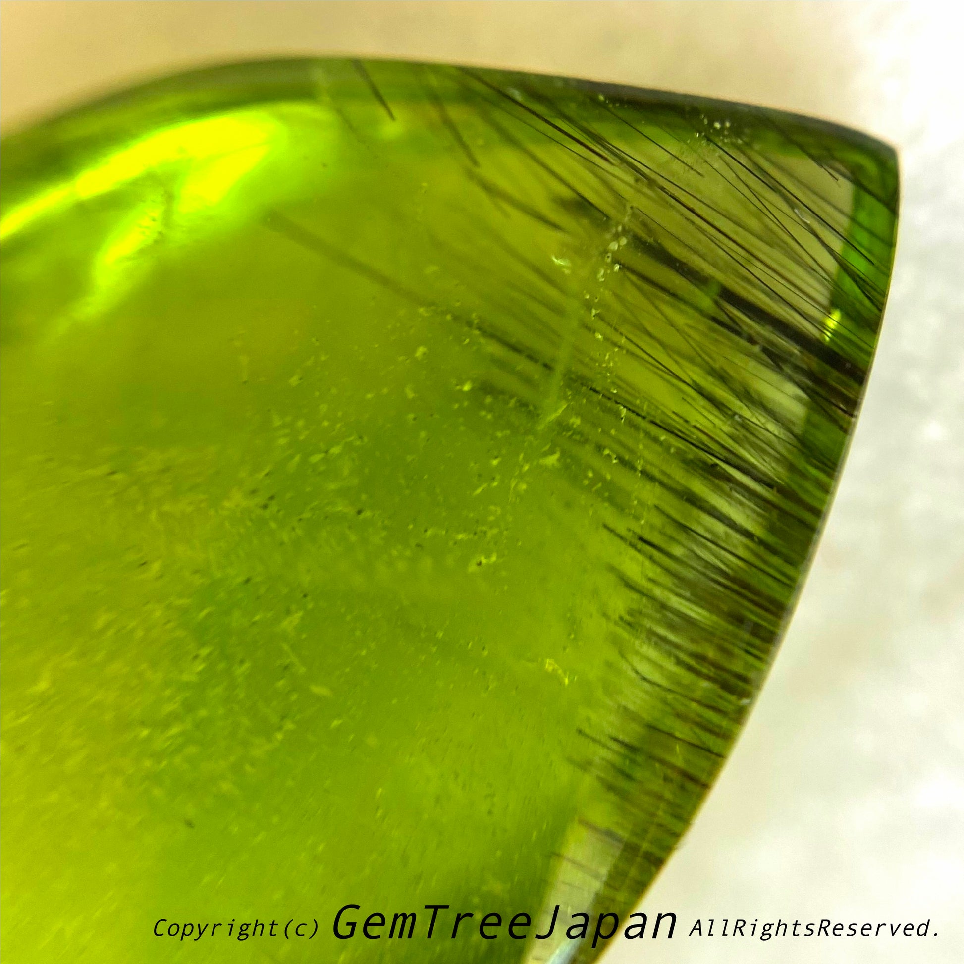 しっかりとしたペリドットグリーンの色合いと、パキスタン産の特徴とも言える個性的な「毛髪」のような内包物を有する大粒19ct。