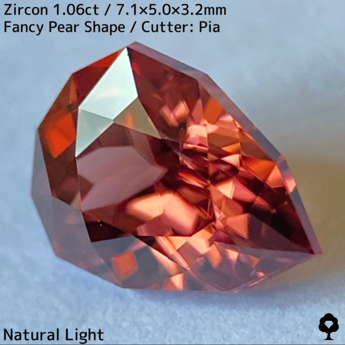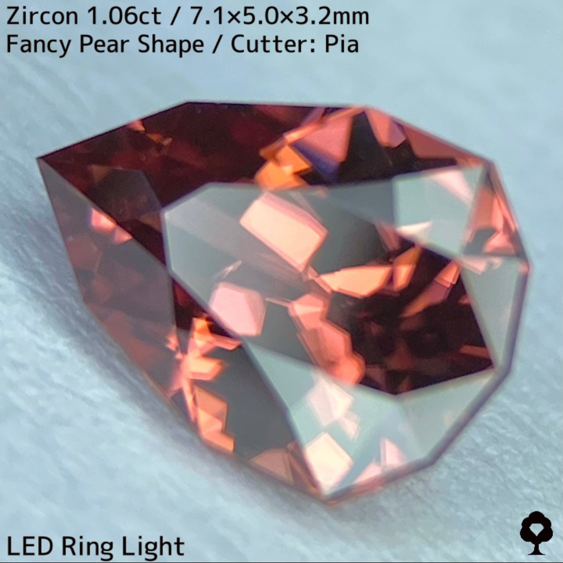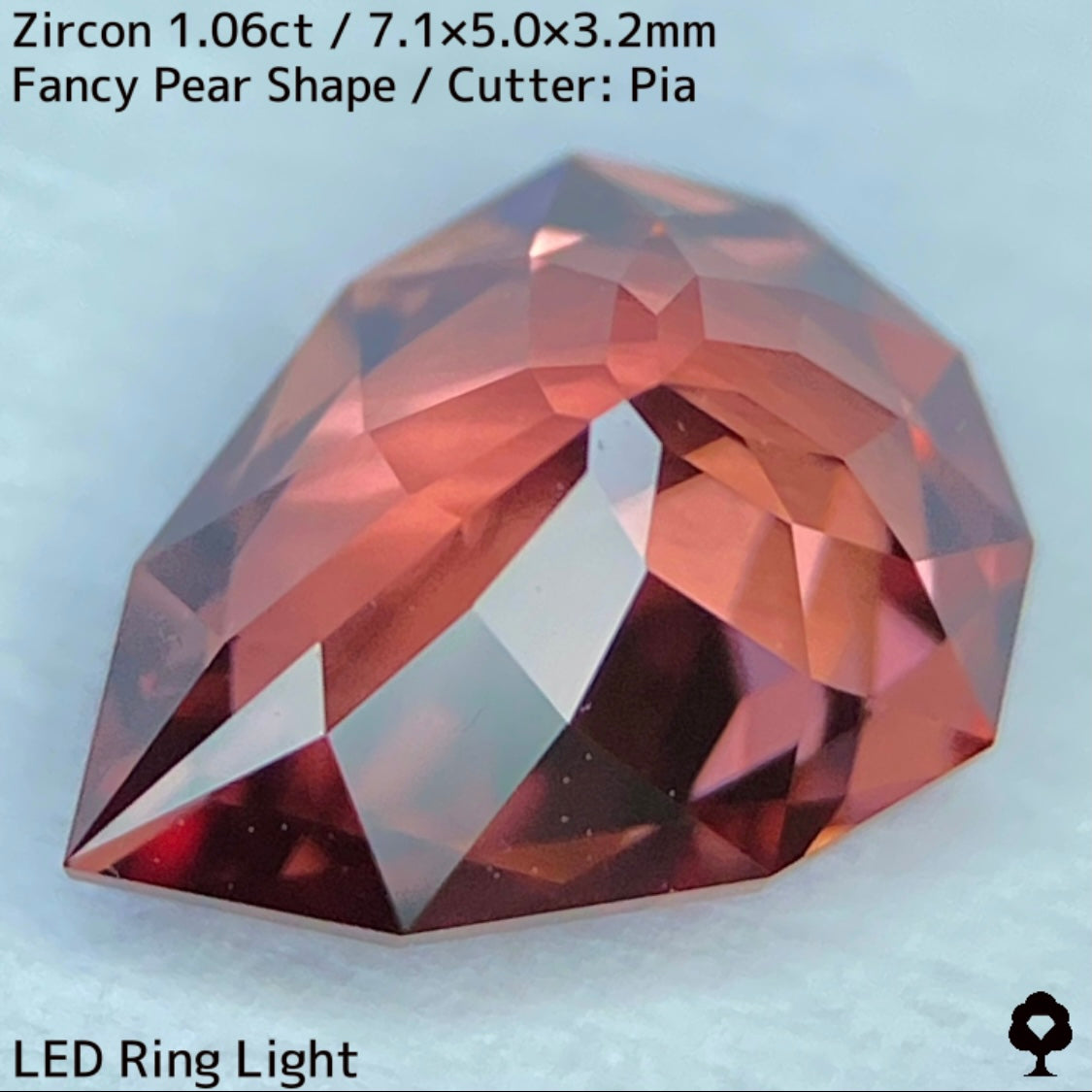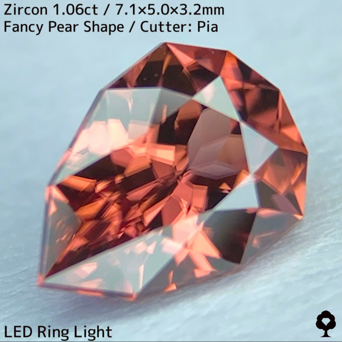 ピンクの混ざったオレンジの美色秋色カラーのジルコンで、目立った内包物の無い美しい結晶を輪郭を縁取ったファンシーペアシェイプに仕上げた一石です。