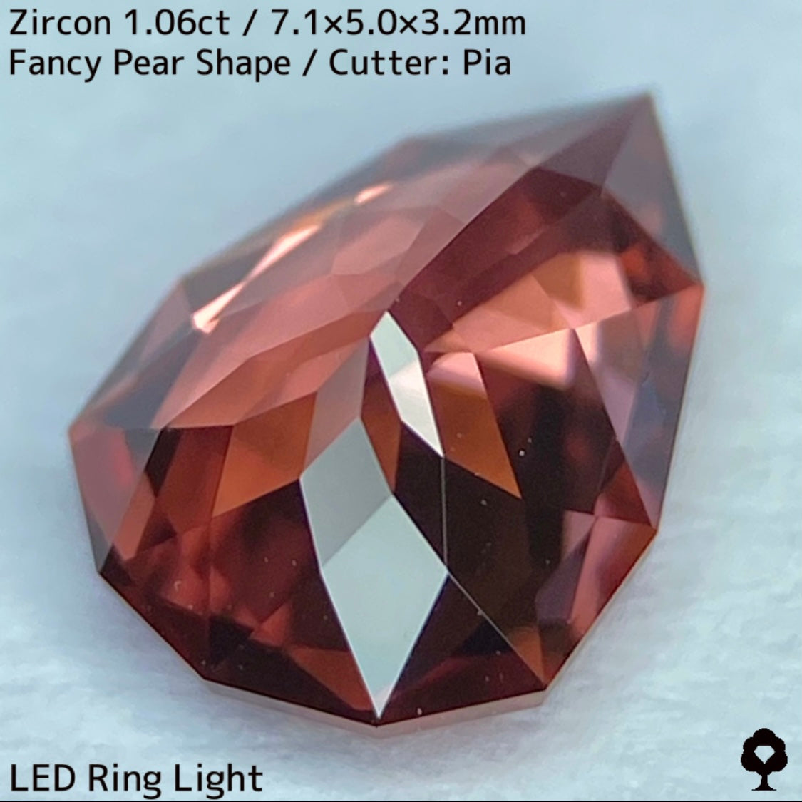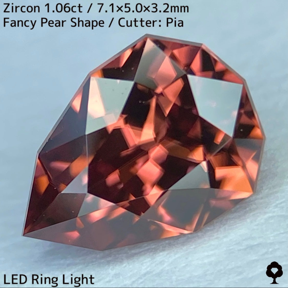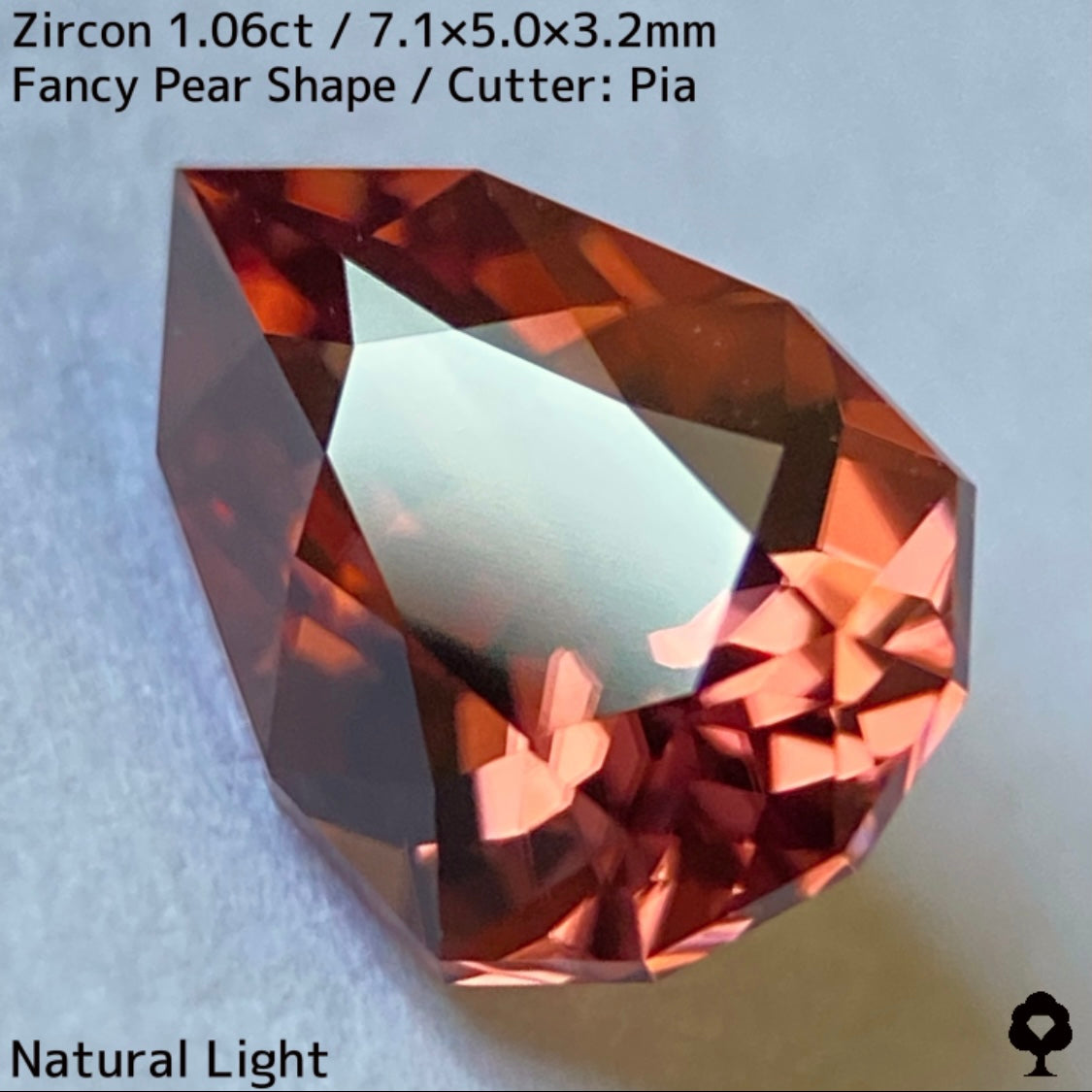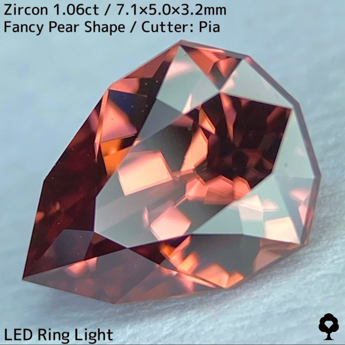 ピンクの混ざったオレンジの美色秋色カラーのジルコンで、目立った内包物の無い美しい結晶を輪郭を縁取ったファンシーペアシェイプに仕上げた一石です。