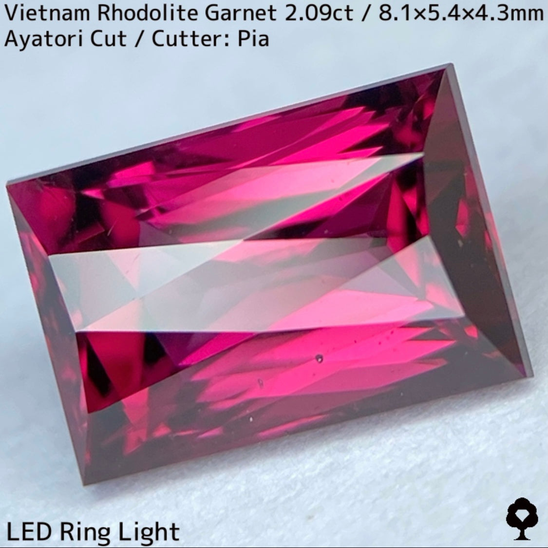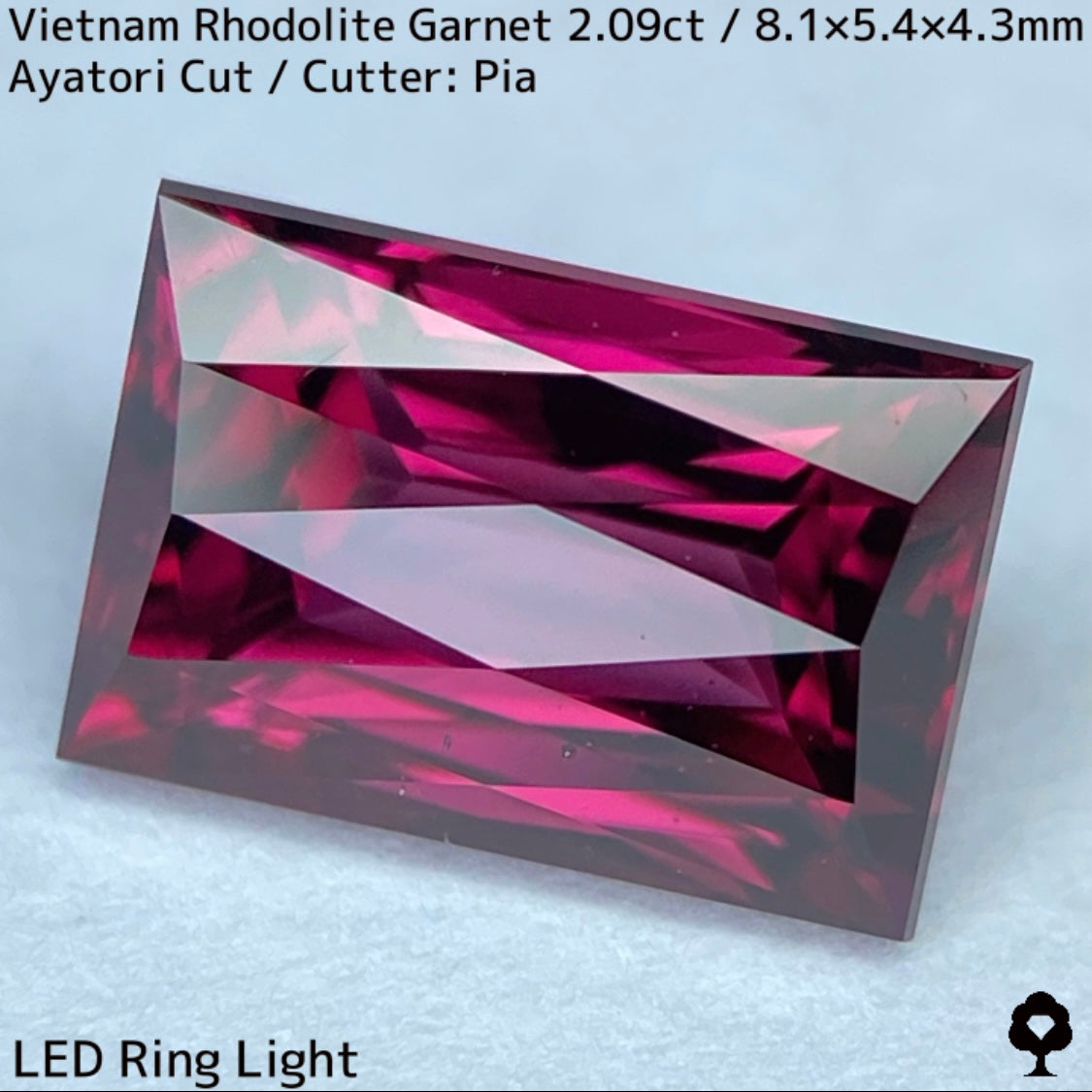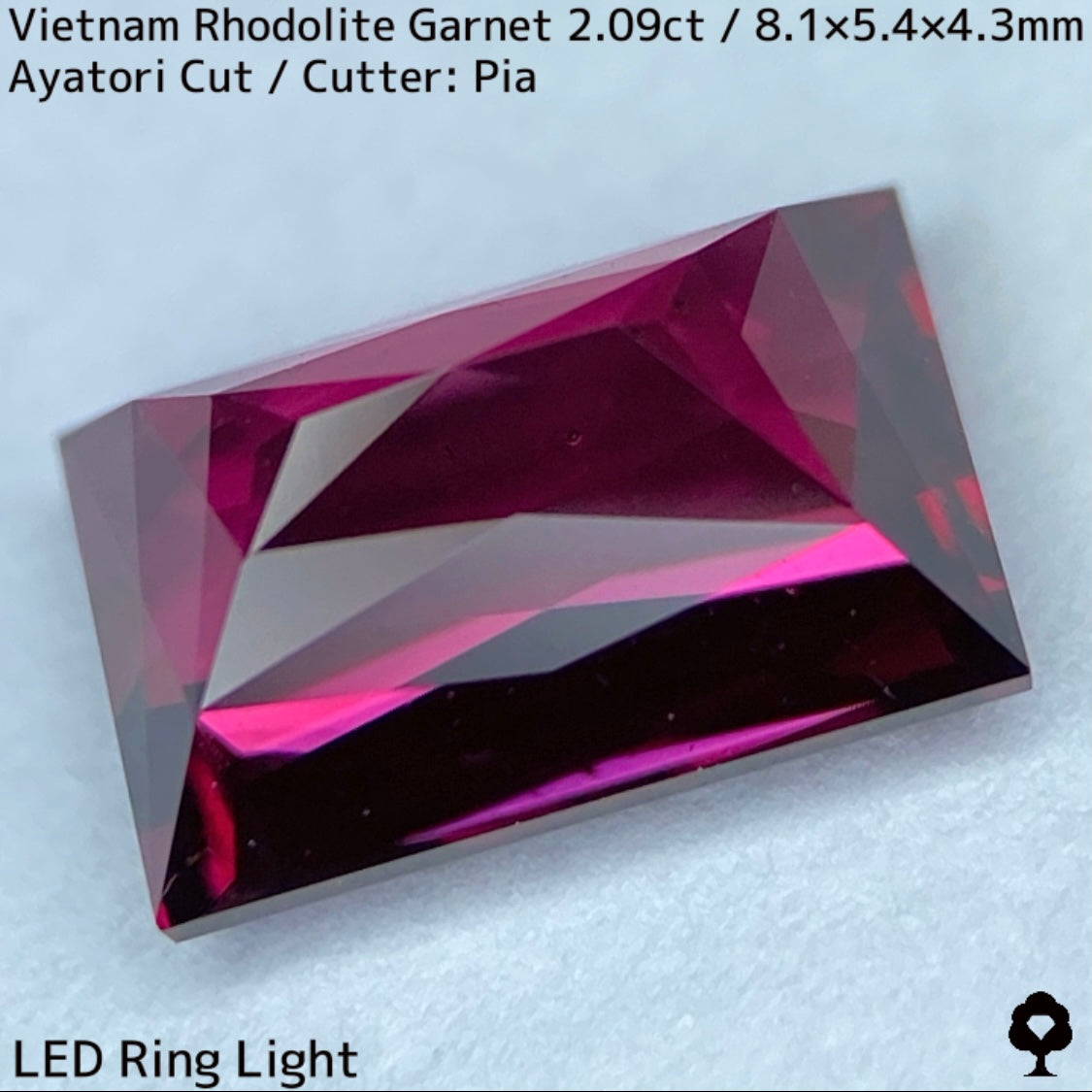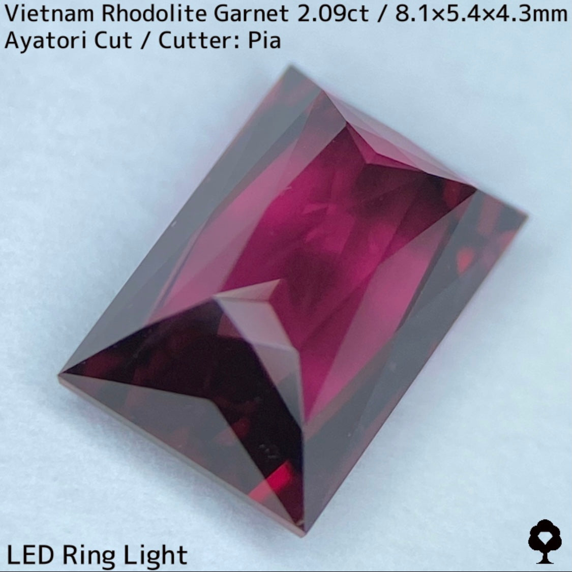 流通量の少ないベトナム産のロードライトガーネットで、赤とオレンジとパープルが混ざり合った濃厚な薔薇色の一石を、シザースカットの極みと言えるアヤトリカットに仕上げました。