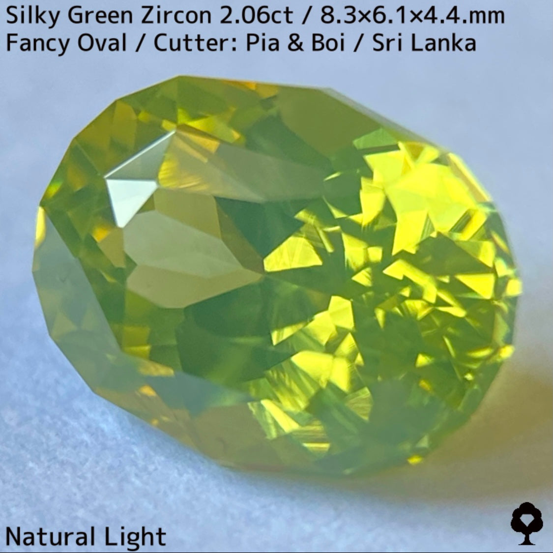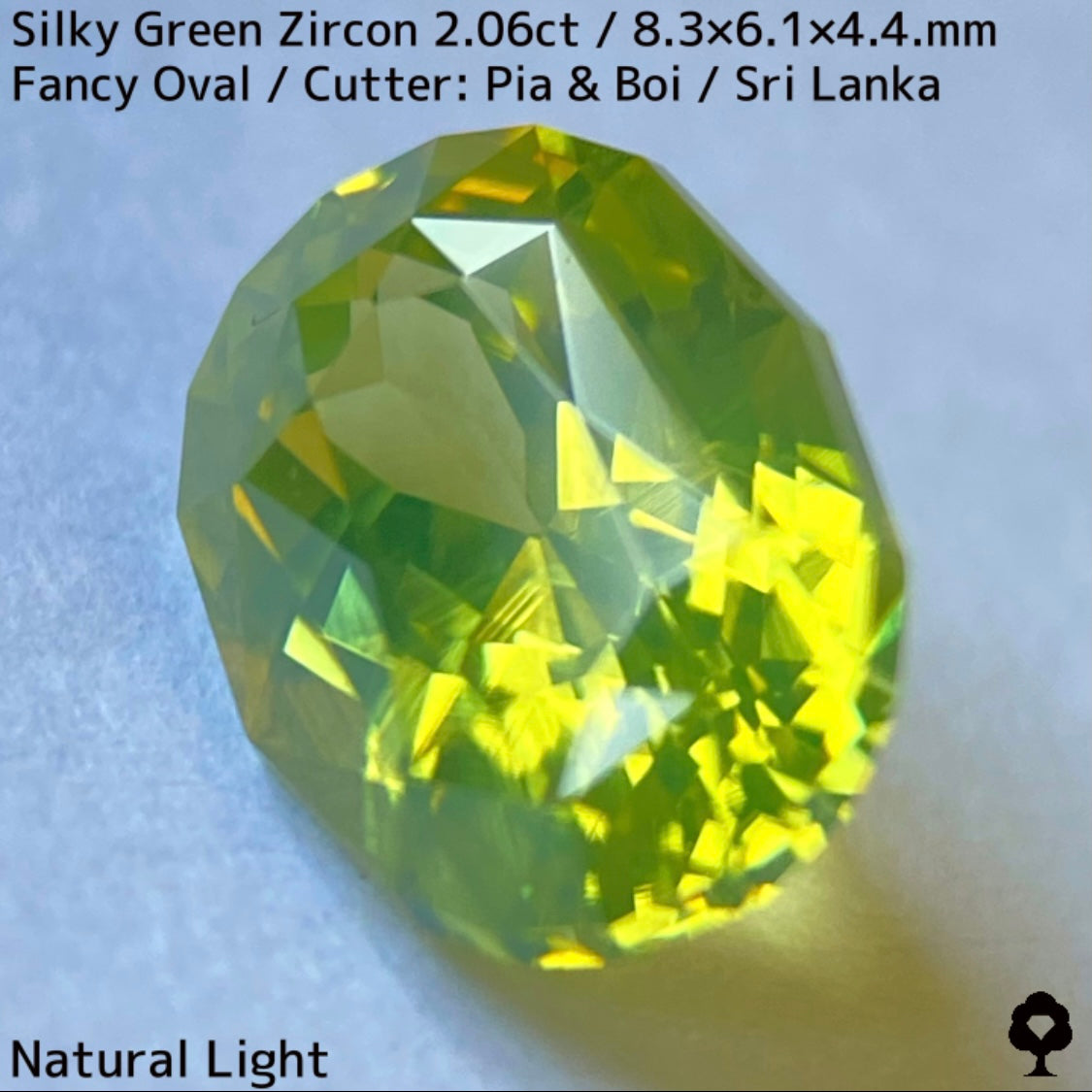 シルキーさが全体にある希少なグリーンジルコンで、柔らかな雰囲気がありつつもジルコンらしく煌めきが強くてカラフルなファイアーも放ちます。
