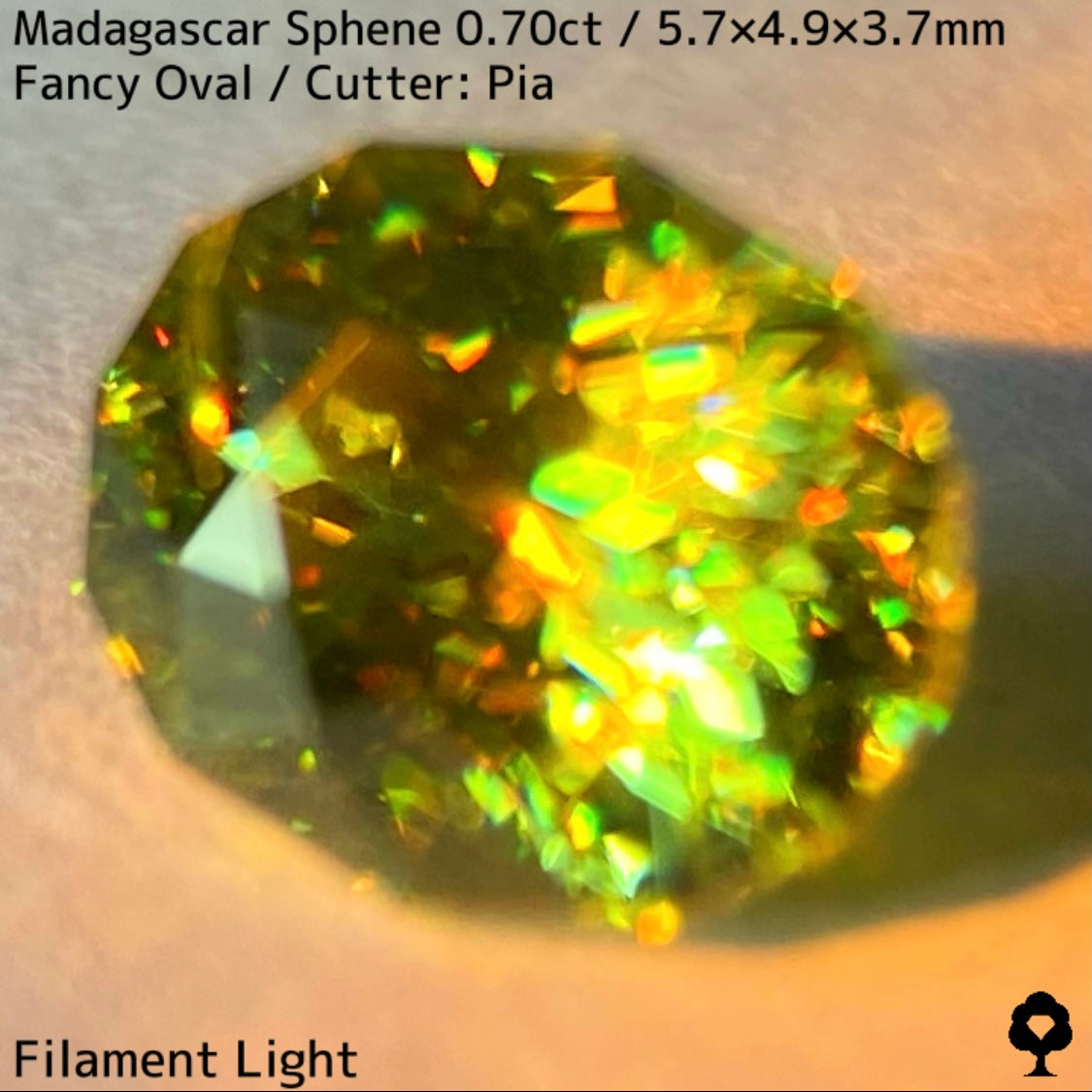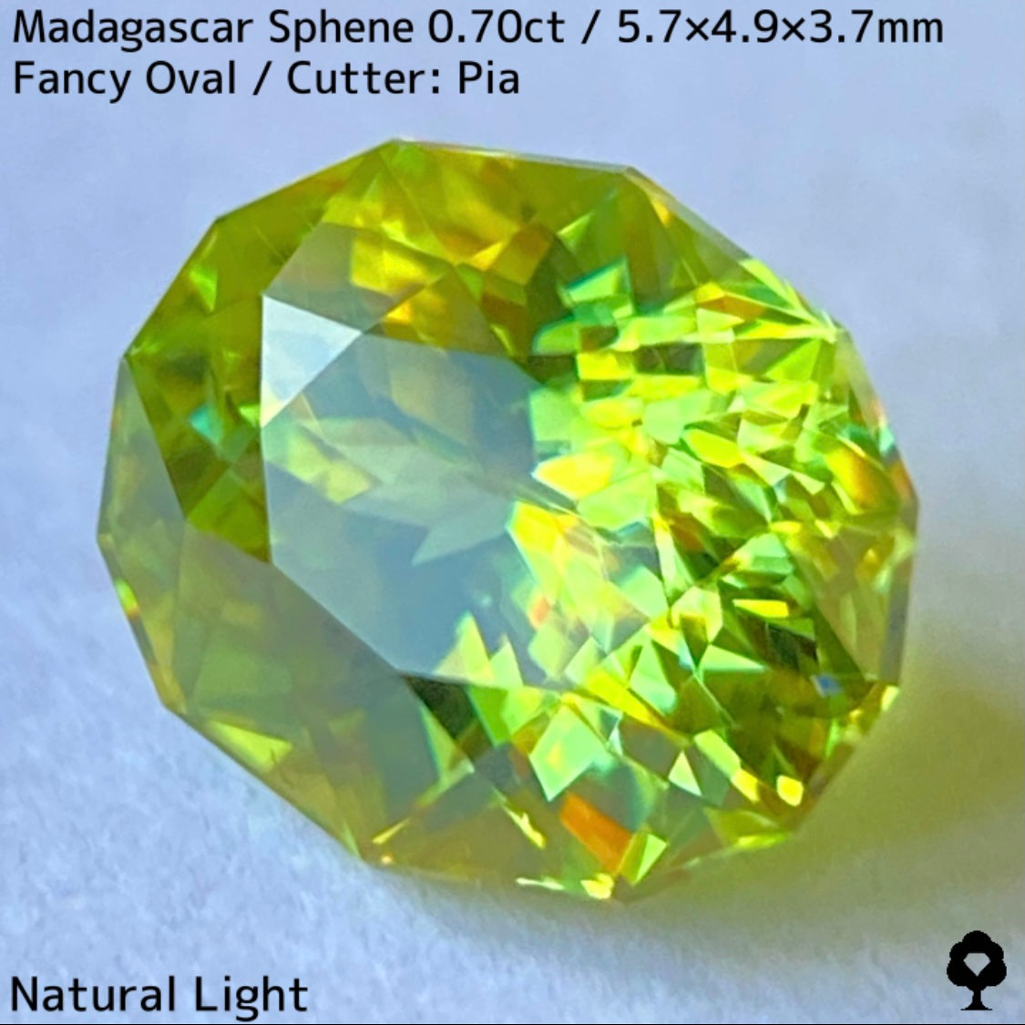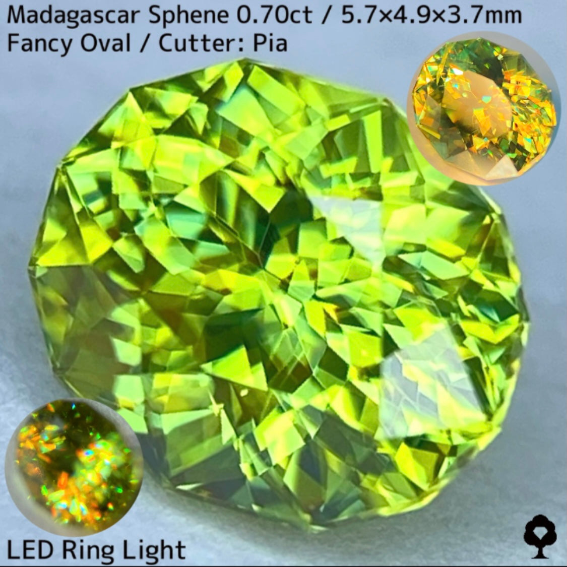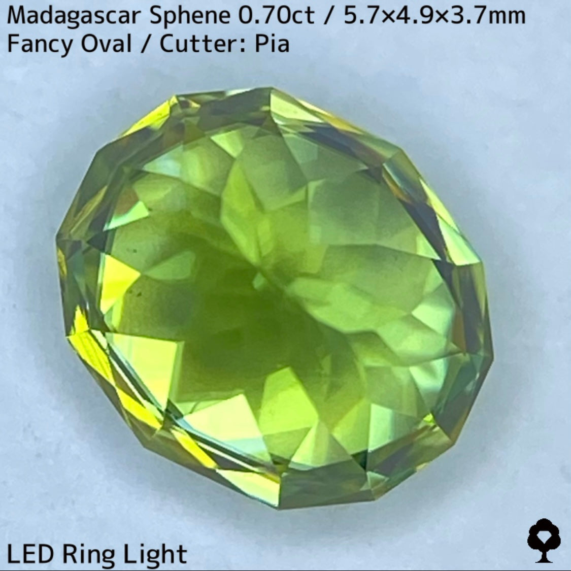 GTJ創業者である大御所によって鍛え上げられたGTJメインカッターピアッちゃんによる抜群のカットとツヤによって、分散度が最大限に引き出されカラフルなファイアーが溢れるGTJ看板石のひとつであるスフェーンですが、こちらのマダガスカル産スフェーンはマダガスカル産の中でも価値の高いグリーンで、透明度抜群のハイレベルな美結晶が素晴らしい煌めきを放つ作品に仕上がりました。
