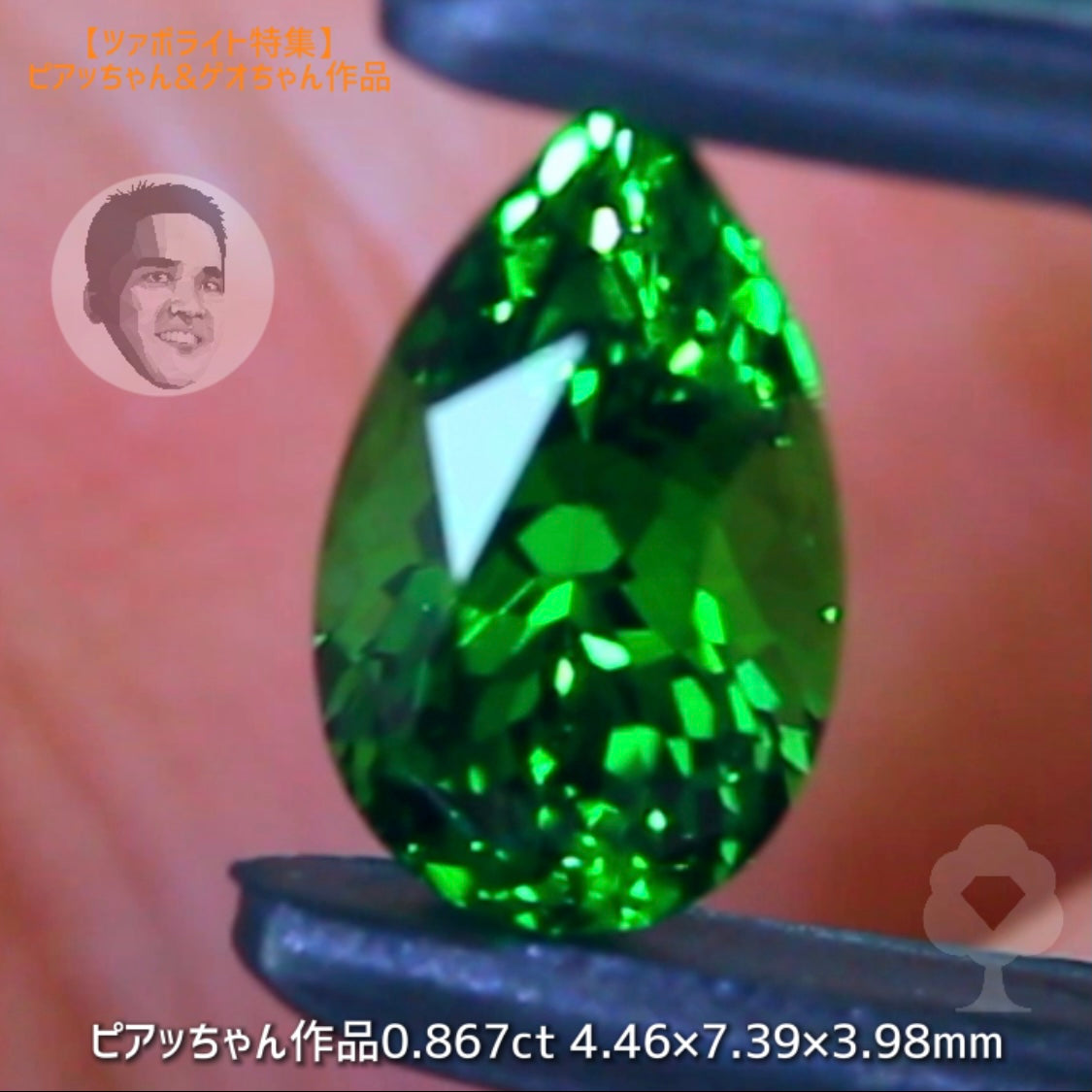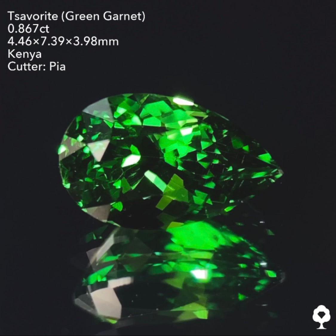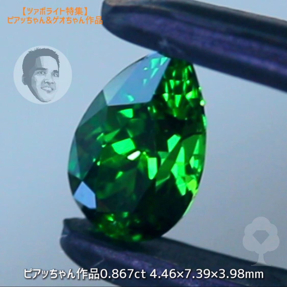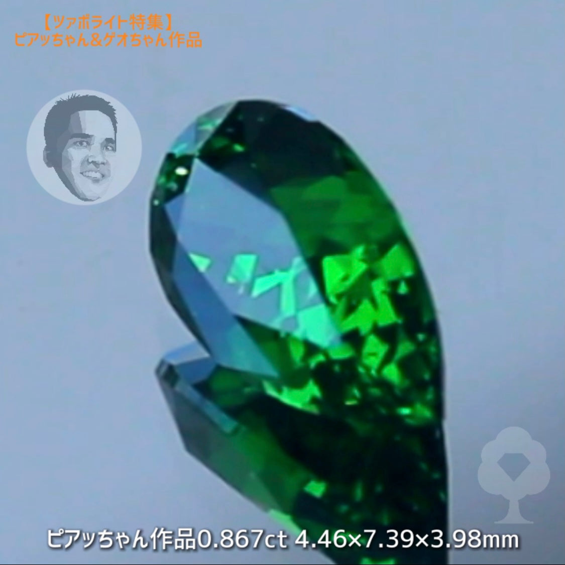 ややロングなペアシェイプのツァボライトは0.867ct、カット職人ピアッちゃんの作品です。