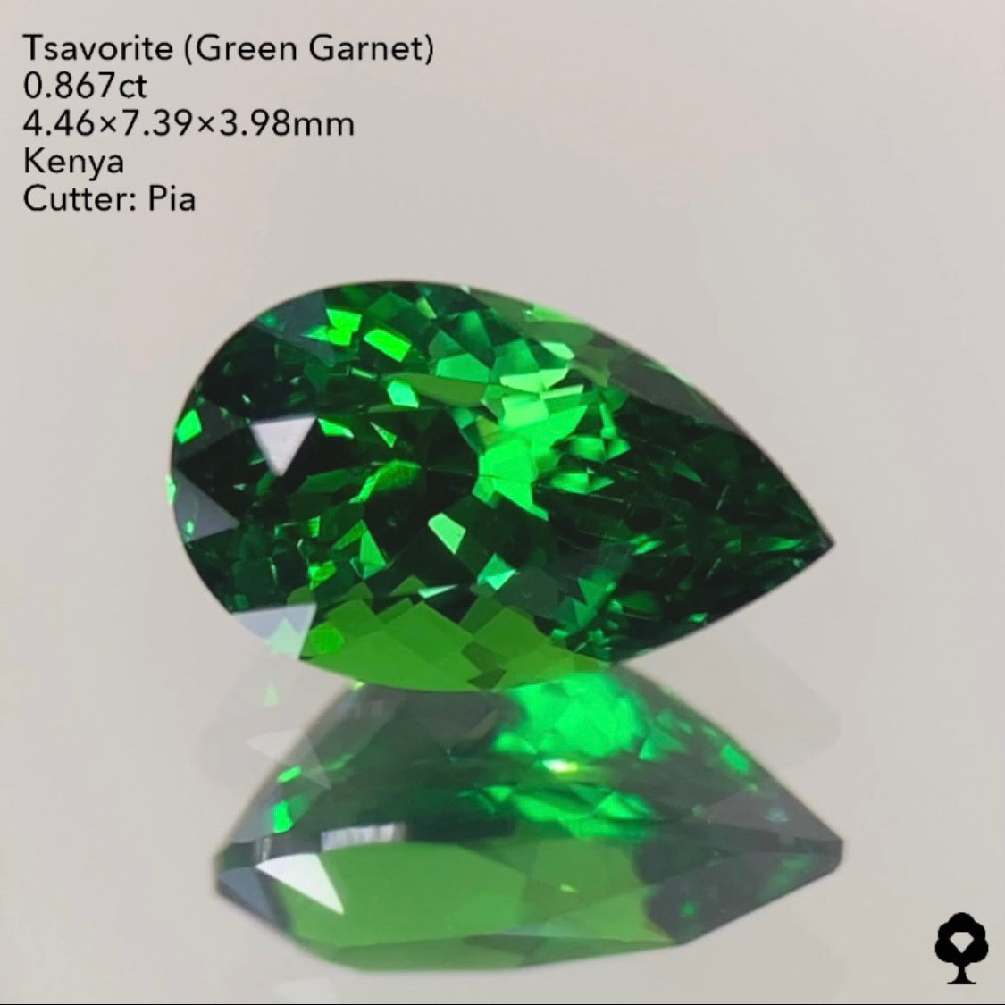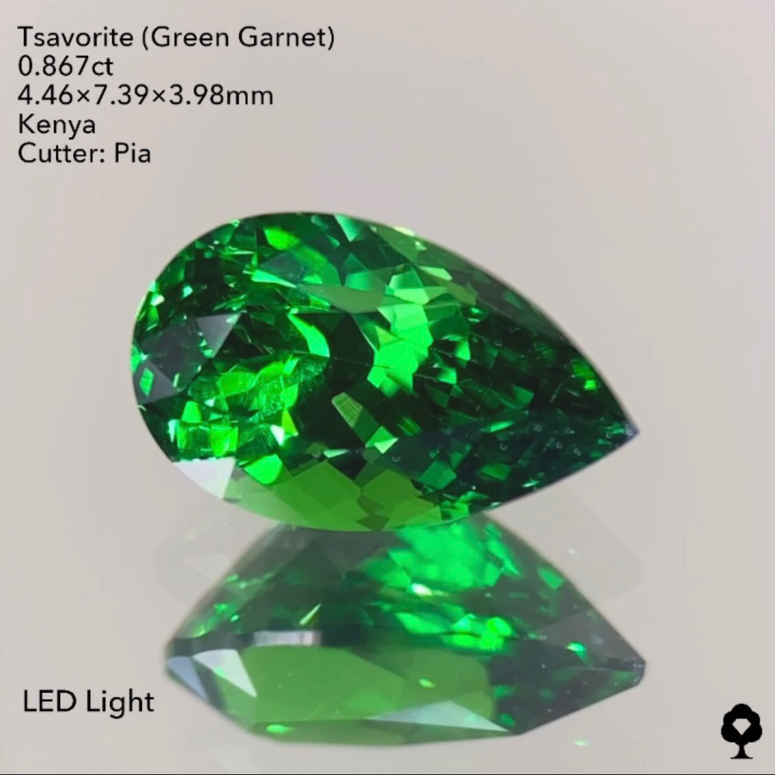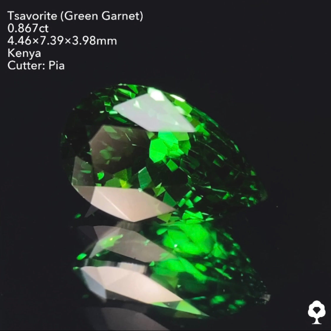 ややロングなペアシェイプのツァボライトは0.867ct、カット職人ピアッちゃんの作品です。