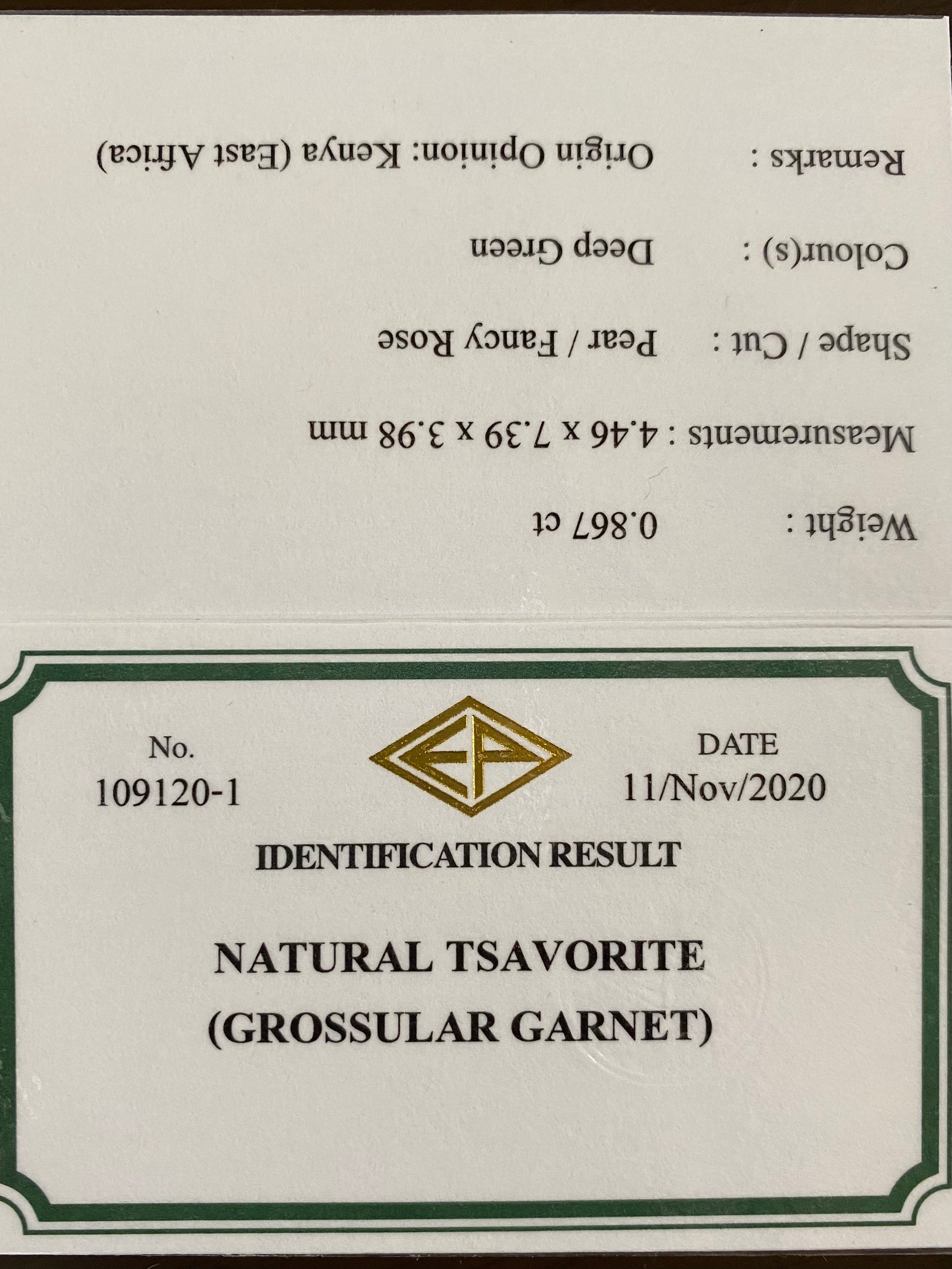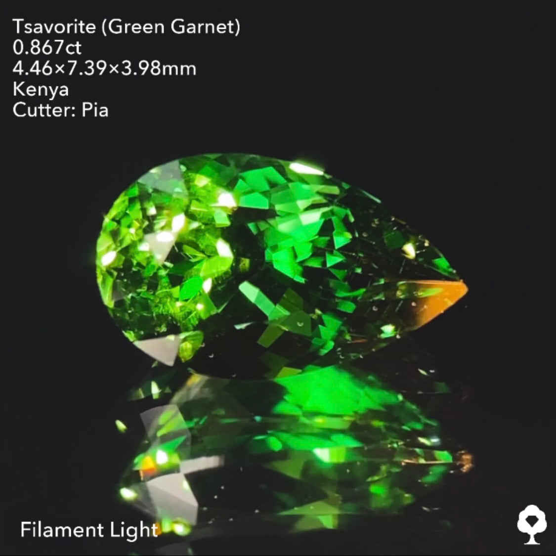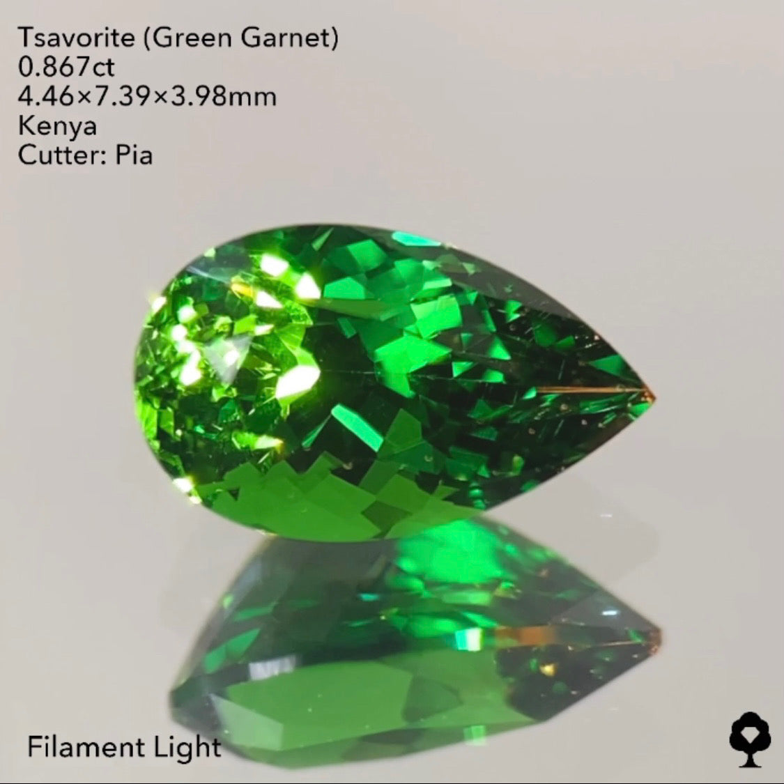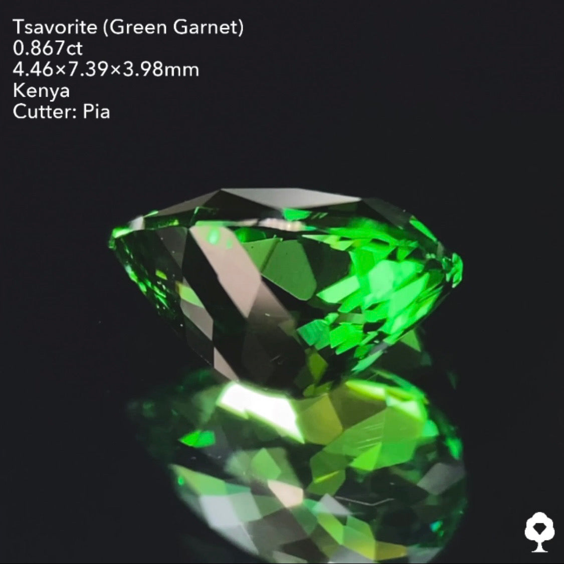 ややロングなペアシェイプのツァボライトは0.867ct、カット職人ピアッちゃんの作品です。